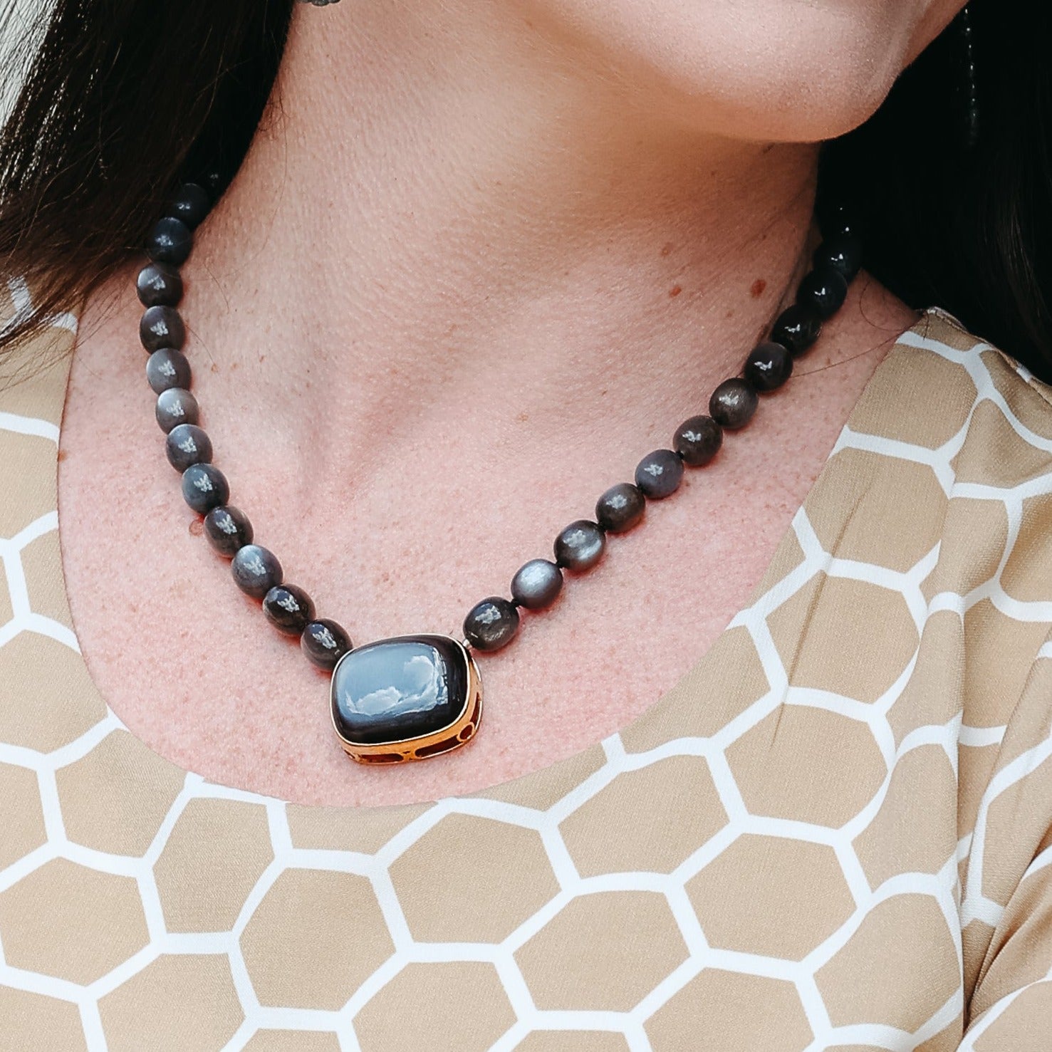 Shown with, Sold Out, Snow flaked Druzy Clasp, and Freshwater Peach Pearl Clasp. Please contact us for more information.