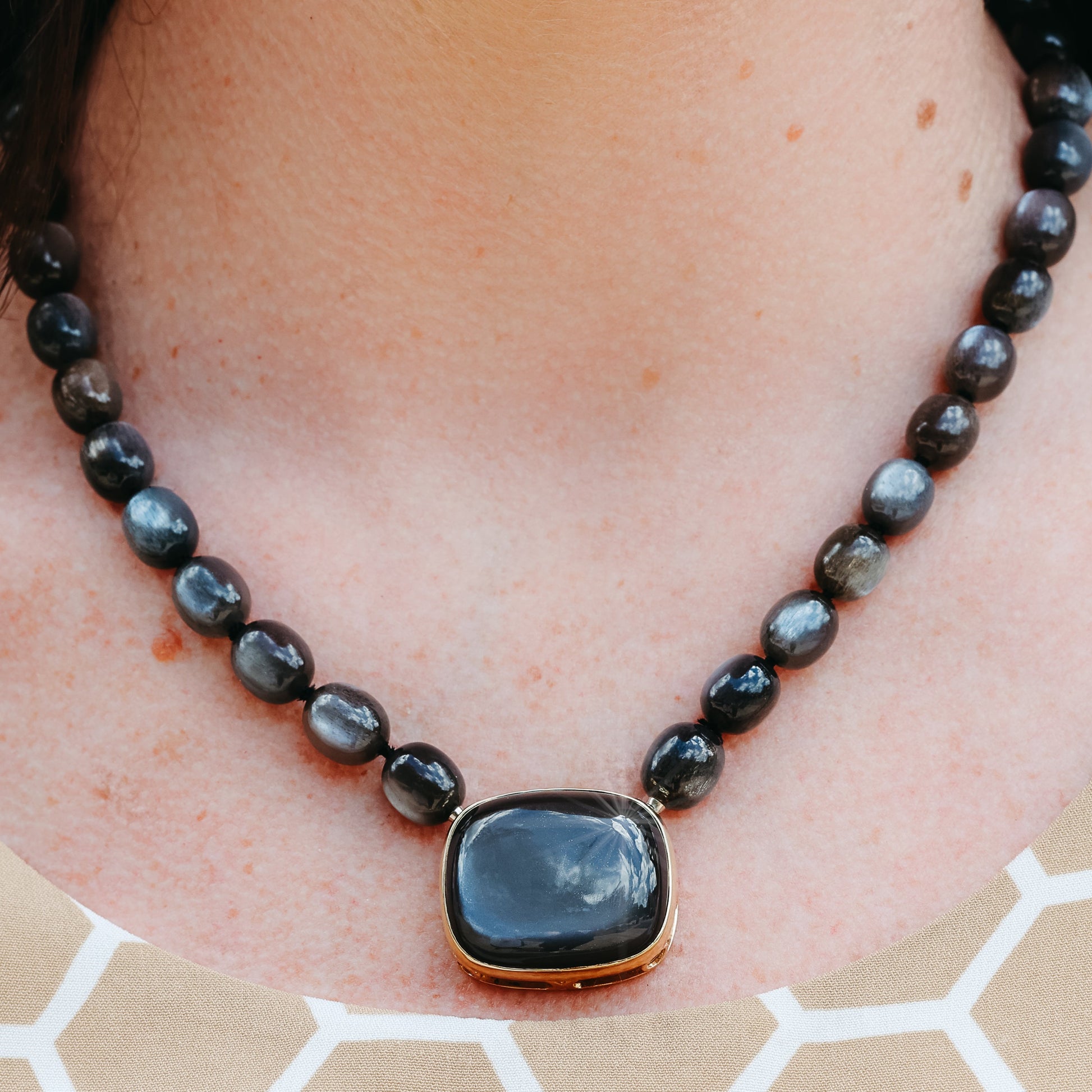 A grey moonstone strand with 18k white nittel parts and self clasp. Designed and made by llyn strong.