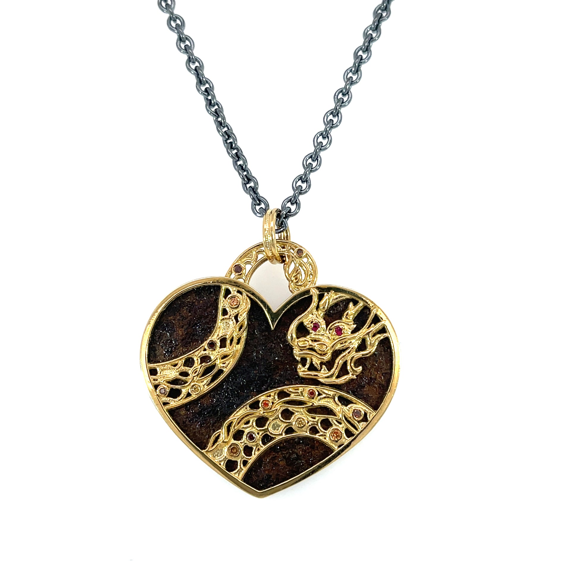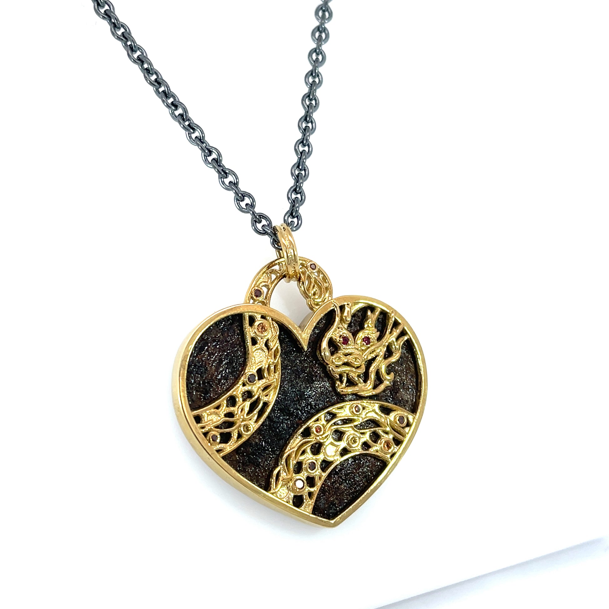 An 18k yellow gold "2024 Unbreakable Heart" featuring a skeletal outline of a dragon, heart shaped rusted iron, 0.08 total carat weight red diamonds, 0.07 total carat weight orange sapphires, and 0.02 total carat weight rubies on a 20 inch 2.8mm oxidized sterling silver chain. This necklace was custom designed and made by llyn strong and Sydney Strong.