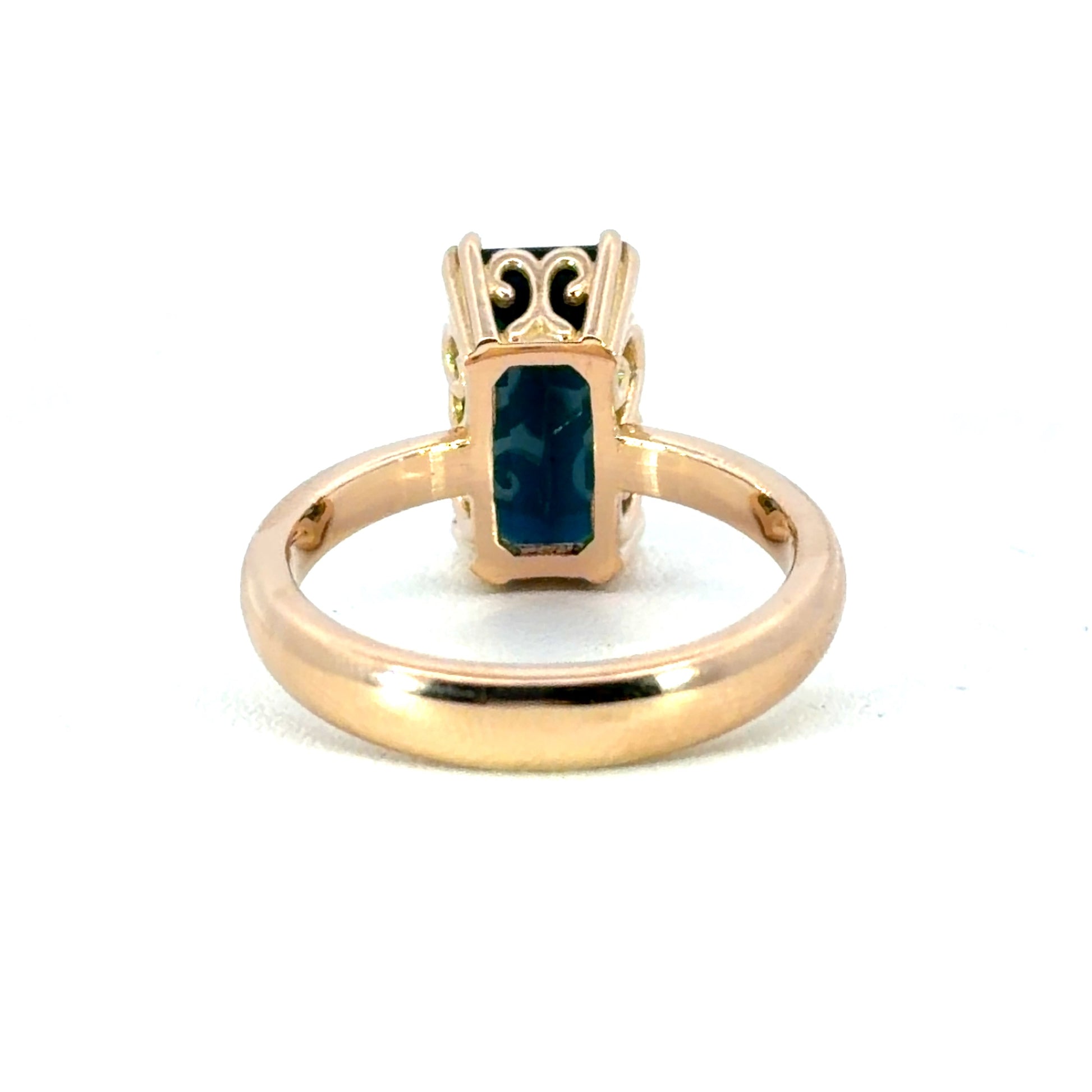 An octagon cut 3.93ct indicolite tourmaline scroll ring with 18k rose gold. Stone is 6.45 x 12.16mm. This ring was made and designed by llyn strong.