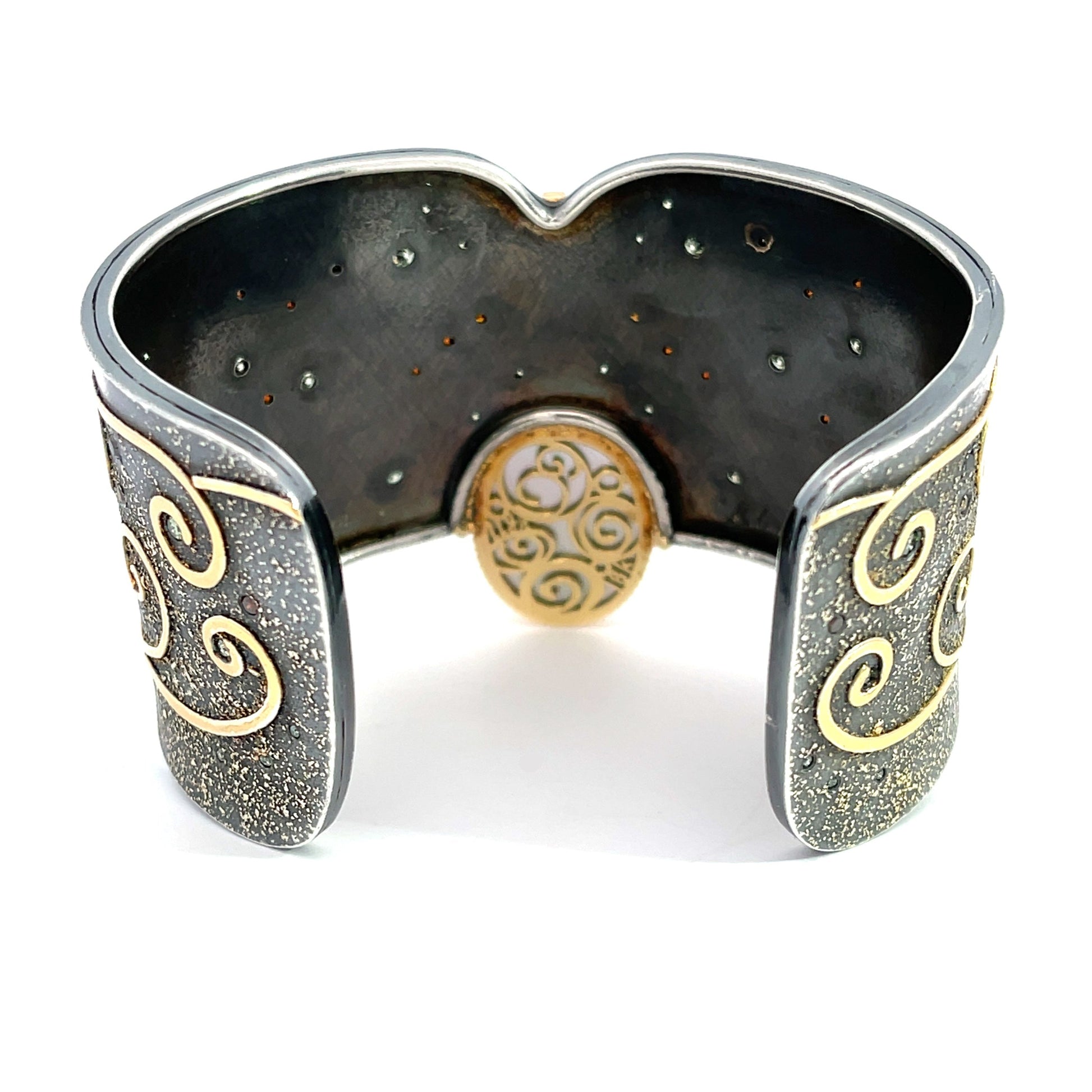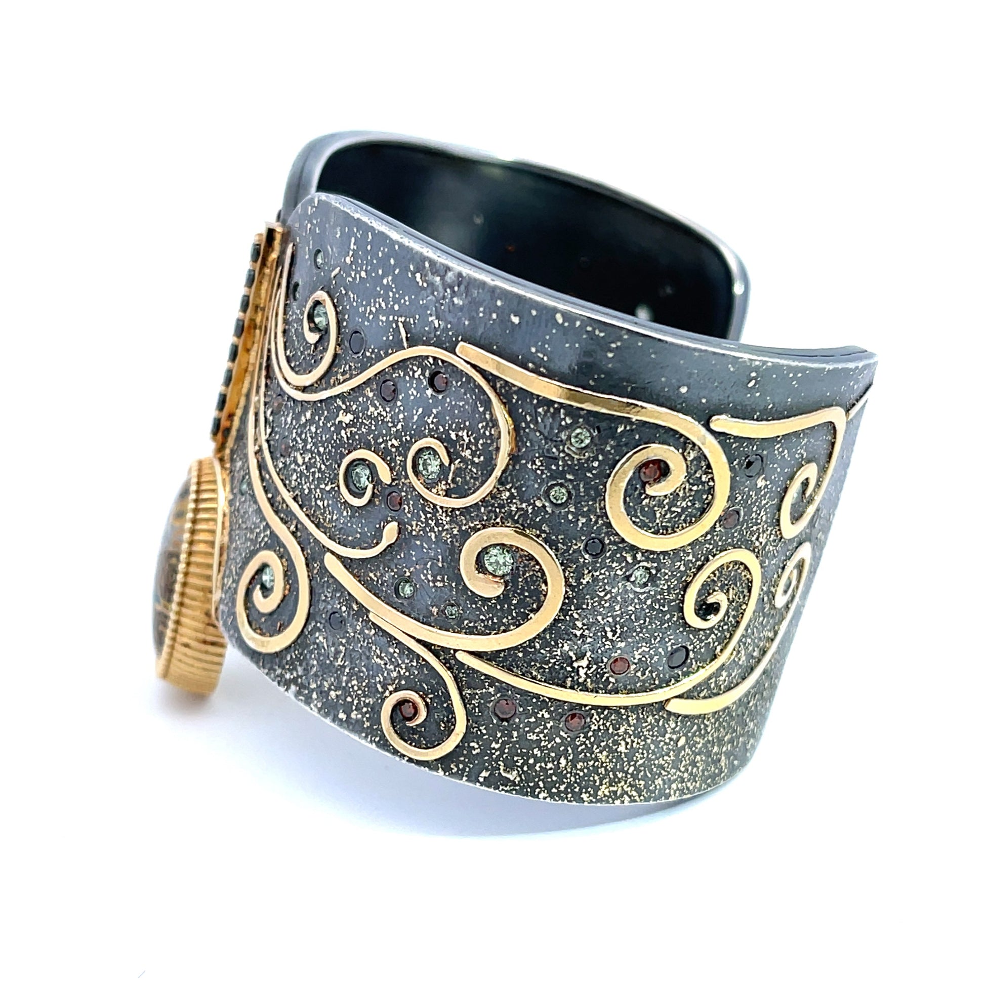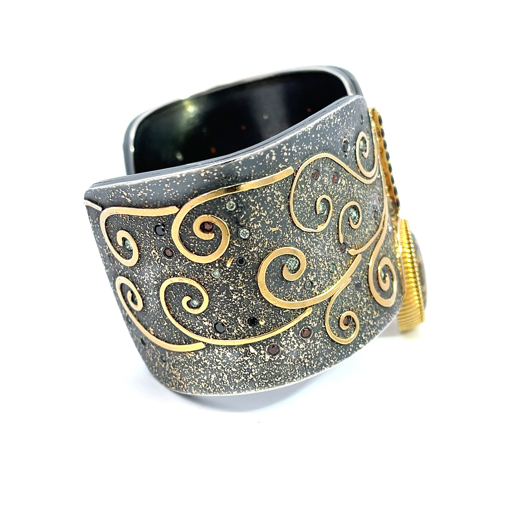 A "Klimtastic" Cuff with an oval carved stone by Erwin Pauley gold leaf enamel & rock crystal set in sterling silver with 24K-22K-18K and 1.74ct. of mint green, cognac and black diamonds. the cuff was designed and made by llyn strong.
