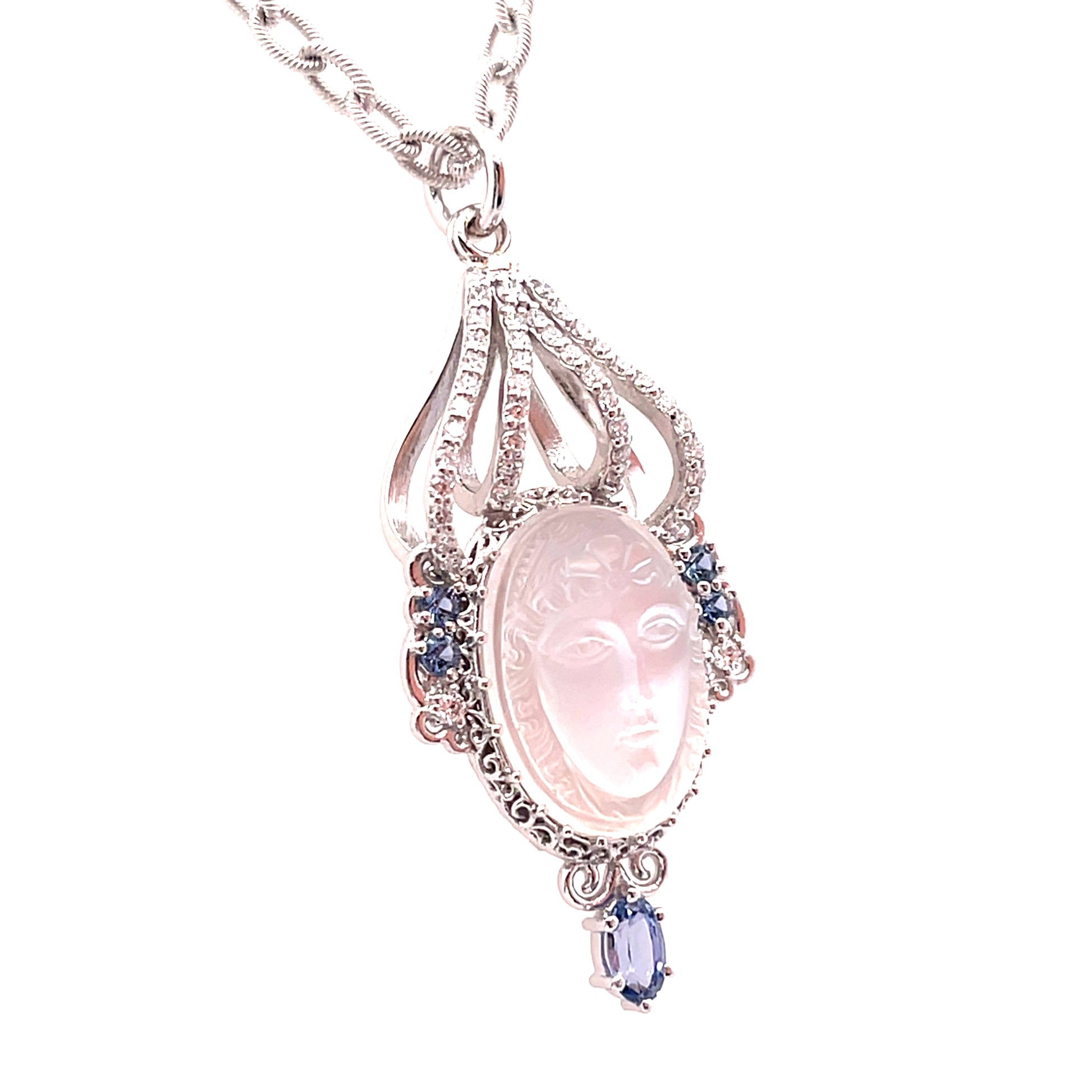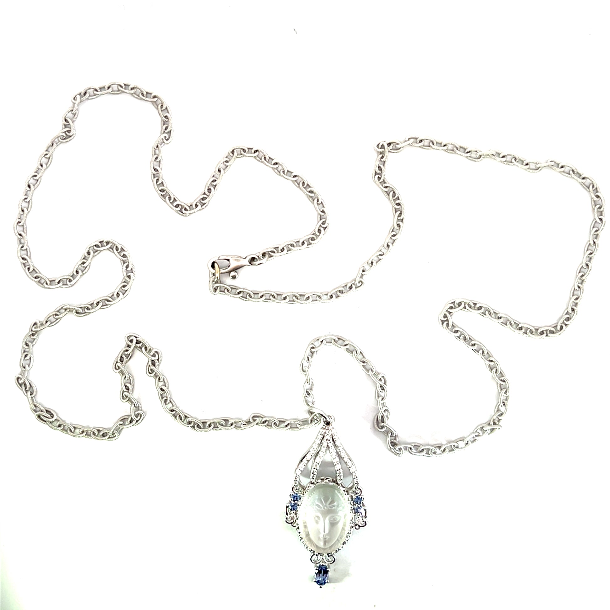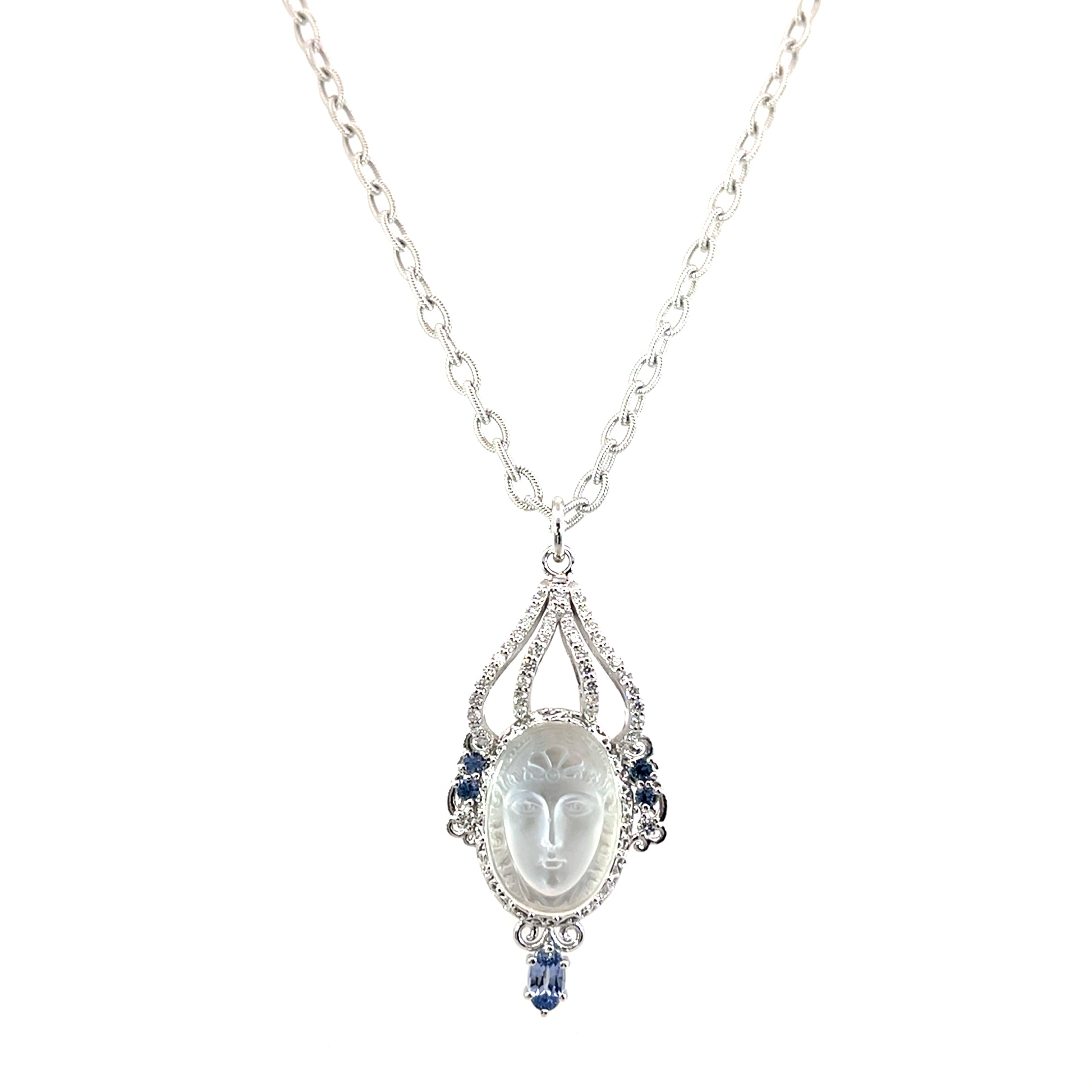 A platinum and 18k white gold pendant featuring an oval 16.1mm X 11.25mm carved moonstone, 0.28 total carat weight round full cut white diamonds F color VS clarity 0.14 total carat weight round natural Yogo blue sapphires, 0.33 total carat weight oval faceted natural blue sapphires. Pendant only. This pendant was made and designed by llyn strong.