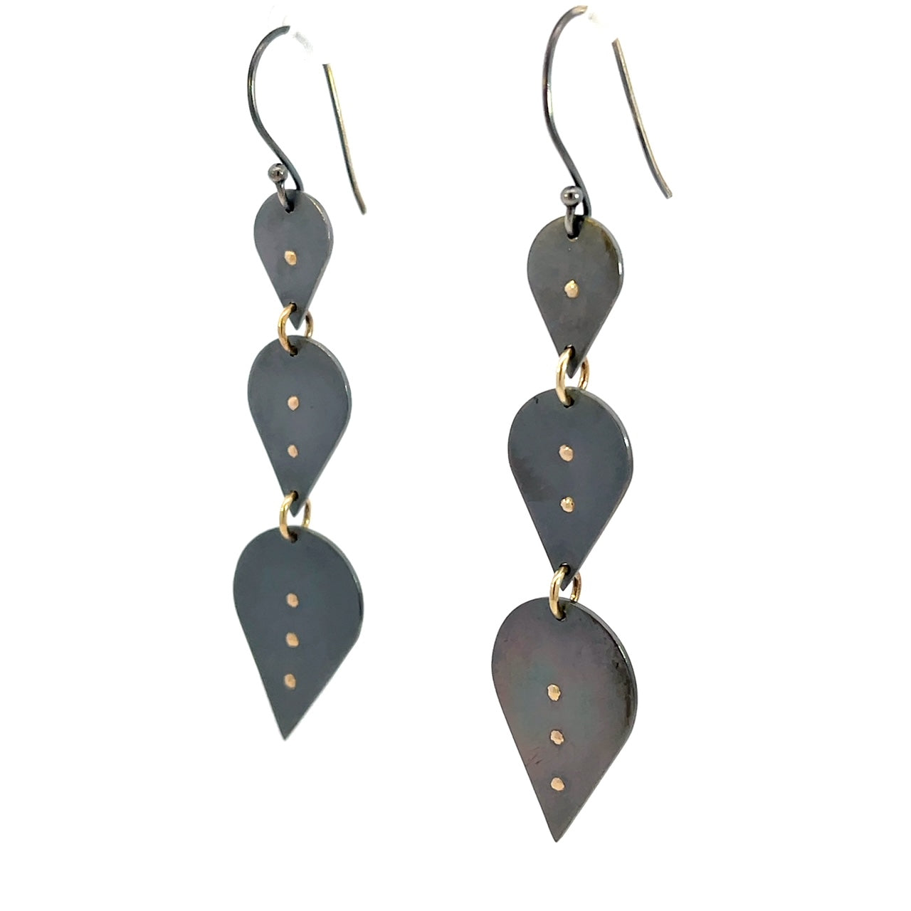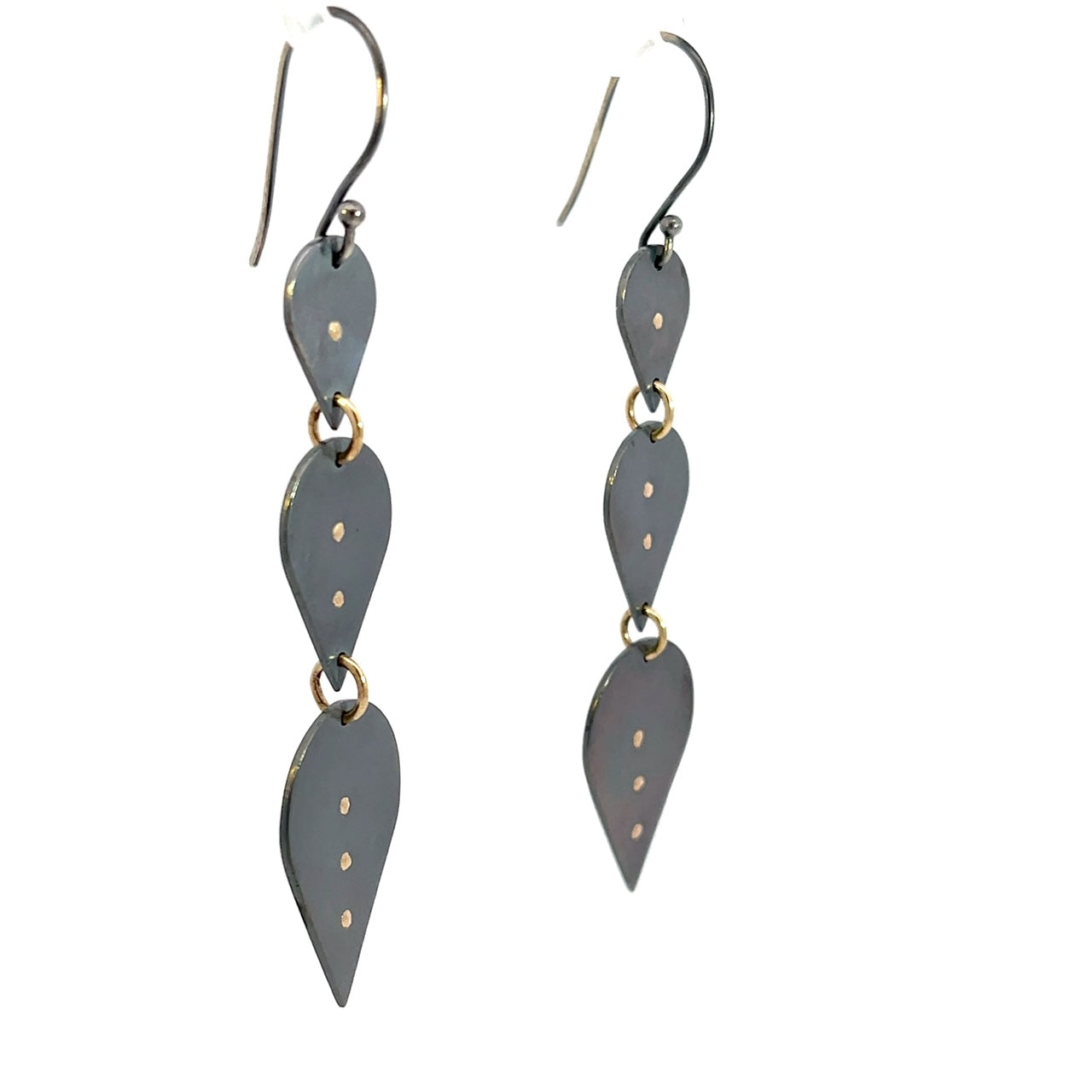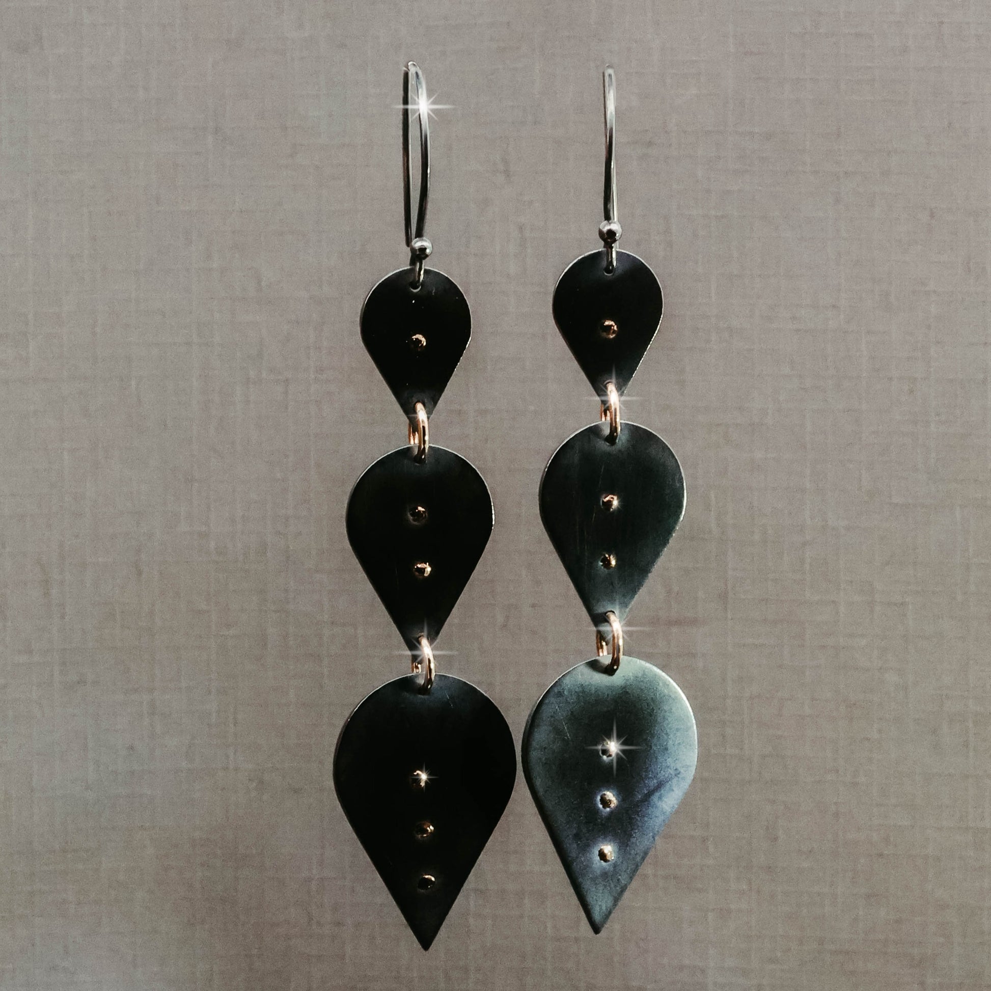 Bold lines. Thoughtful movement. Artful contrast. These gold teardrop dangle earrings are a sculptural play in proportion and texture, crafted for the wearer who leans toward dramatic, elegant detail. Made and designed by Faron Justice for llyn strong fine art jewelry, these elongated teardrop earrings are anything but subtle. Each pair is forged from oxidized sterling silver and 14k yellow gold, featuring a series of linked, hand-formed teardrop shapes that create a graceful sense of motion from lobe to shoulder.