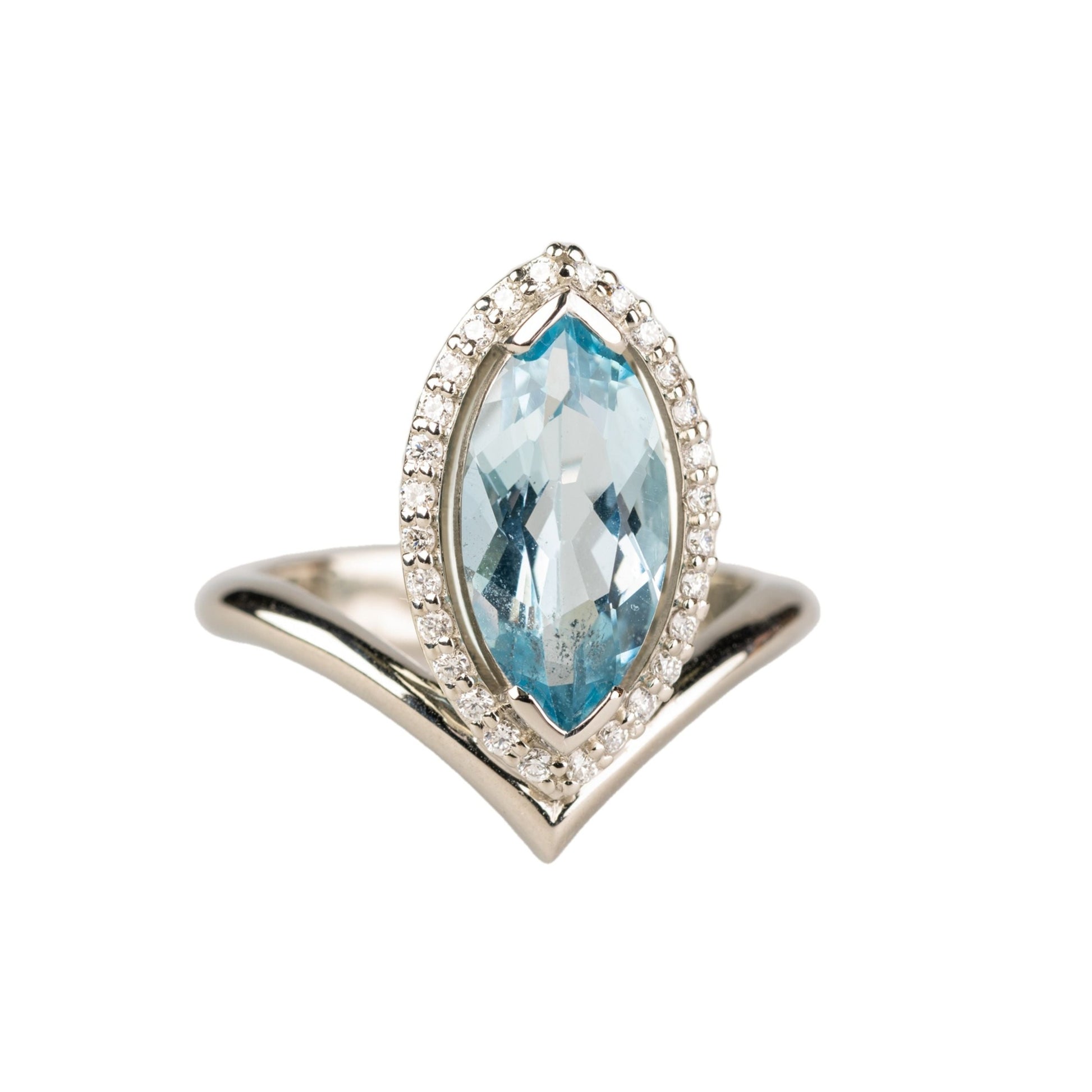 Bold, graceful, and designed to spark conversation—this marquise aquamarine ring by llyn strong blends refined elegance with standout color. Handcrafted in 18k white gold, this custom ring showcases a stunning 2.29-carat aquamarine marquise cut stone, bezel-set to highlight the gem’s elongated shape and icy-blue fire. Surrounding the center stone is a radiant halo of twenty-eight white round diamonds (F color, VS clarity), each precisely set to enhance the ring’s luminosity and overall presence.