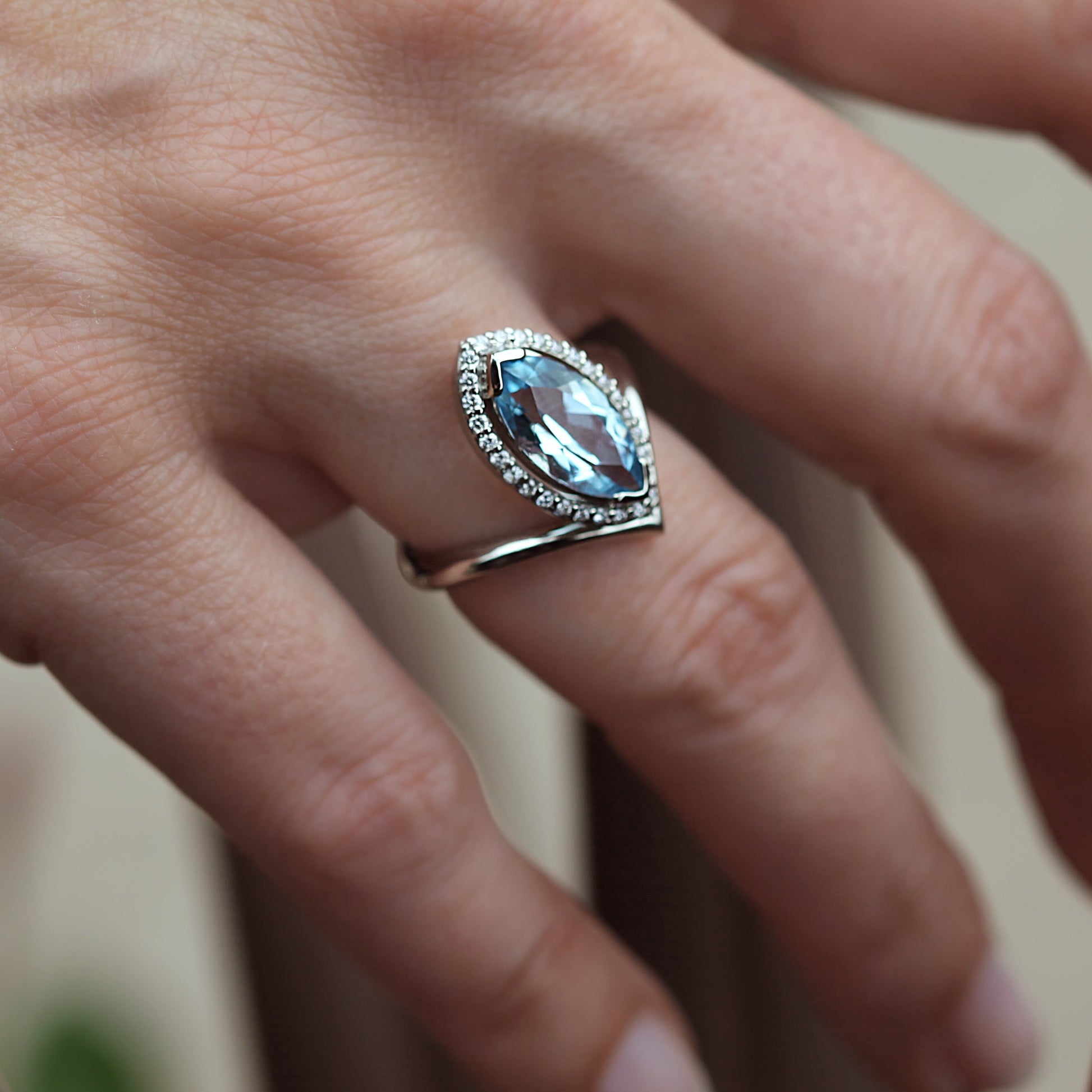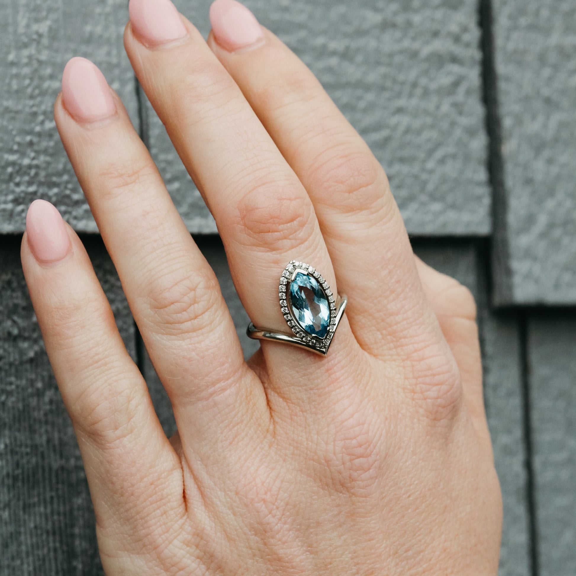 This piece can inspire your own one-of-a-kind design. Many of our clients bring a vision—or a gemstone—and collaborate with us to create custom made aquamarine rings that honor milestones, engagements, or personal symbols. If you’re interested in designing your own aquamarine ring marquise style, reach out to our all-female team of artists and gem experts. Every ring we make is shaped by your story, your preferences, and your values.