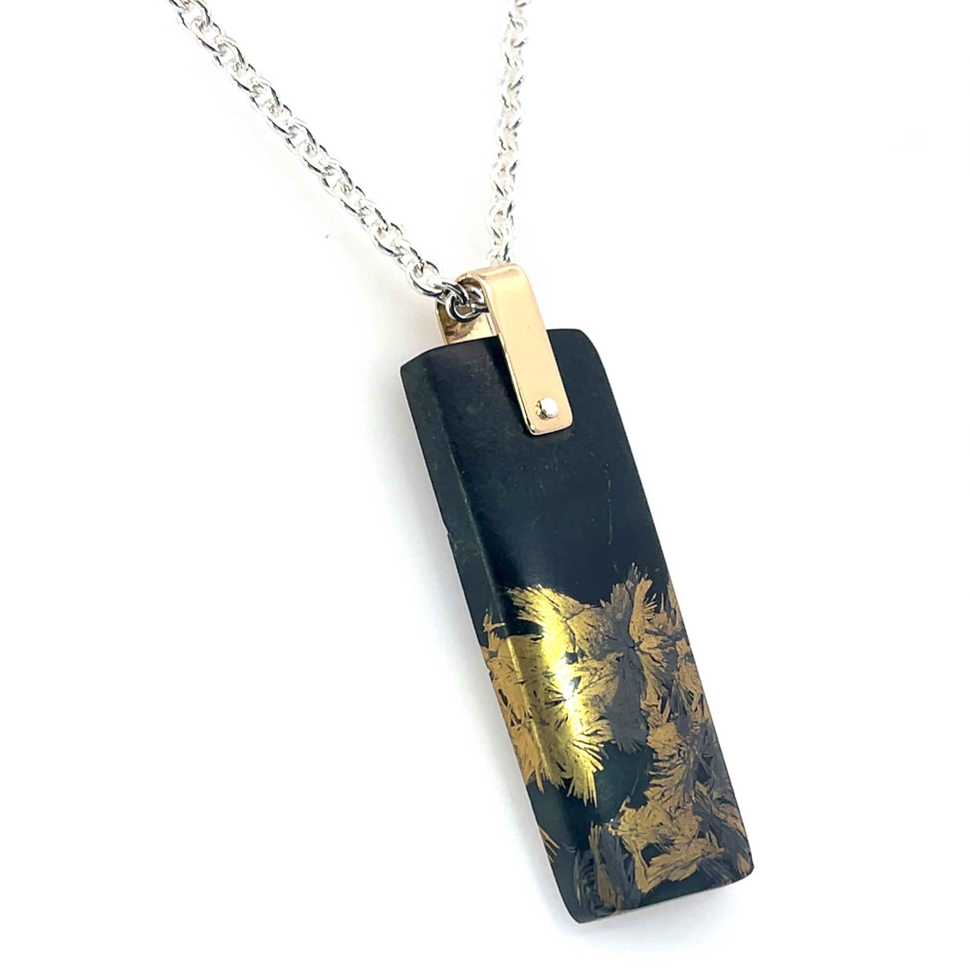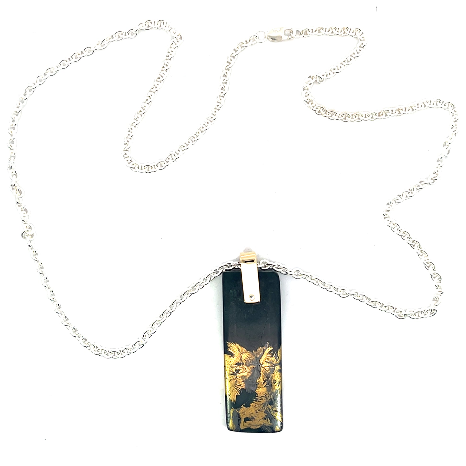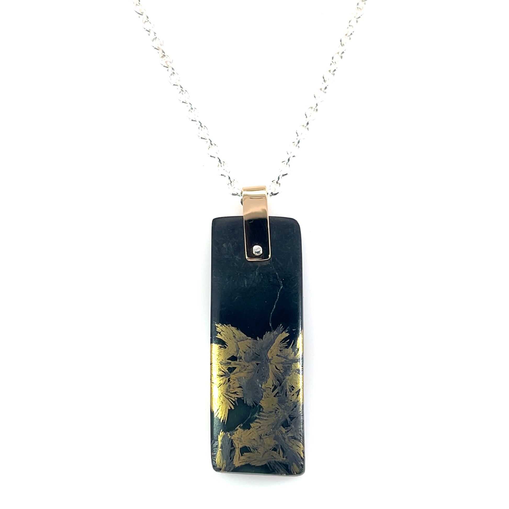 The deep green hue of jade has long symbolized power, protection, and prosperity. Paired with black magnetite, believed by some to enhance balance and focus, this piece invites both personal meaning and bold style. The gold setting brings warmth and refinement to the natural cool tones of the stones, while the sterling silver chain ensures comfortable, all-day wear.