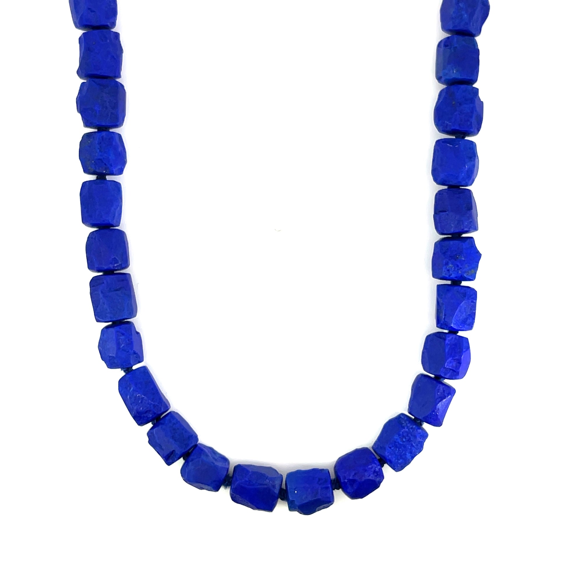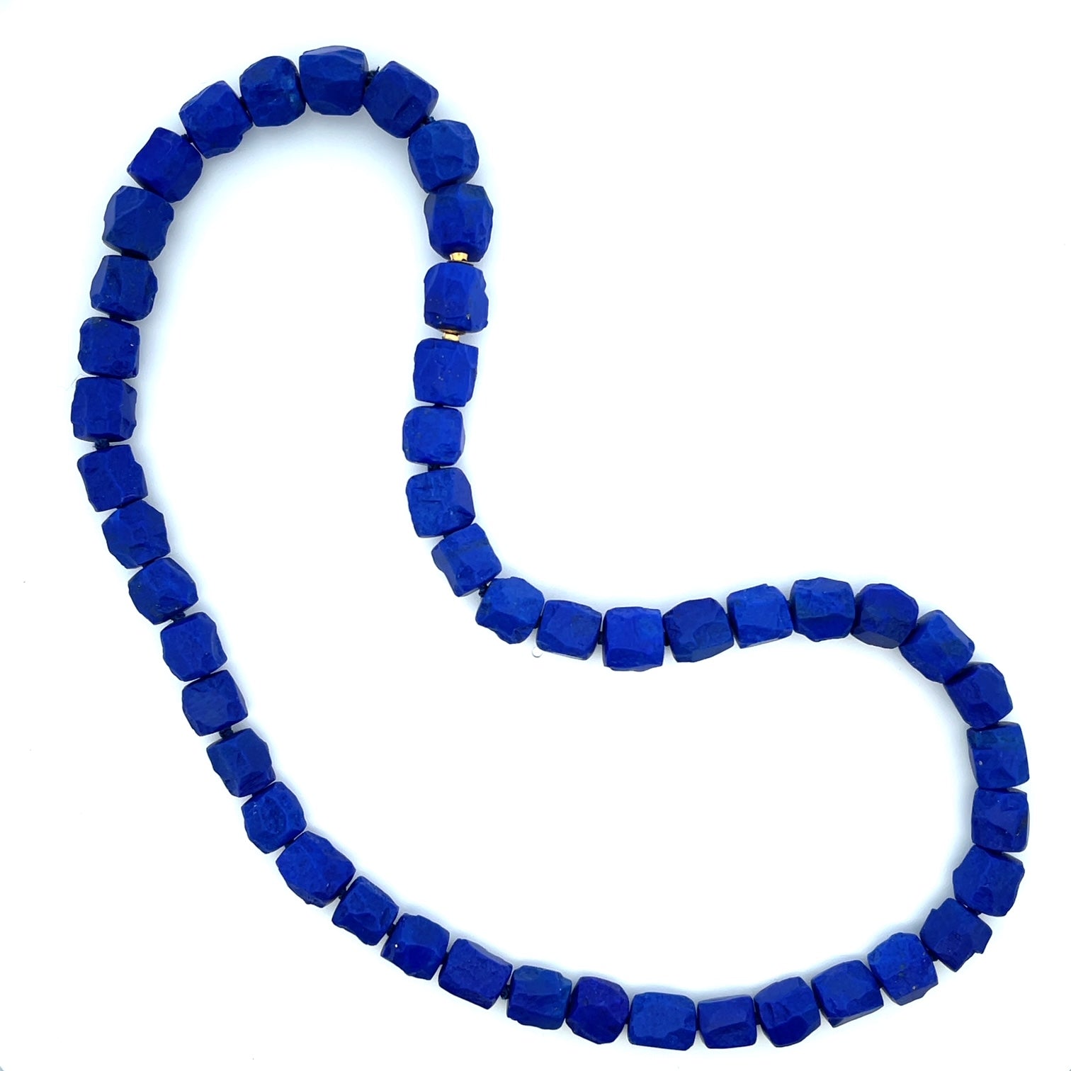 A knotted strand of hammered nugget shaped lapis beads 255 total carat weight with a 18k yellow gold "Modullyn" keys and self-clasp. Made and designed by llyn strong