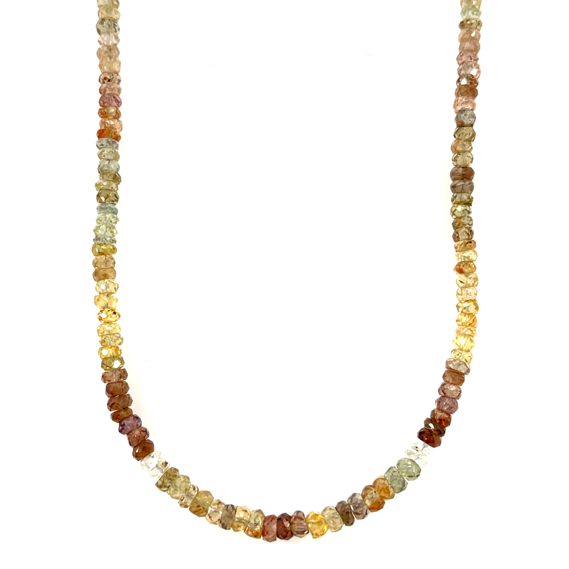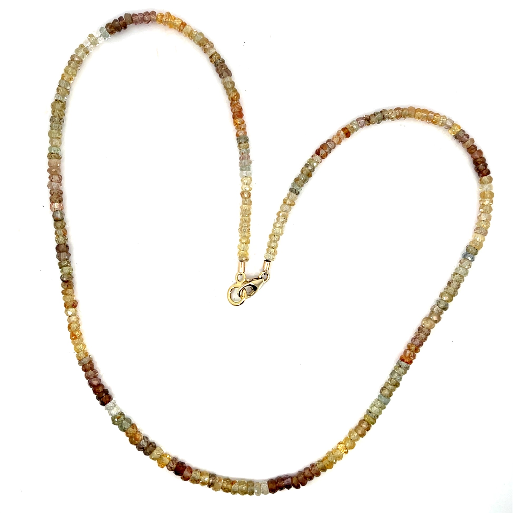 A multicolor brown zircon necklace with a yellow gold clasp. 18" long. This necklace was made and designed by llyn strong.