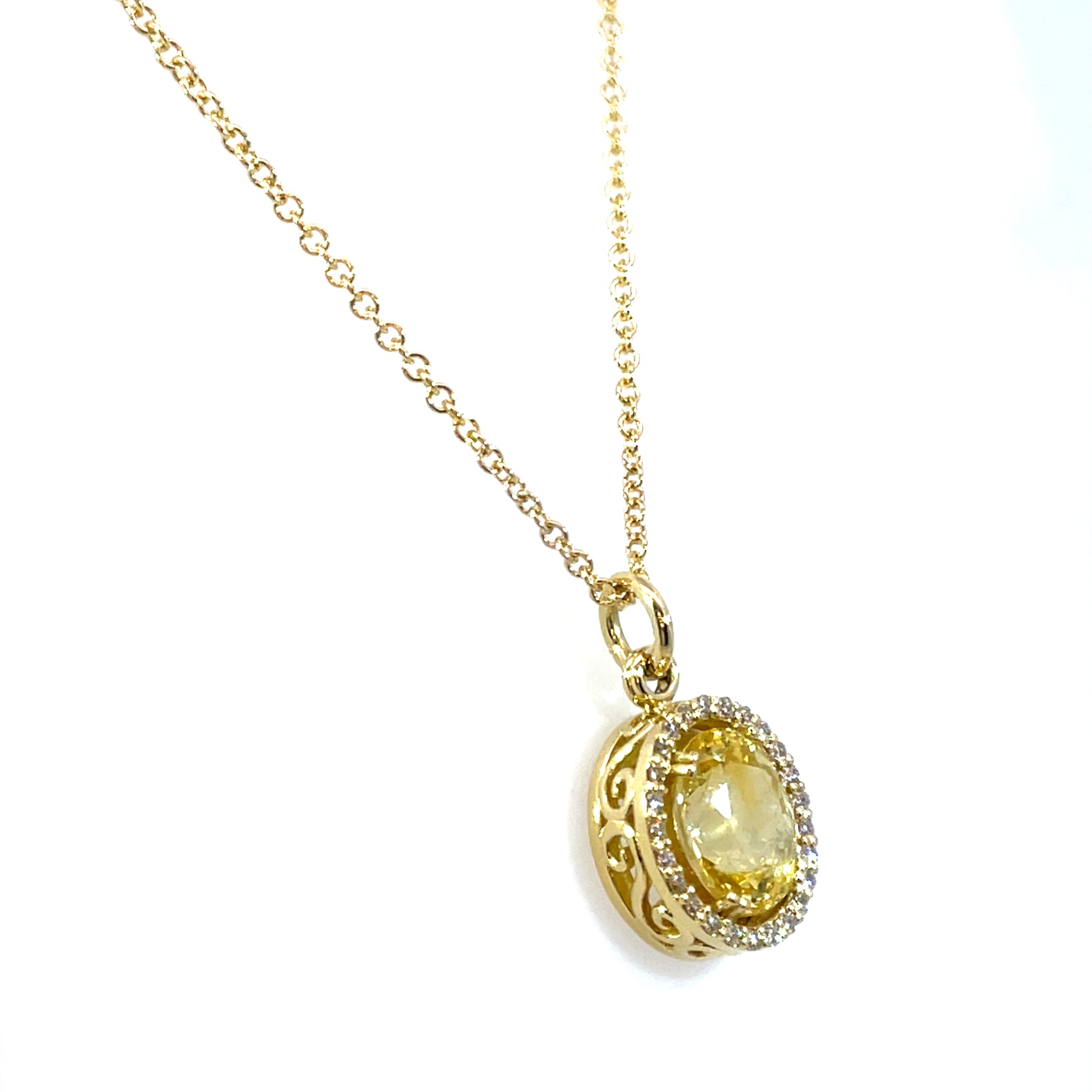 An oval 3.29ct yellow sapphire halo pendant with a 0.16 total carat weight of 1.2mm champagne diamonds set in 18k yellow gold. This necklace was made and designed by llyn strong.