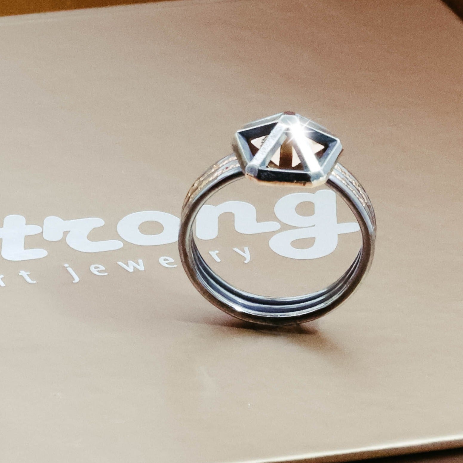 An oxidized sterling silver and 14k gold medium pentagon ring with triple band shank - size 6. This ring was designed and made by Erin Stuart.