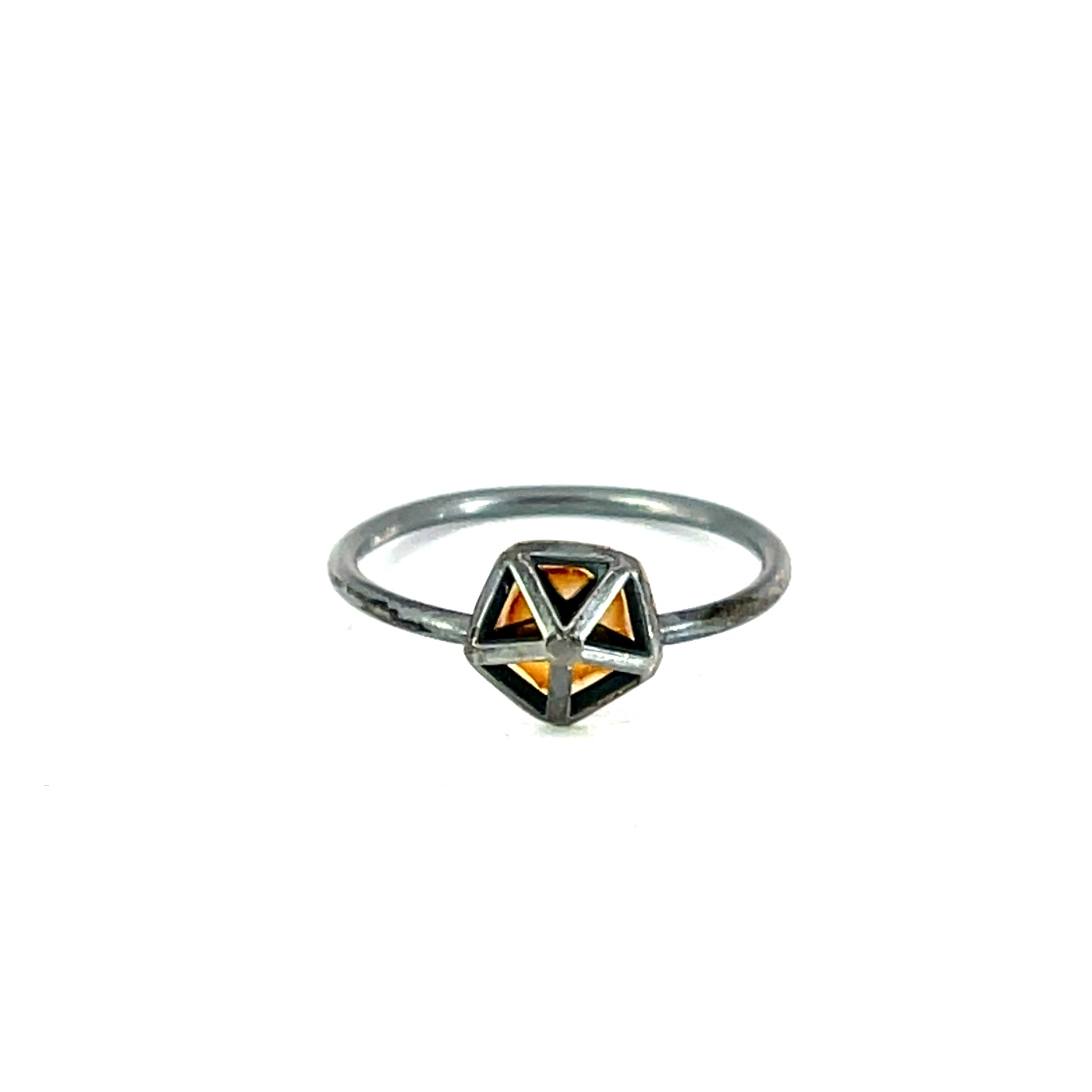 A size 5.5 petite pentagon slim band ring made with oxidized sterling silver and 14k yellow gold. This ring was made and designed by Erin Stuart.