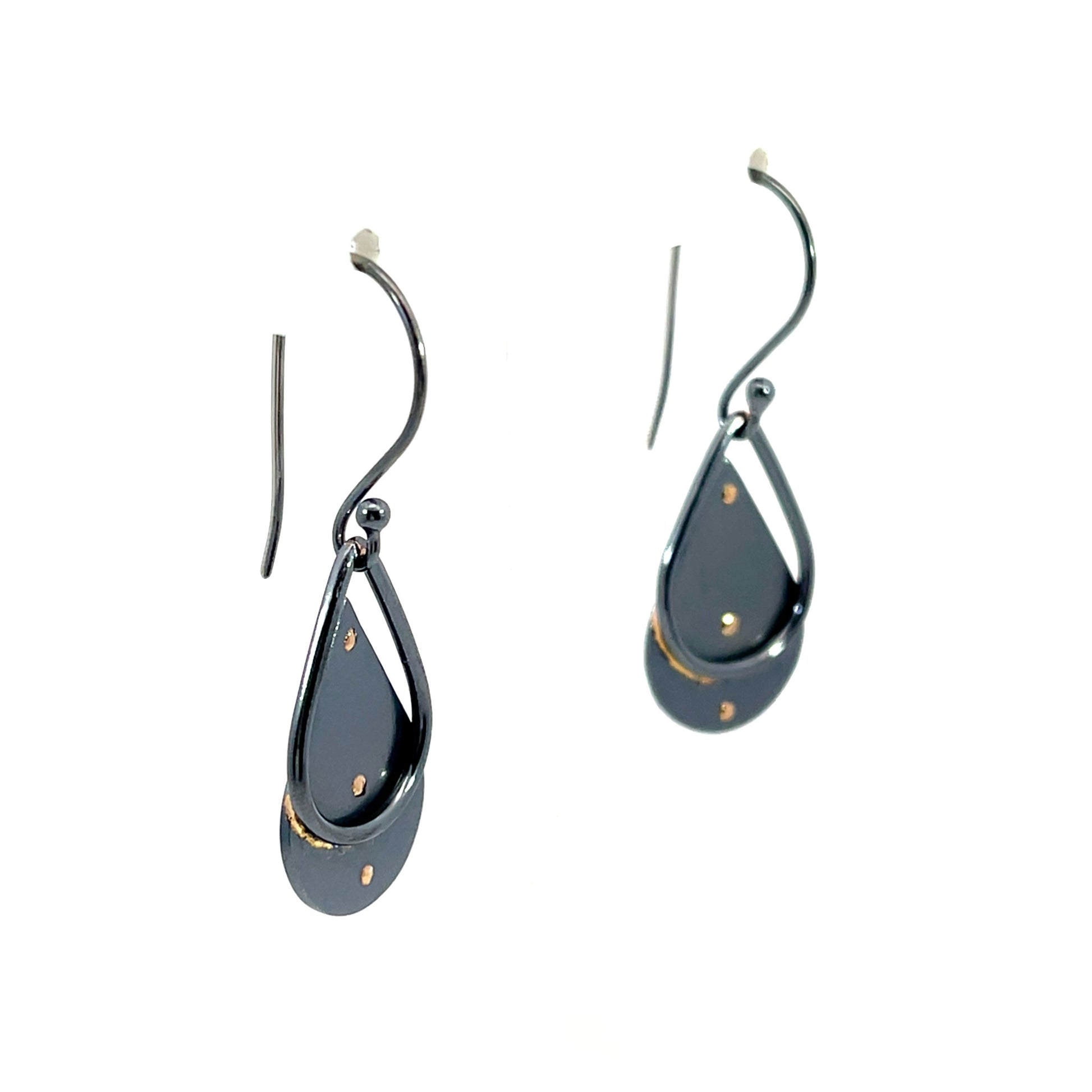 Each 14k gold teardrop dangle earring showcases a graceful silhouette: medium in length with a soft teardrop shape that moves gently with the wearer. The rich patina of the oxidized sterling silver earrings adds texture and dimension, making the gold accents shine even brighter. This intentional juxtaposition of materials and finishes results in a pair of earrings that’s refined, a little rebellious, and totally wearable—day or night.