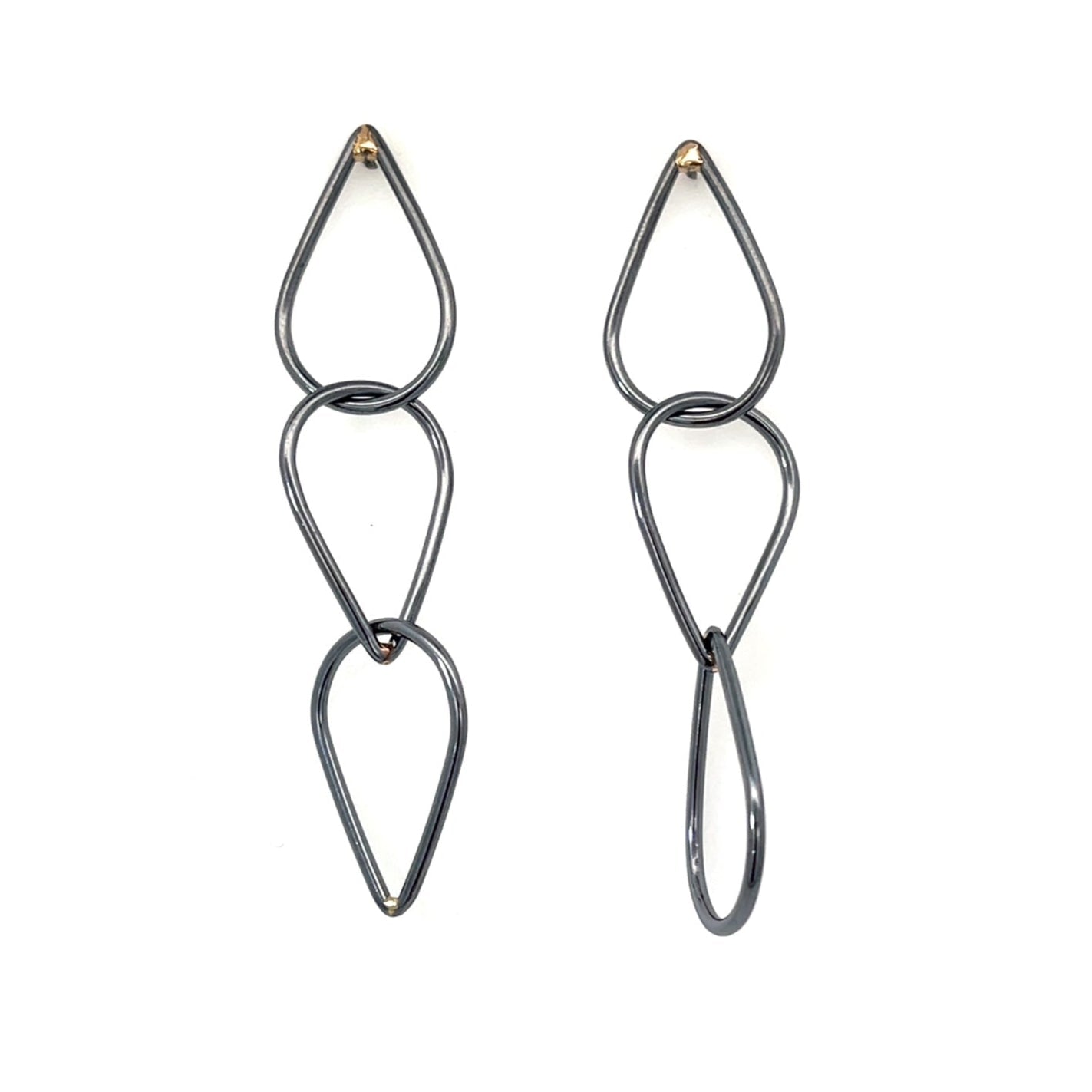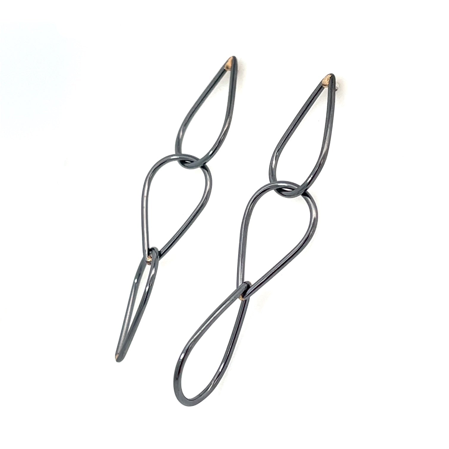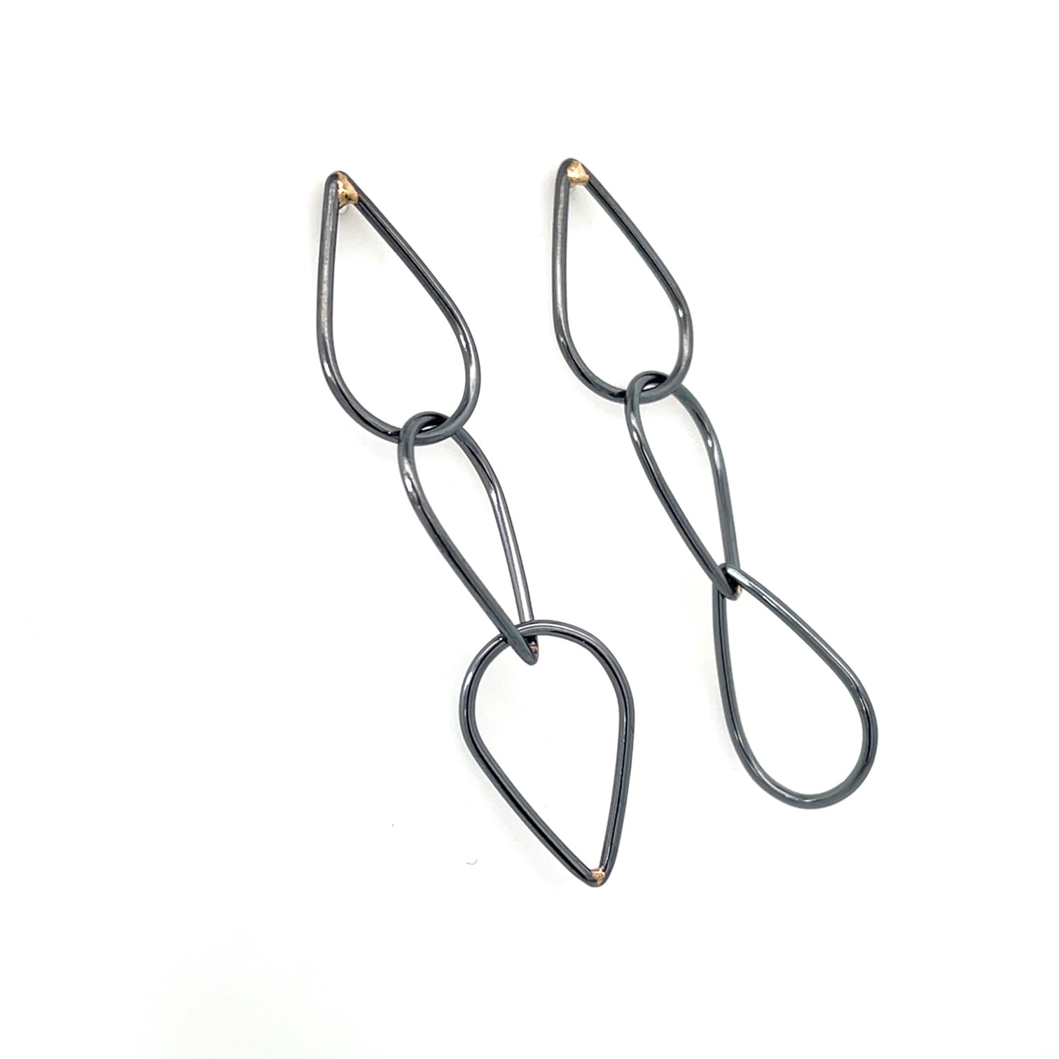 A pair of long oxidized sterling silver and 14k yellow gold teardrop link stud earrings. These earrings were made and designed by Faron Justice.