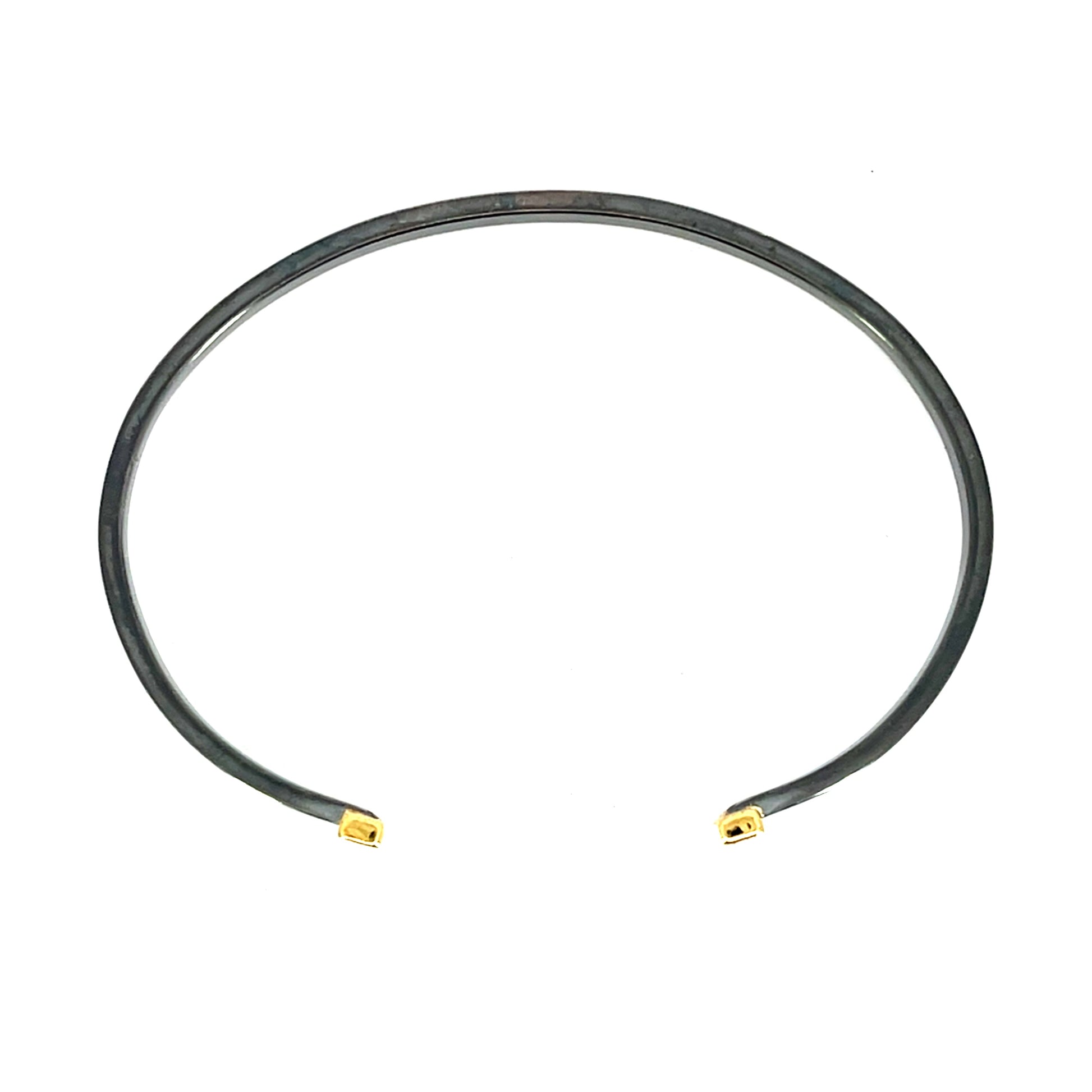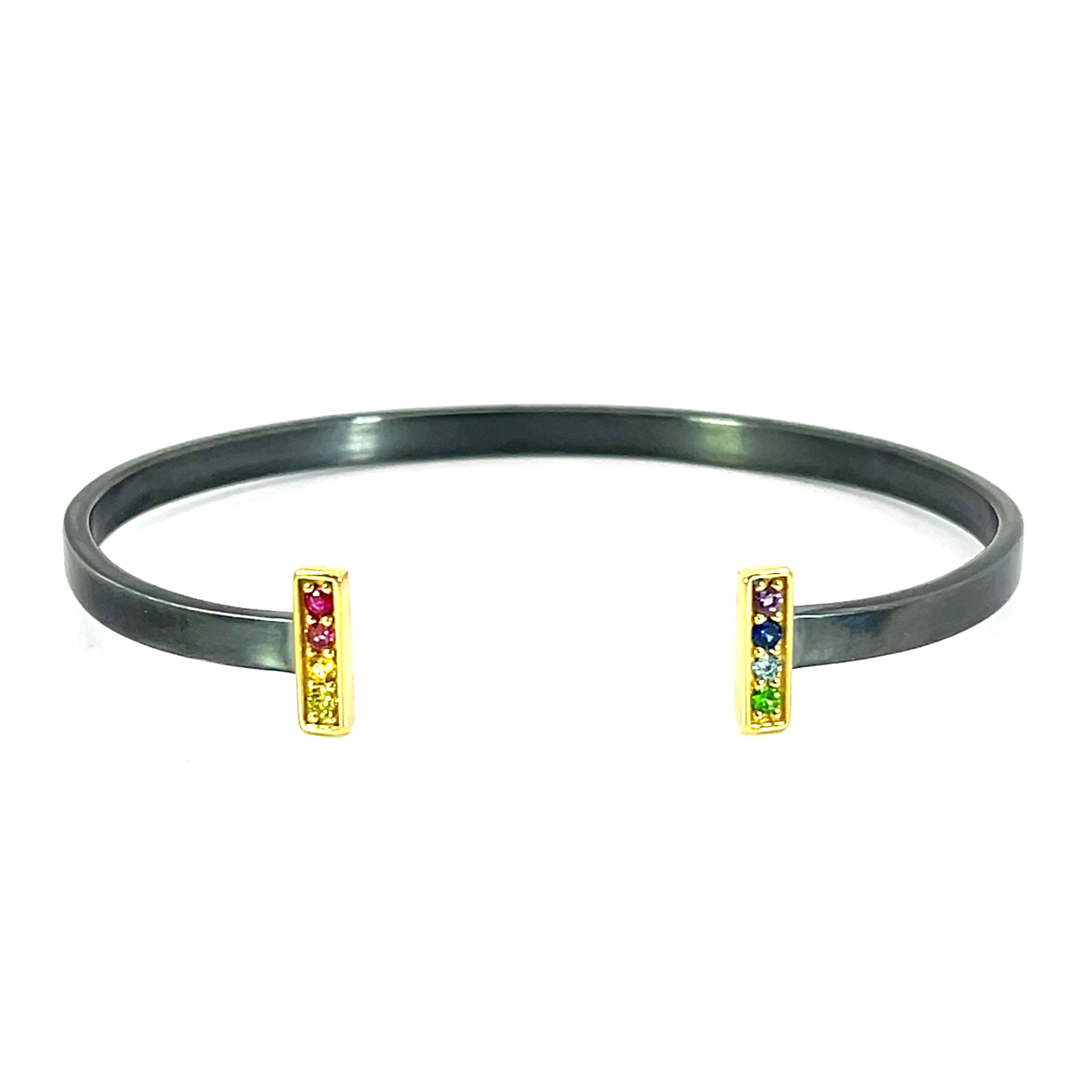 An oxidized sterling silver slim bracelet with two 18k yellow gold mini bars set with 8 2mm stones; ruby, pink sapphire, spessartite garnet, yellow diamond, tsavorite garnet, aqua blue diamond, blue sapphire, and an amethyst, all together totaling 0.31ct. This bracelet was made and designed by Sydney Strong.