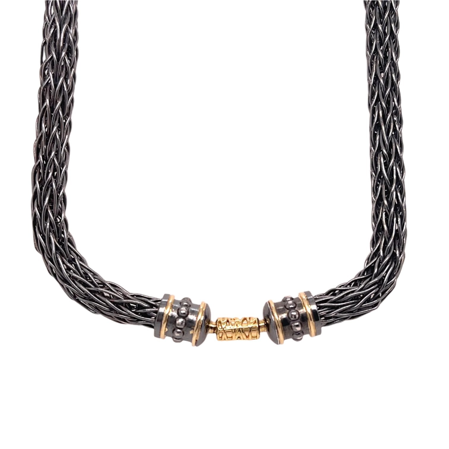 An oxidized sterling silver hand woven Roman Chain necklace with 18k yellow gold accents and "Modullyn" clasp system. This necklace was designed and made by llyn strong.