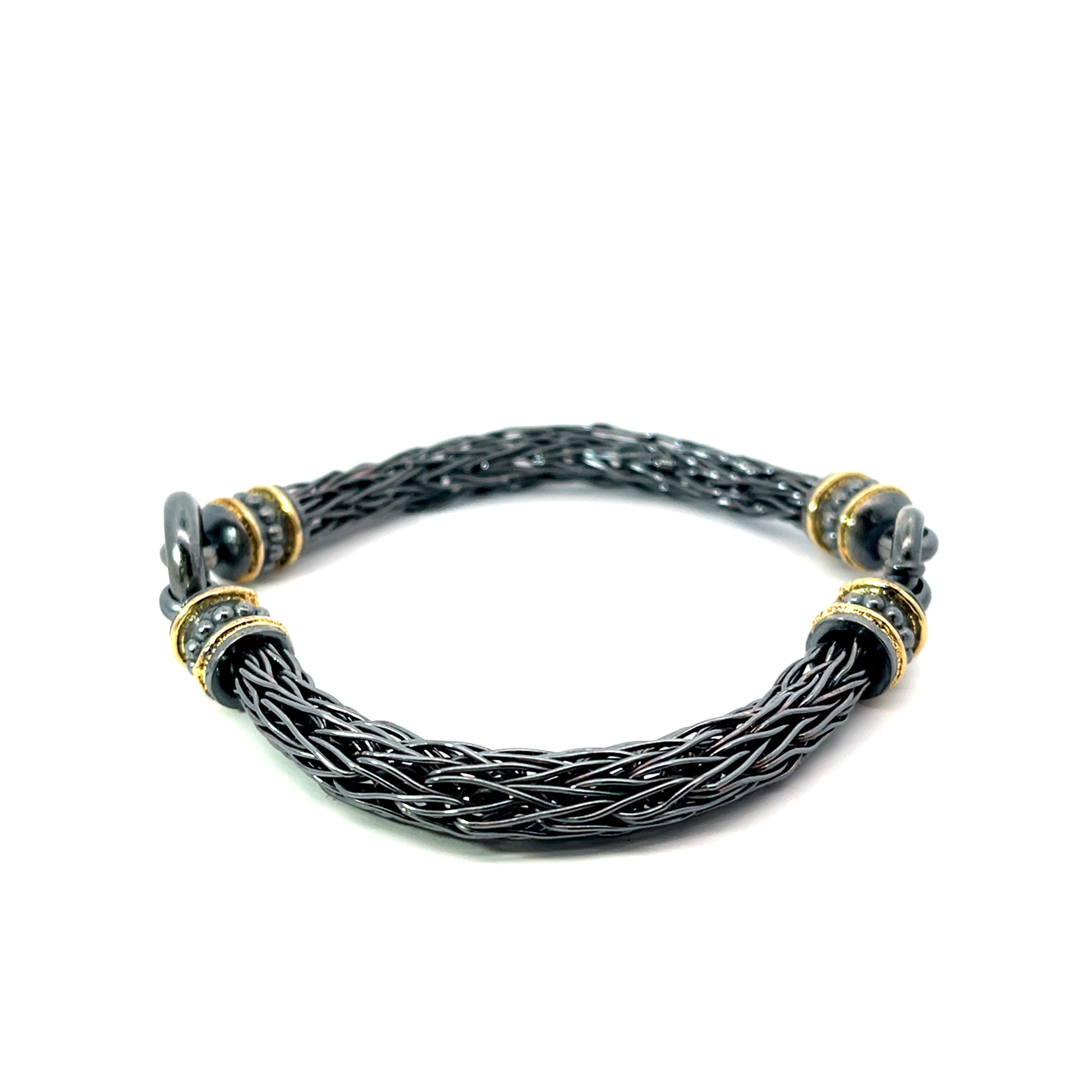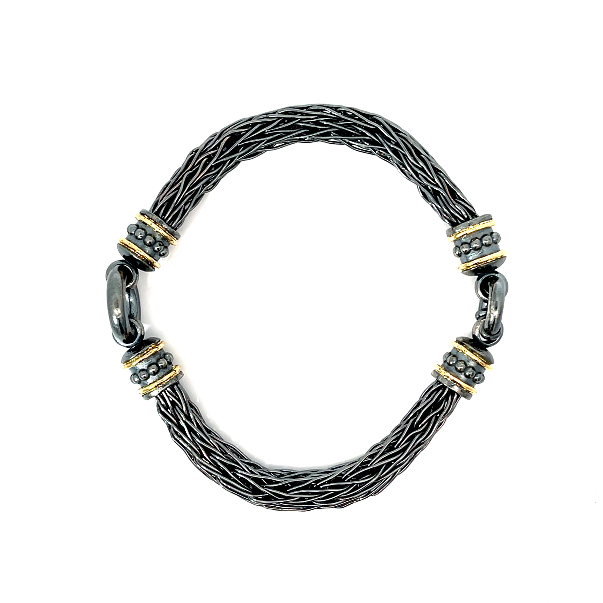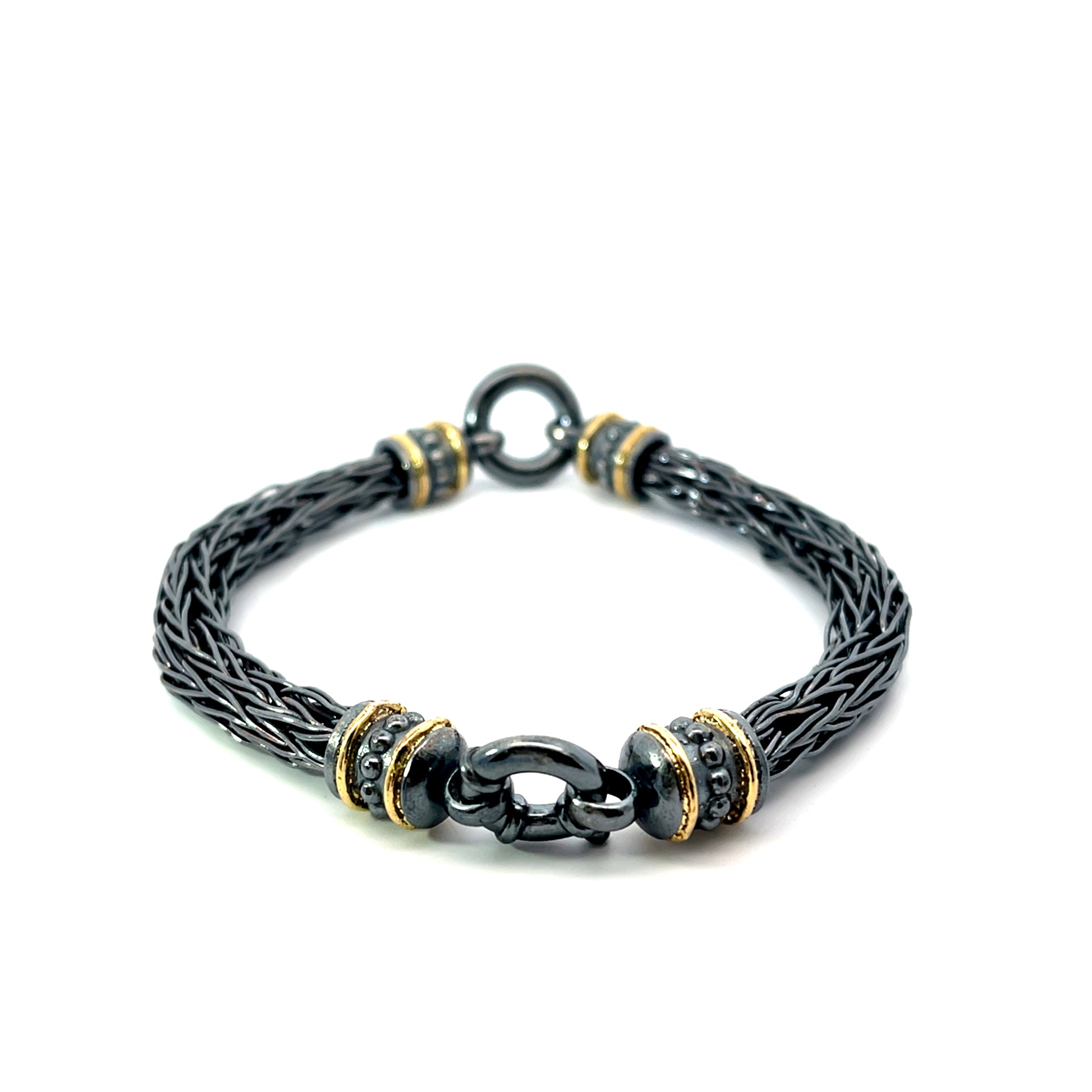 An oxidized sterling silver men's roman chain bracelet with 18k yellow gold, total length 9.75" long. This bracelet was made and designed by llyn strong.