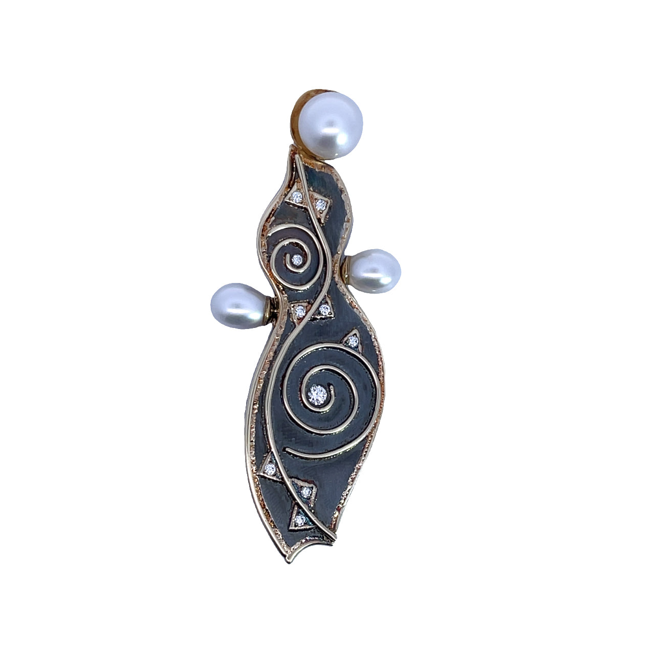 Patricia is a sterling silver, Modullyn brooch/pendant set with 18k yellow and white gold, 6.07 total carat weight green tourmaline, 1.42 total carat weight diamonds, a South Sea pearl for the head and freshwater pearls for the drops.