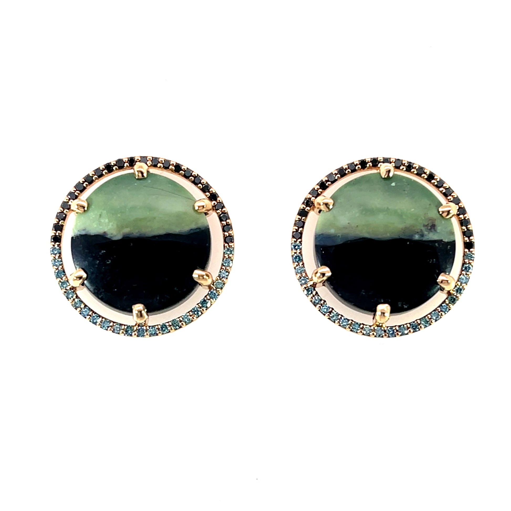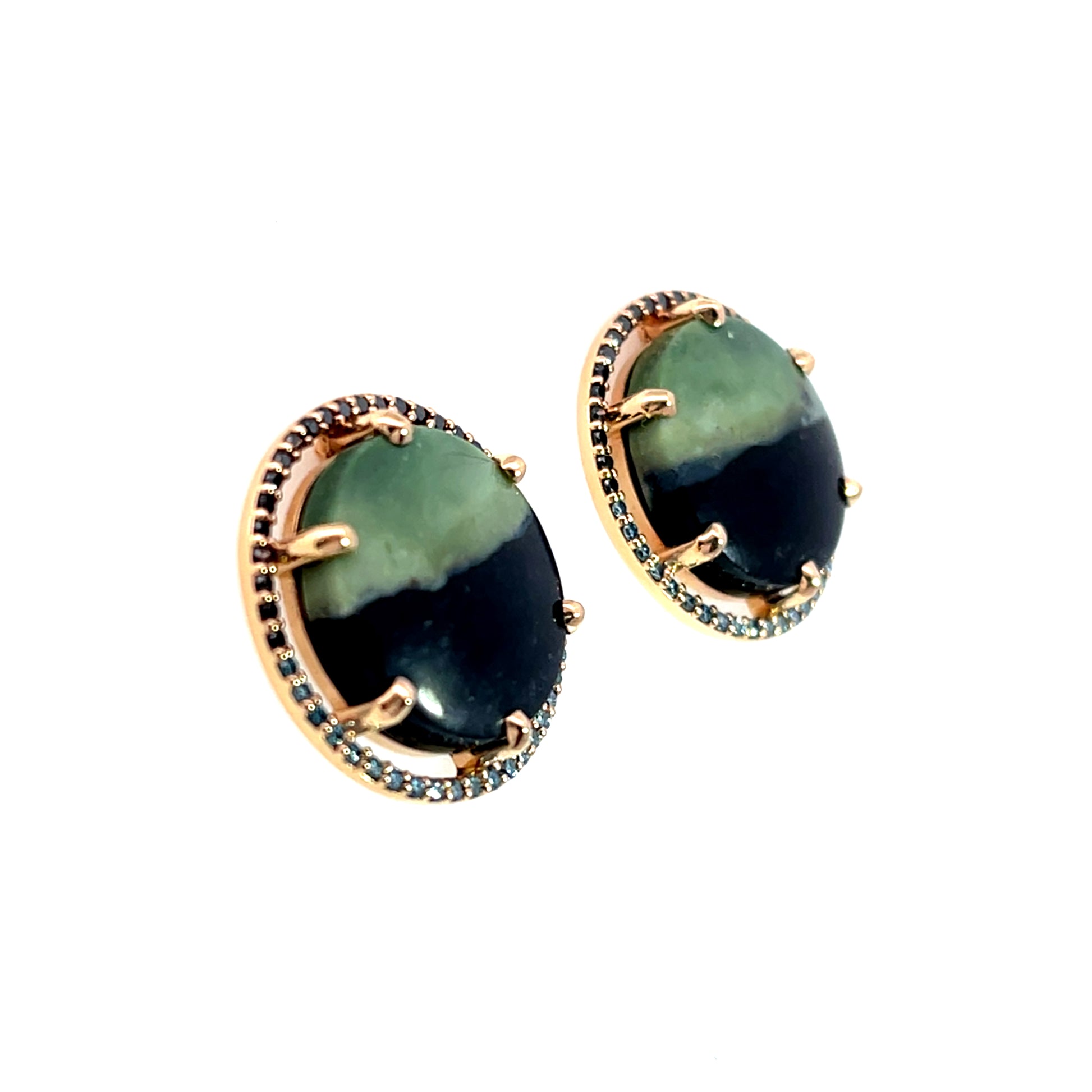 A pair of petrified wood and opal studs set in 18k rose gold, with a halo of .23 carats of aqua blue diamonds and .23 carats of black diamonds. These earrings were made and designed by Sydney Strong.