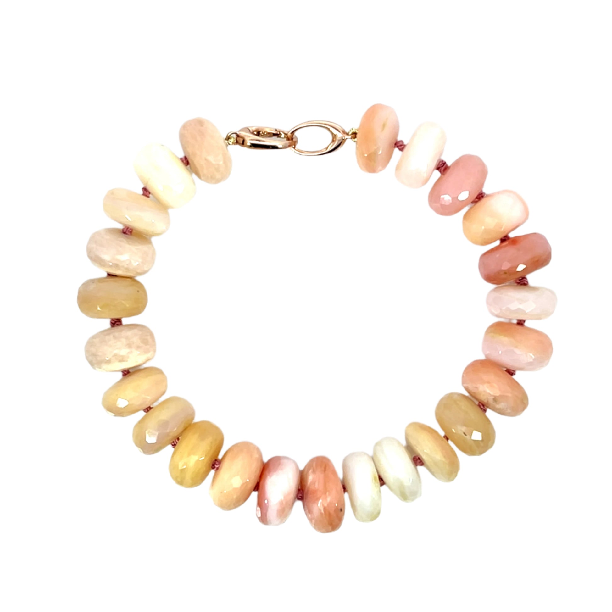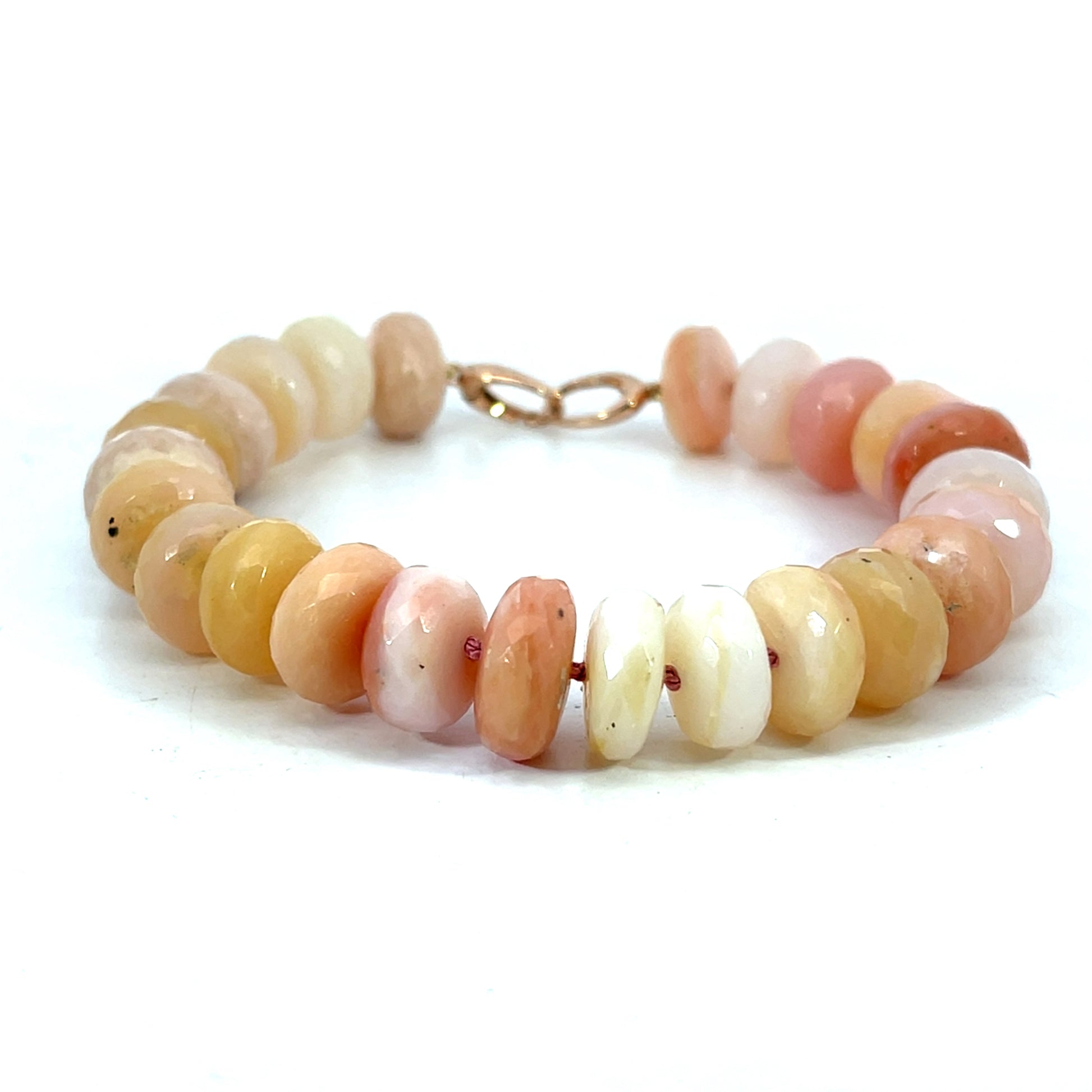 A pink and beige opal bracelet with a 14k rose gold clasp. 8" long. This bracelet was made and designed by llyn strong.