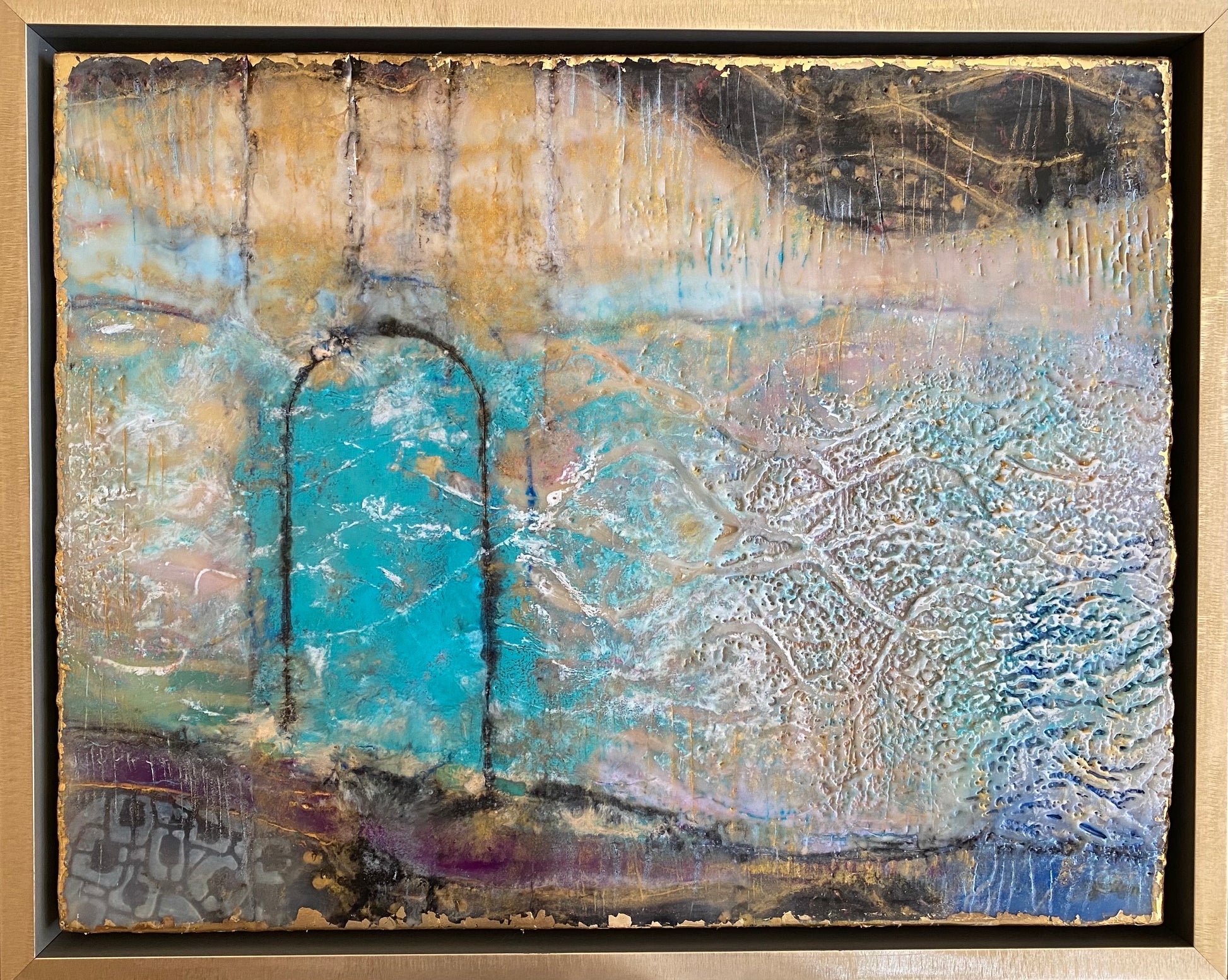15.25" X 12.25" X 2.25". "Portal" is an encaustic painting with gold leaf and oils on panel. This painting was made by llyn strong.