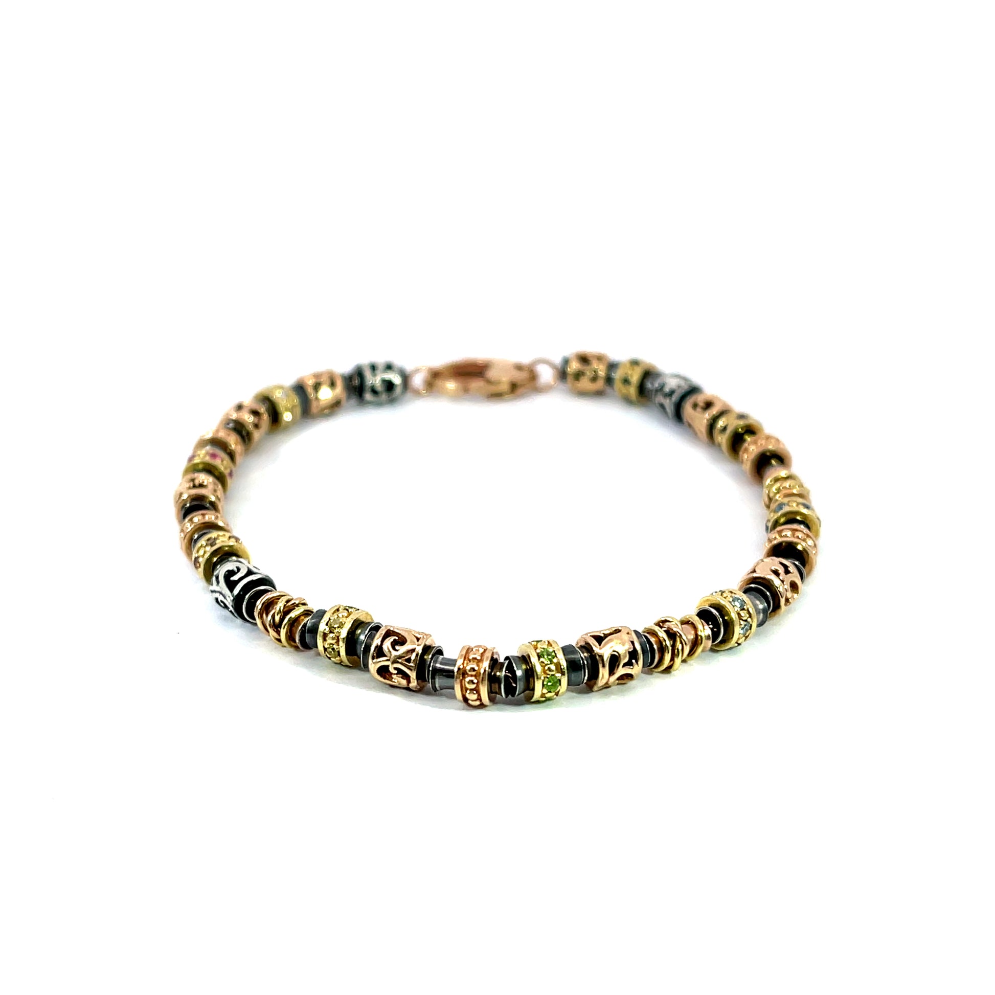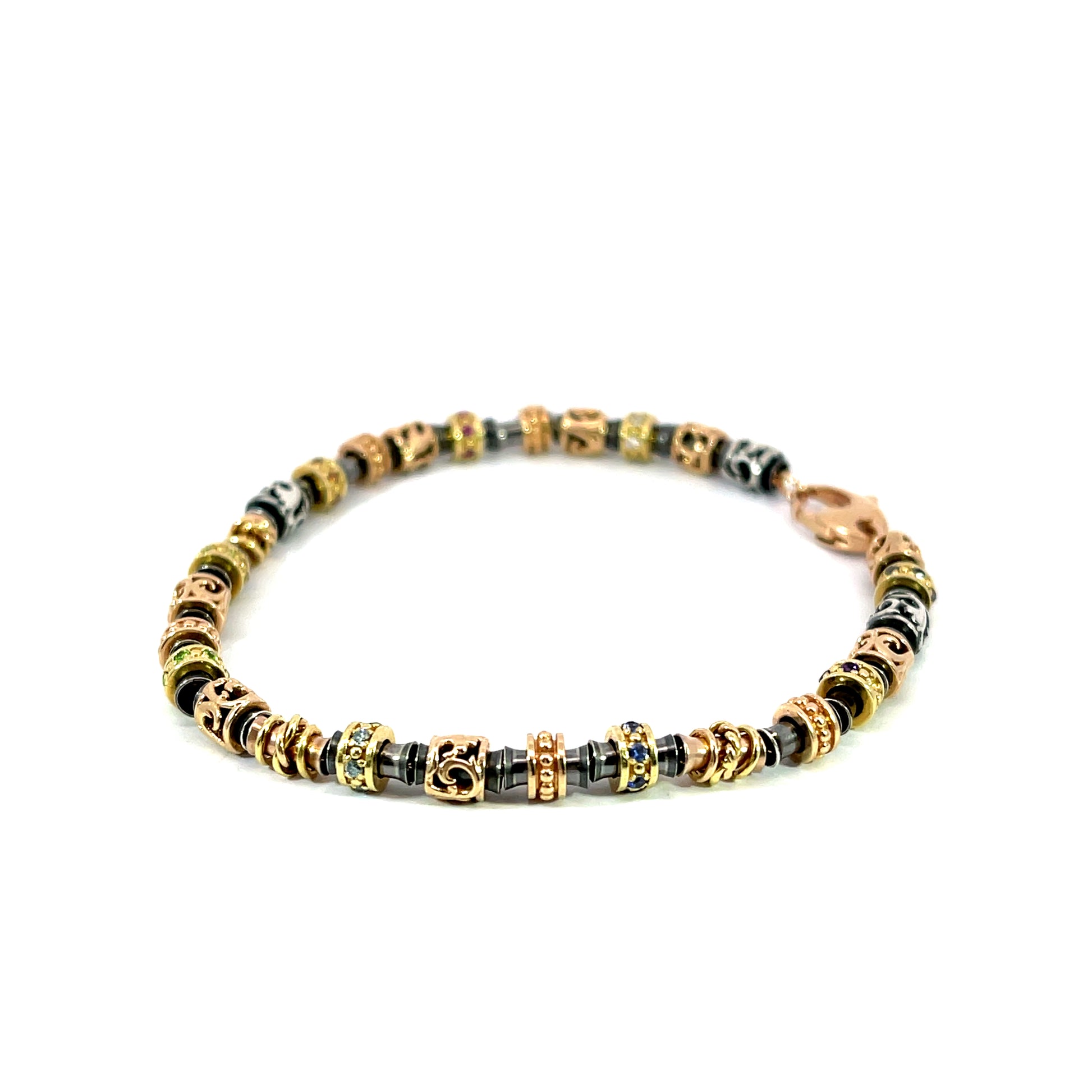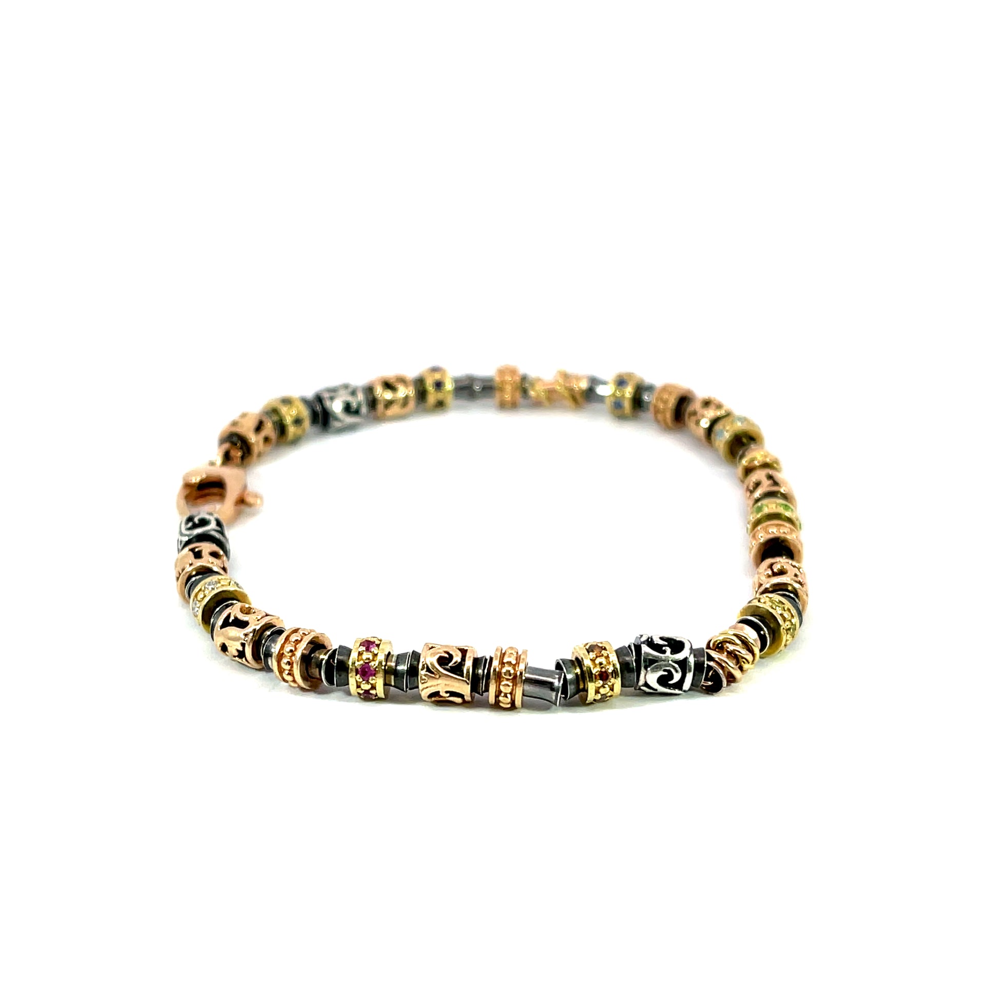 A rainbow stone rondell bracelet with oxidized sterling silver and 18k yellow, rose, and white gold. Stones include white, orange, yellow, green, aqua blue, teal blue, and black diamonds along with pink sapphires and amethyst. 7 inches long. Made and designed by llyn strong.