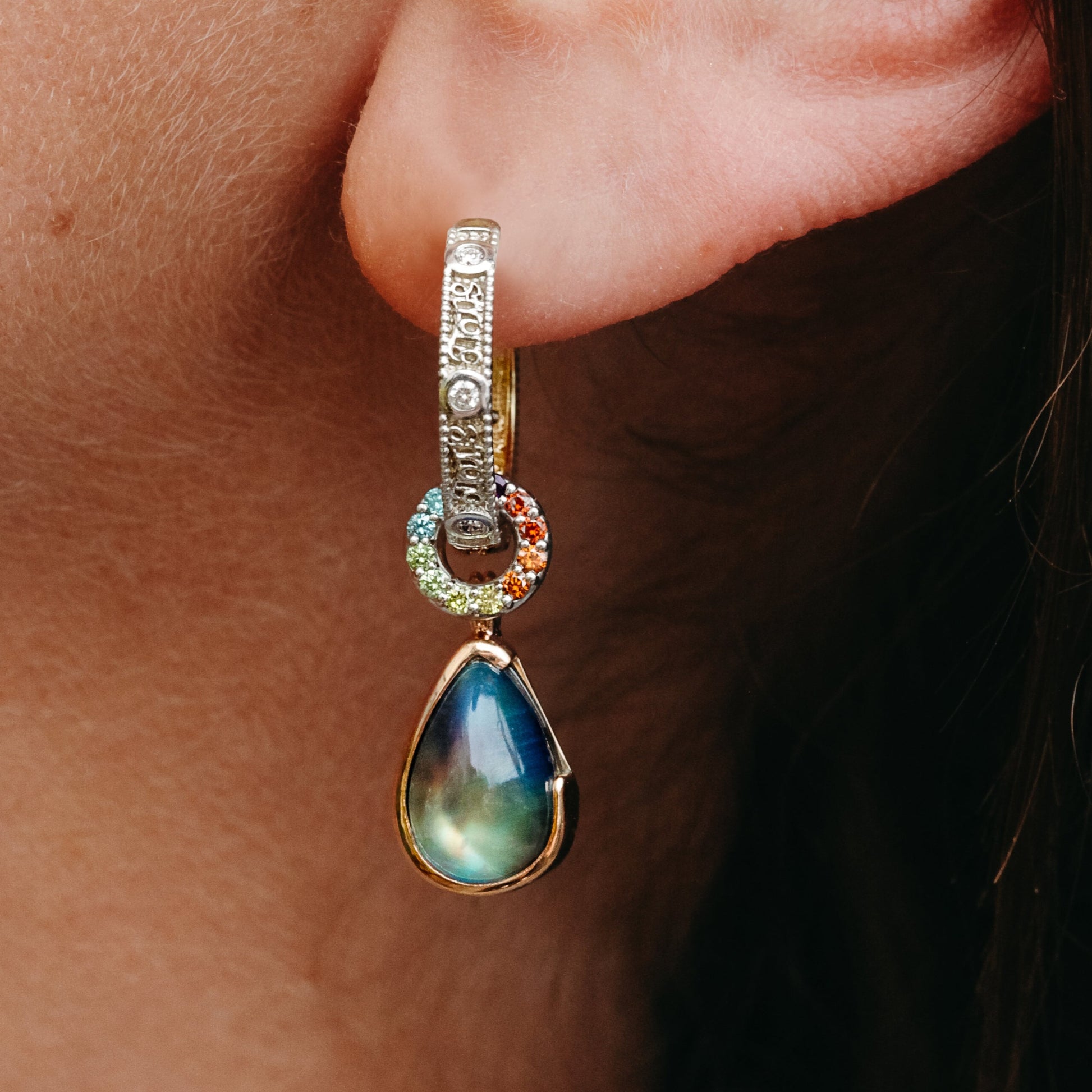 Shown on ear with Reversible 18k White and Yellow Gold Strong Pair Hoops with White and Red Diamonds and 18k Rose Gold Rainbow Moonstone Jackets