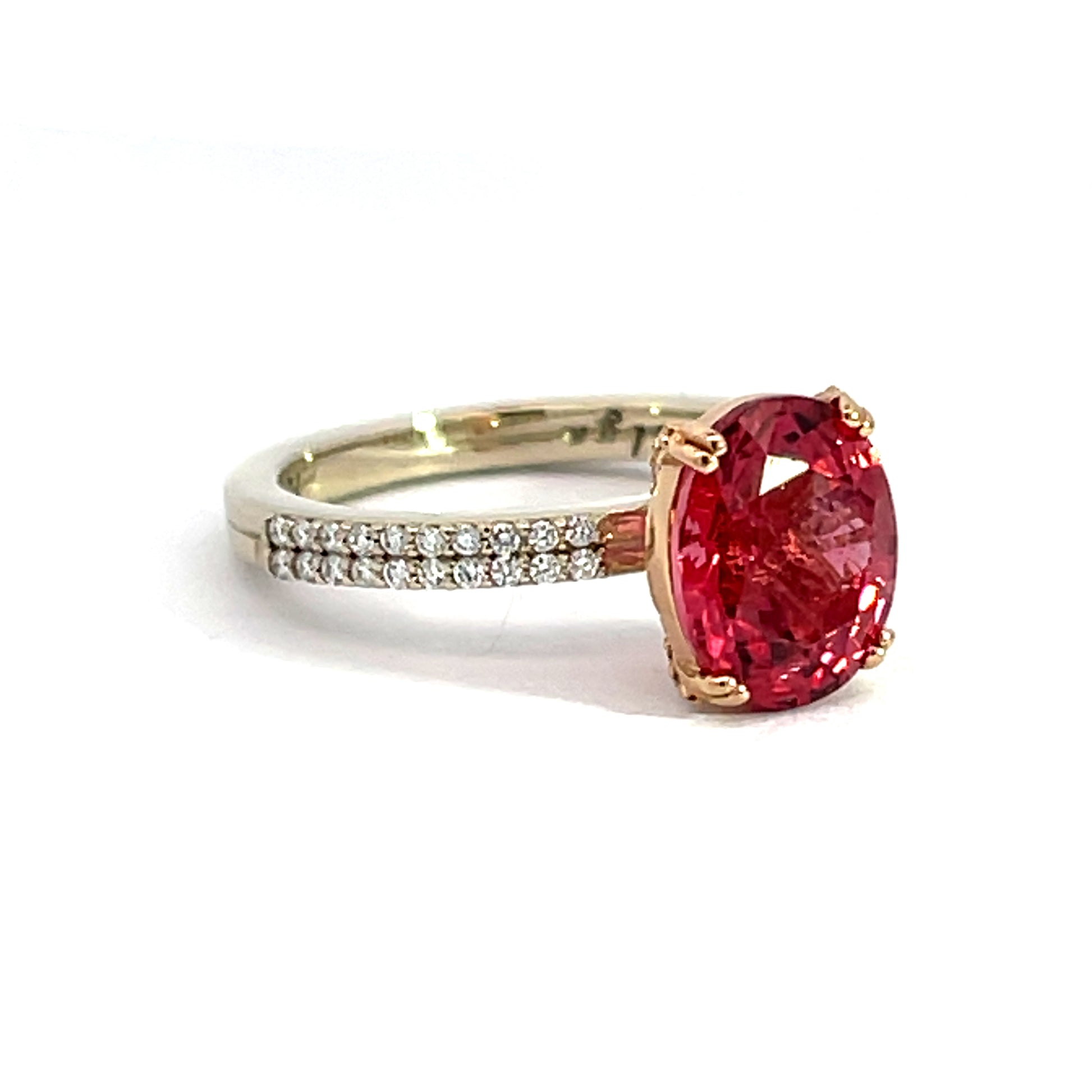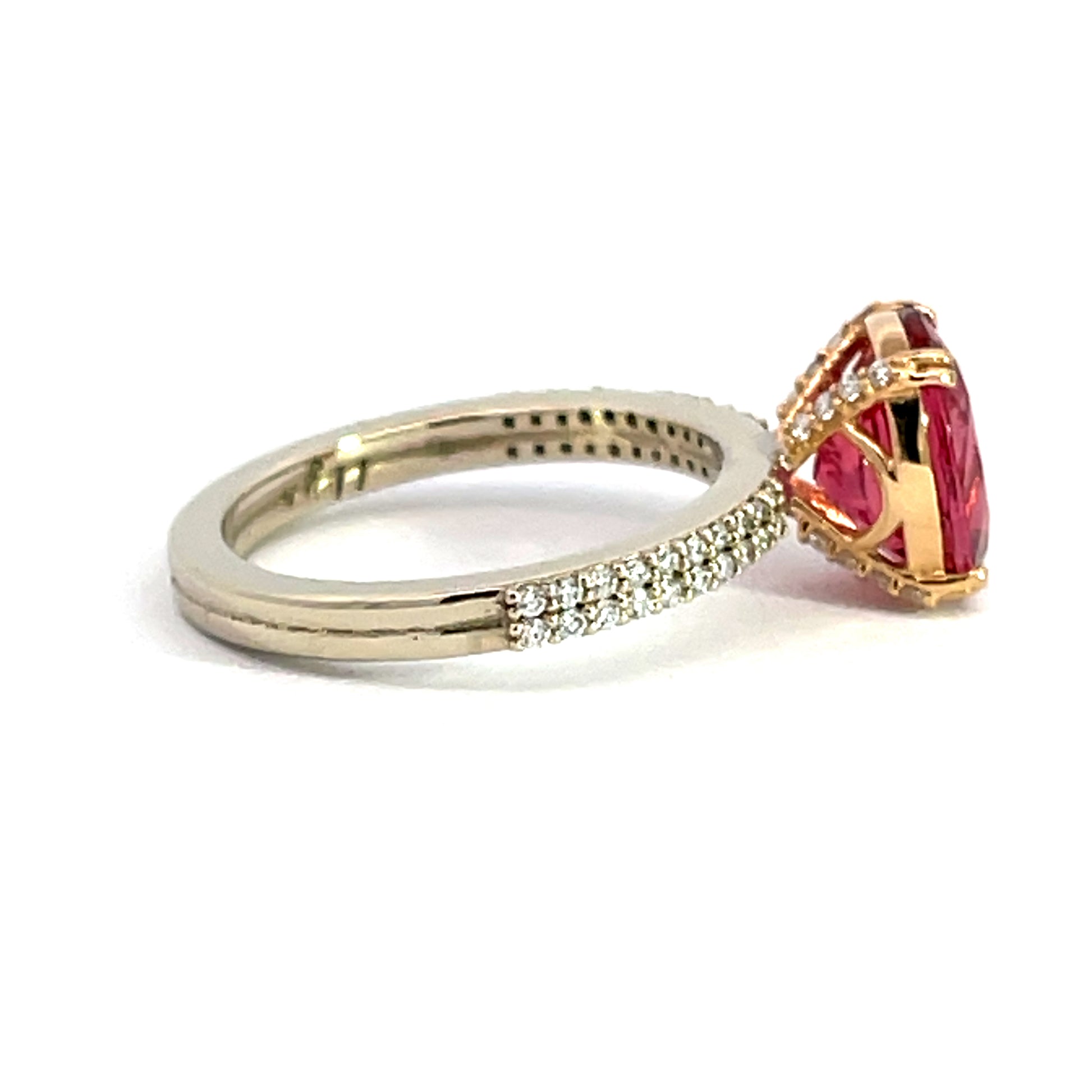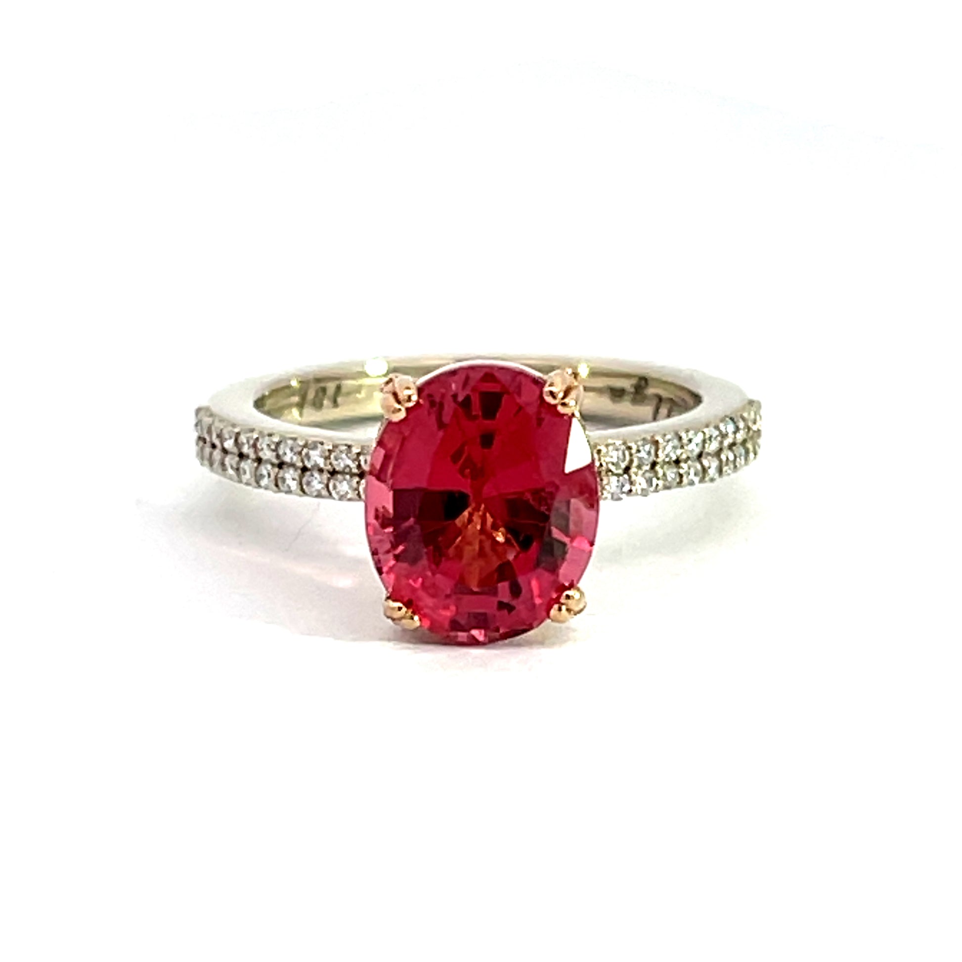 An 18k white gold and 18k rose gold ring featuring one double prong set oval faceted untreated red spinel 3.43 carats and accented by a double row of white diamonds down each shank and diamonds up the prongs F color VS clarity 0.22 total carat weight. This ring was designed and made by llyn strong.
