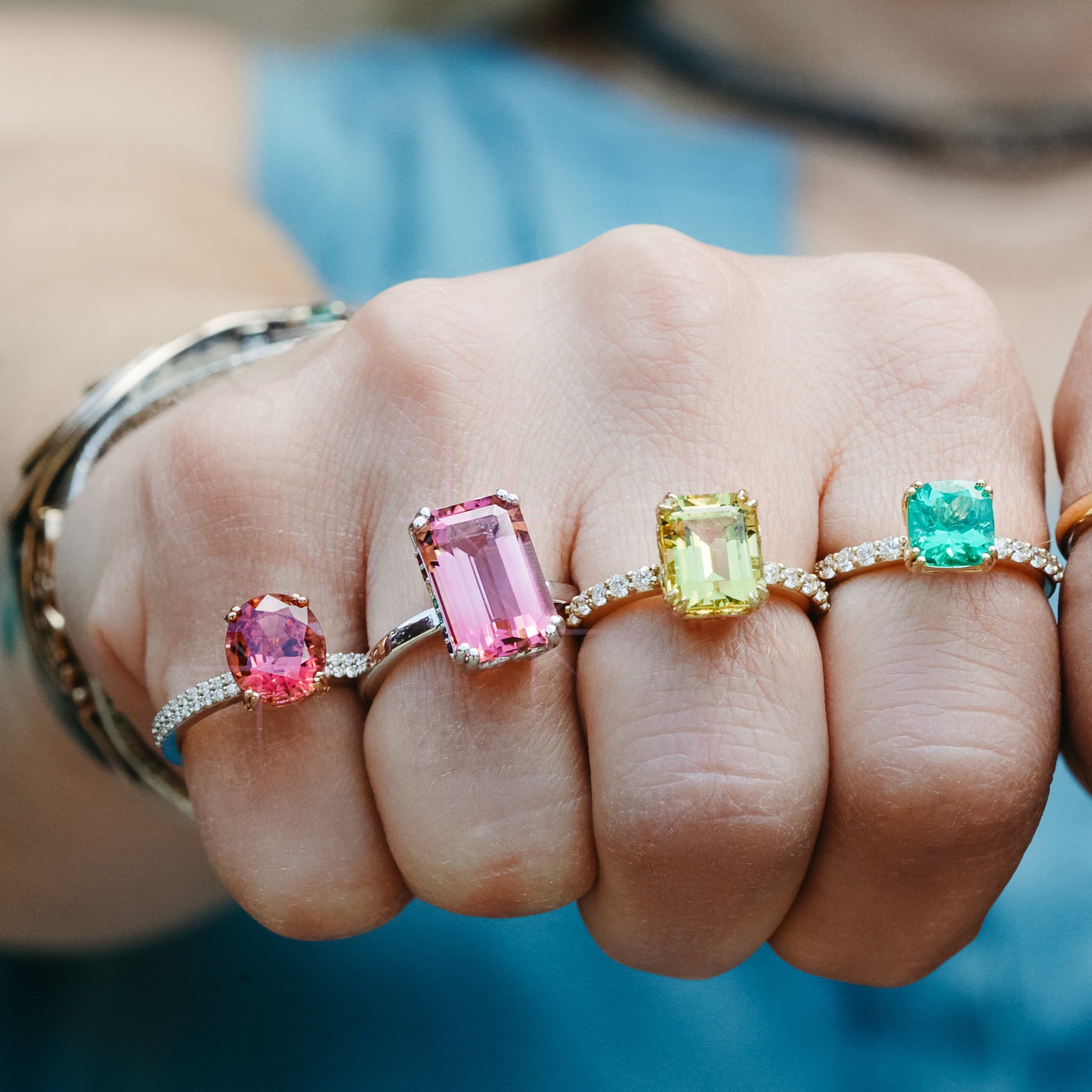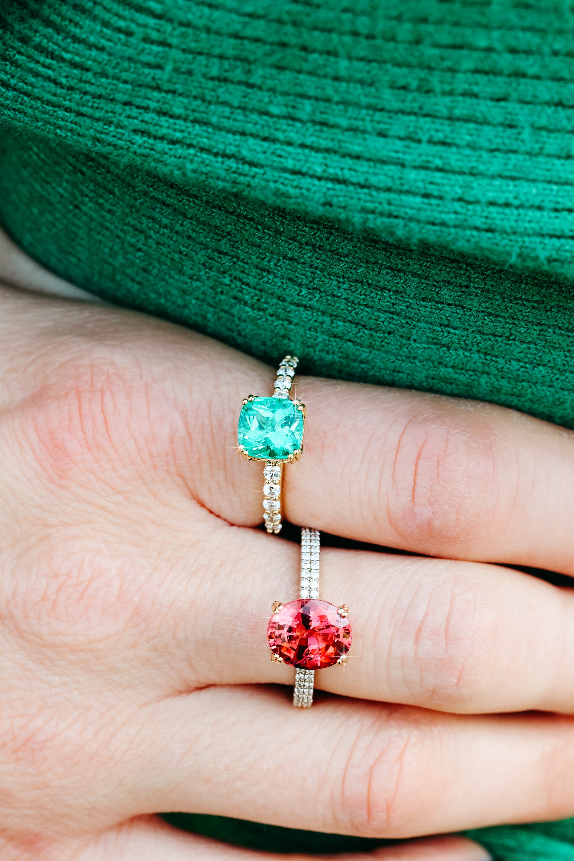 Shown on model with 18K yellow gold emerald and diamond ring and 18K white gold pink tourmaline ring.