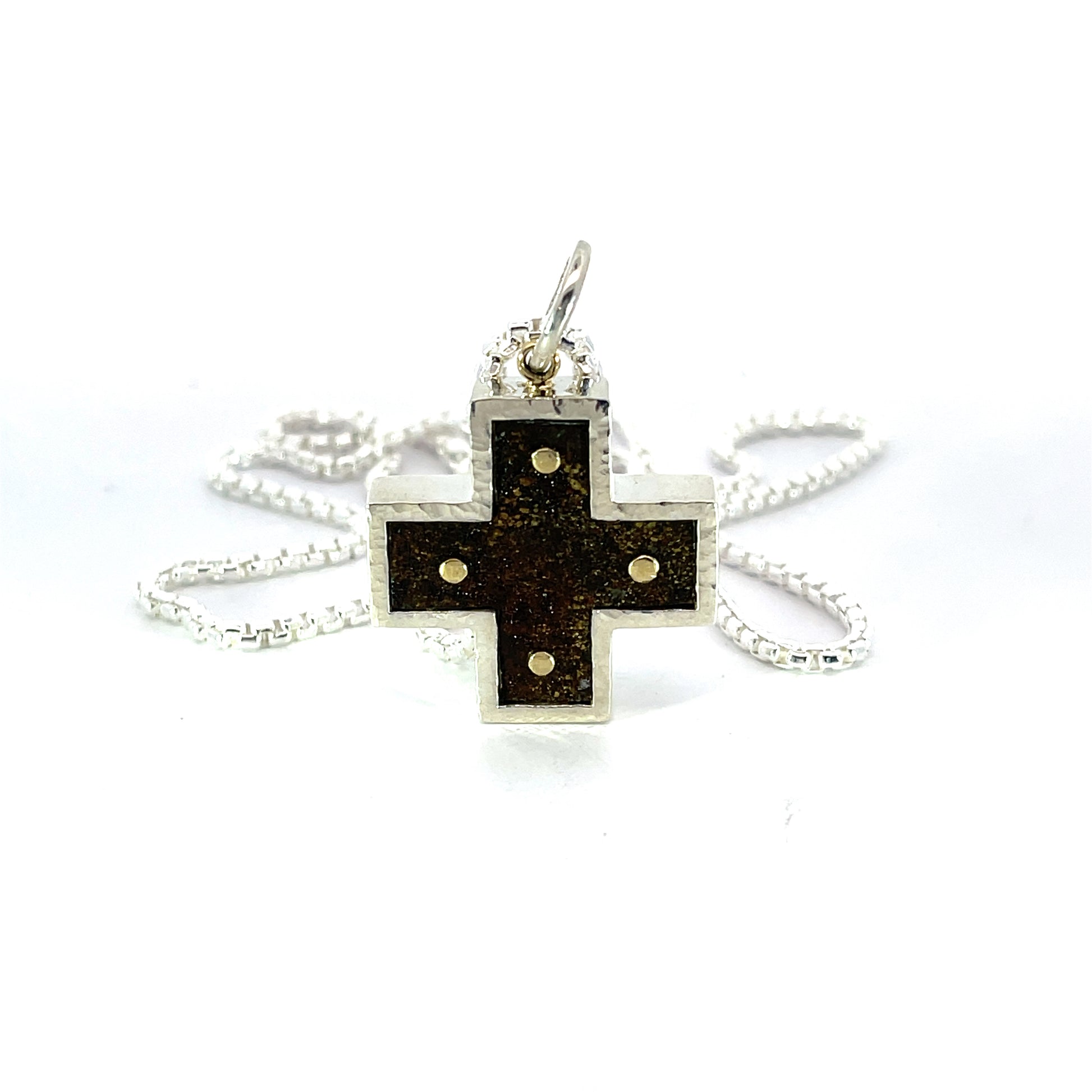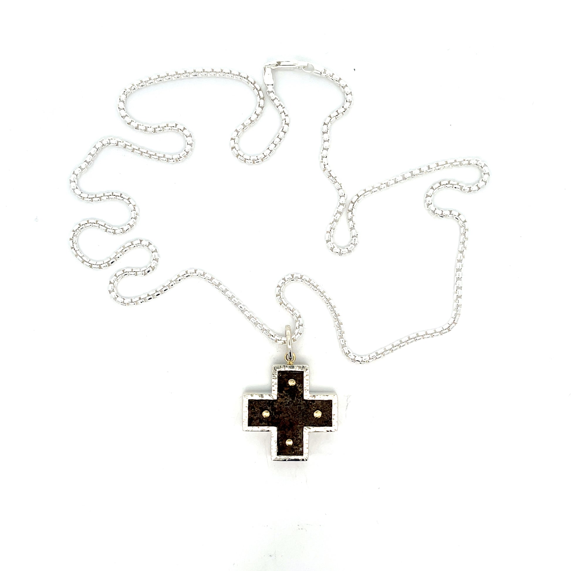 This gold iron cross pendant is not your average piece of jewelry. It’s raw. It’s bold. And it was made to make a statement. Designed and handcrafted in our Greenville, SC shop + studio, this one-of-a-kind iron cross necklace fuses materials not typically found in fine jewelry: rusted iron, sterling silver, and 18k yellow gold.
