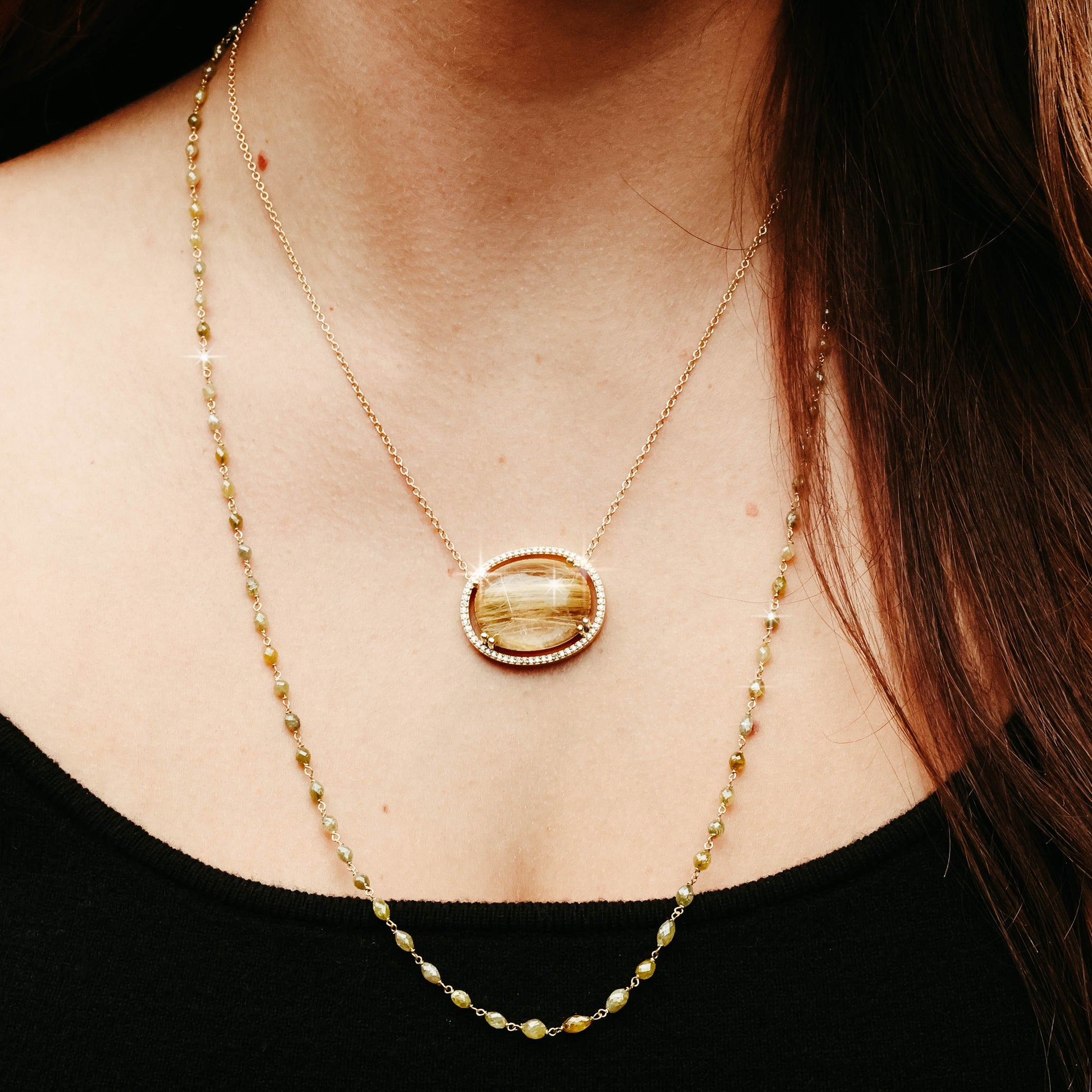 Rutilated Quartz and White Diamond Halo Necklace