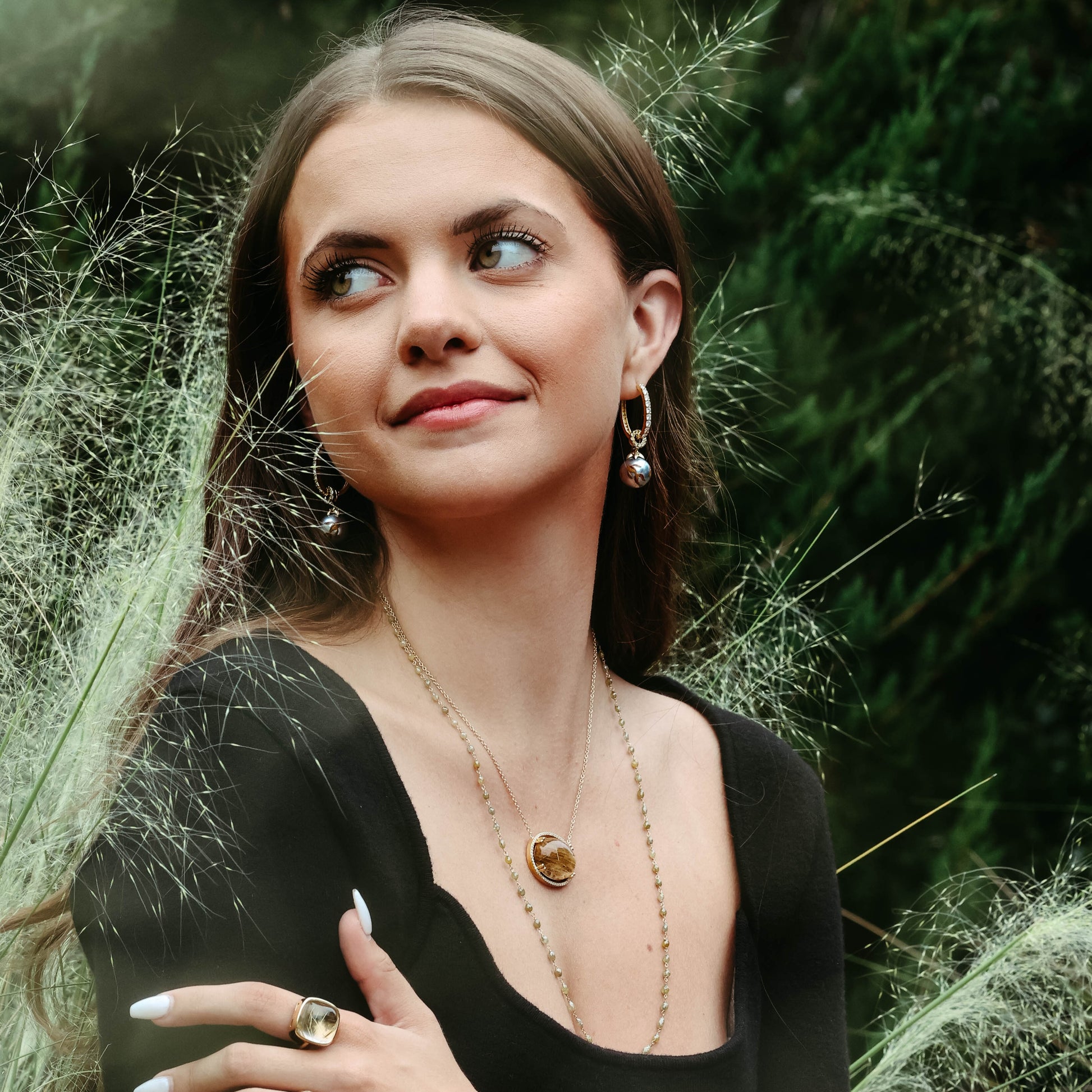 Model also wearing 18K yellow gold rutilated quartz ring.