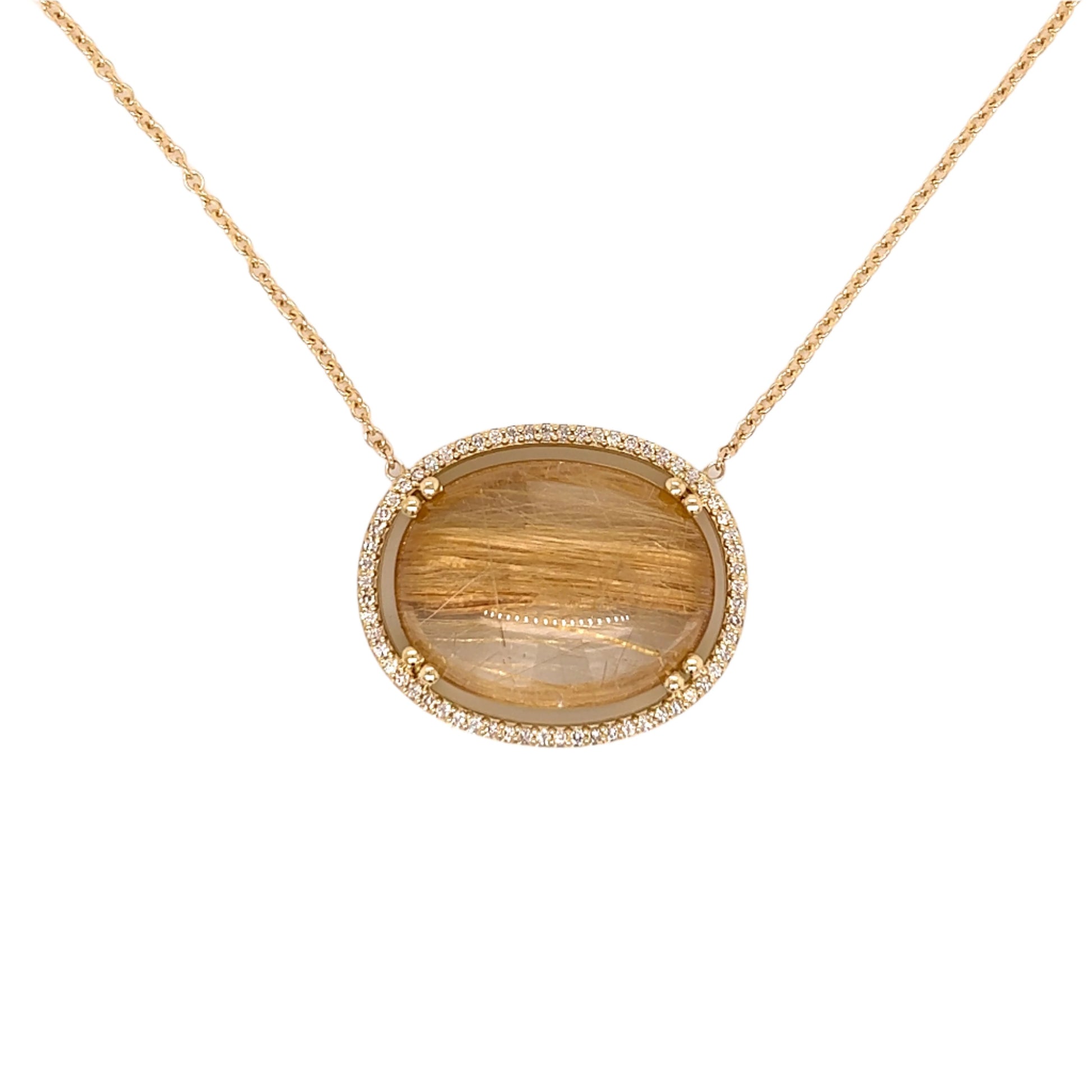 An 18k yellow gold pendant featuring one double prong set oval cabochon Brazilian rutilated quartz 29.5 total carat weight and accented by a halo of white diamonds 0.31 total carat weight on a 16 inch 2mm 14k yellow gold cable chain. This necklace was designed and made by Sydney Strong.