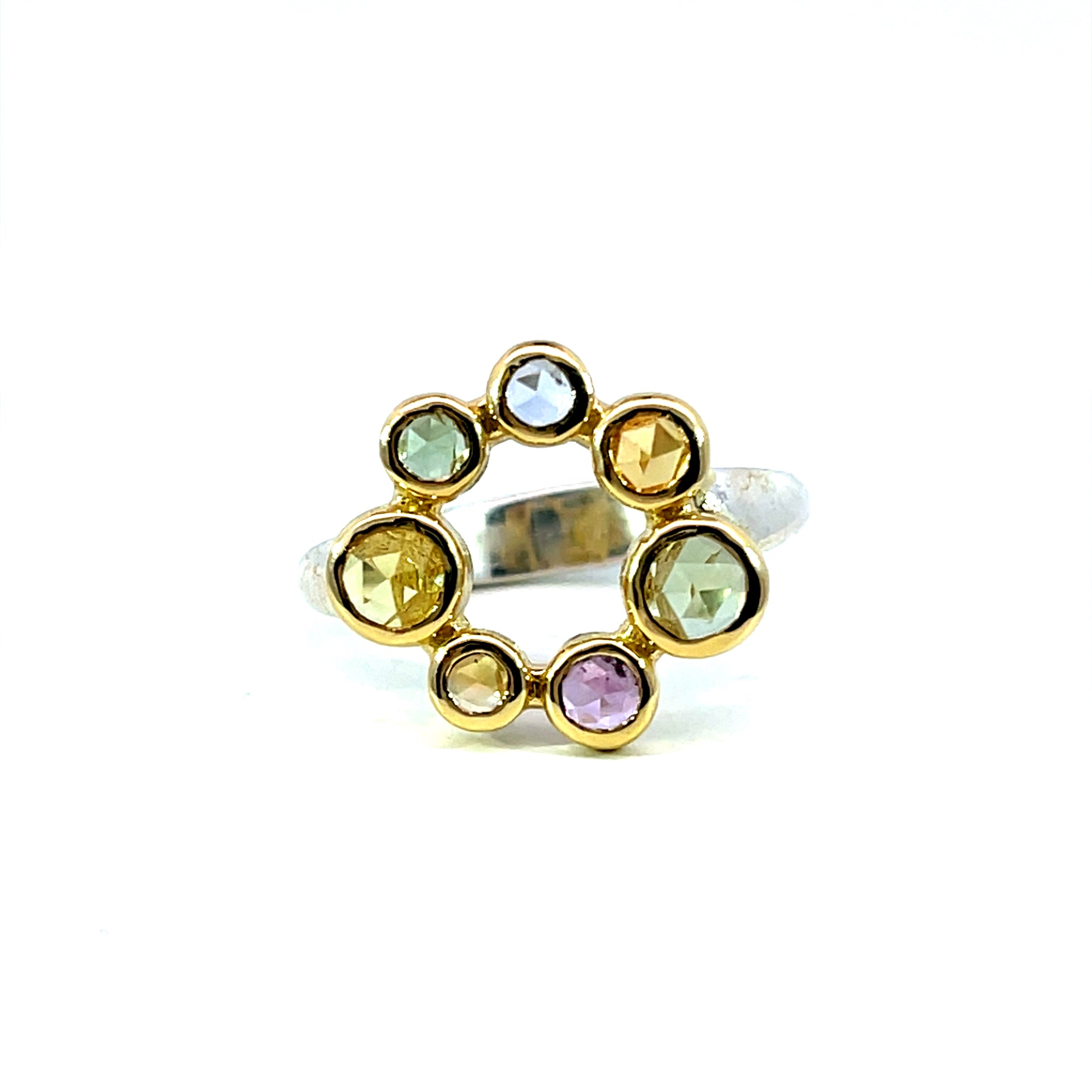 An 18k yellow gold and sterling silver sapphire rose ring featuring a 1.52 total carat weight of sapphires. Ring size 7. This ring was made and designed by llyn strong.