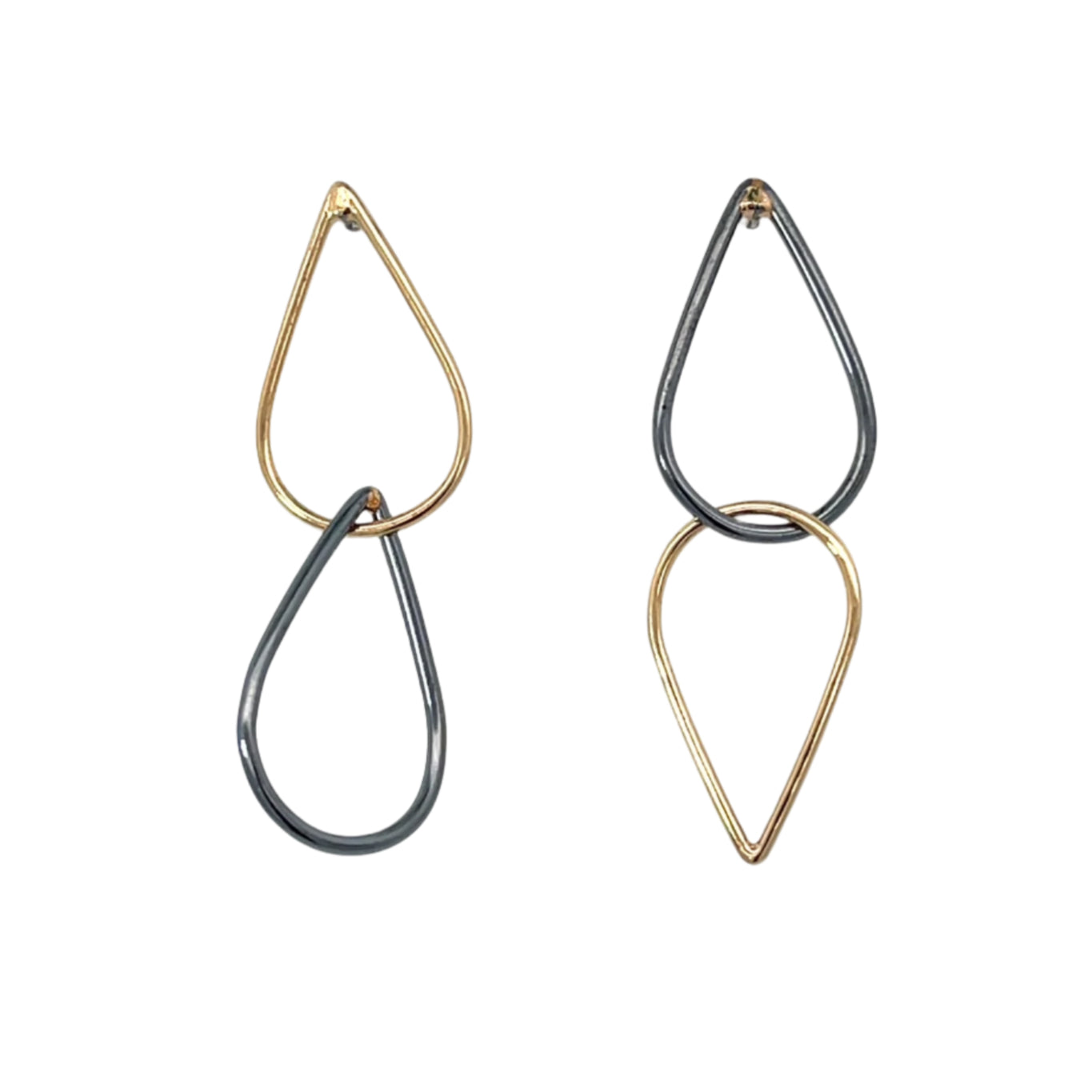 Short Oxidized Sterling Silver and 14k Yellow Gold Teardrop Link Studs