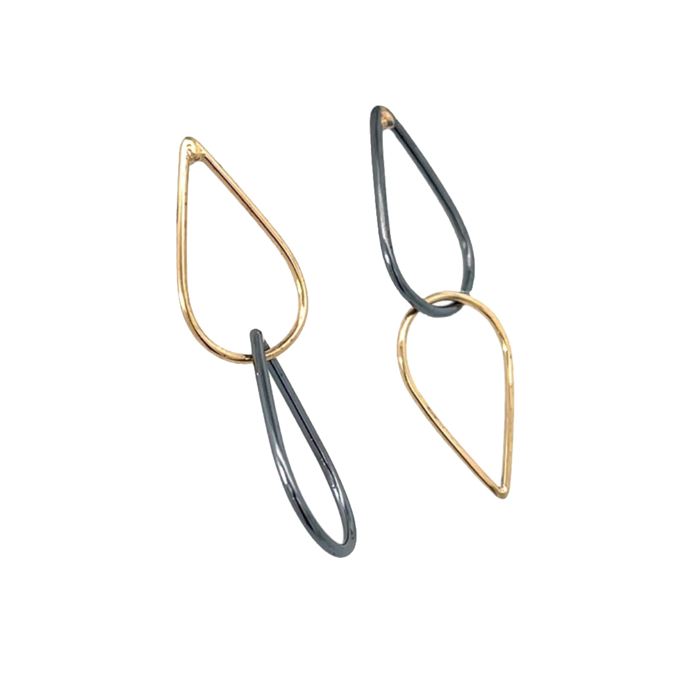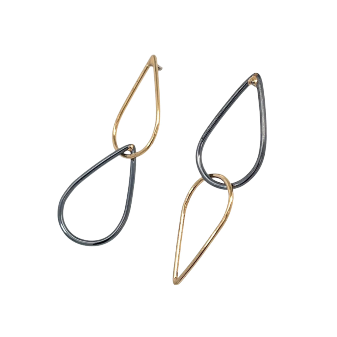 A pair of short oxidized sterling silver and 14k yellow gold teardrop link stud earrings. These earrings were made and designed by Faron Justice.