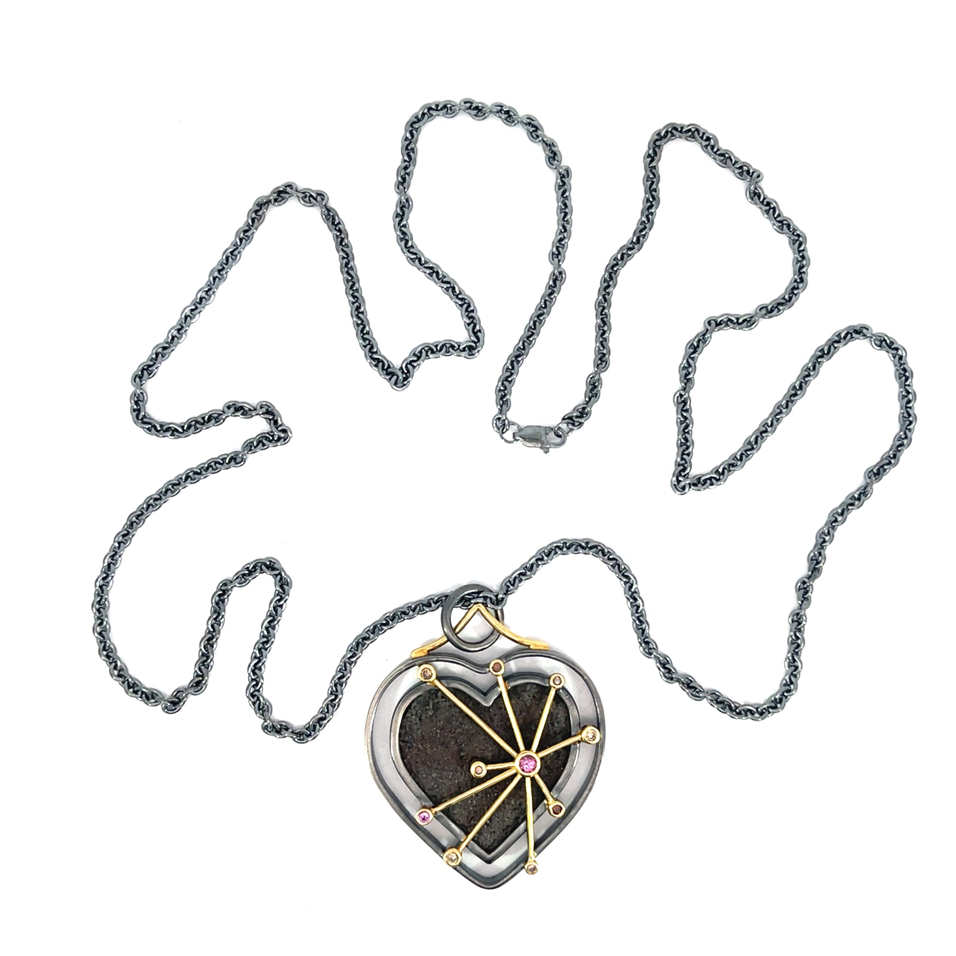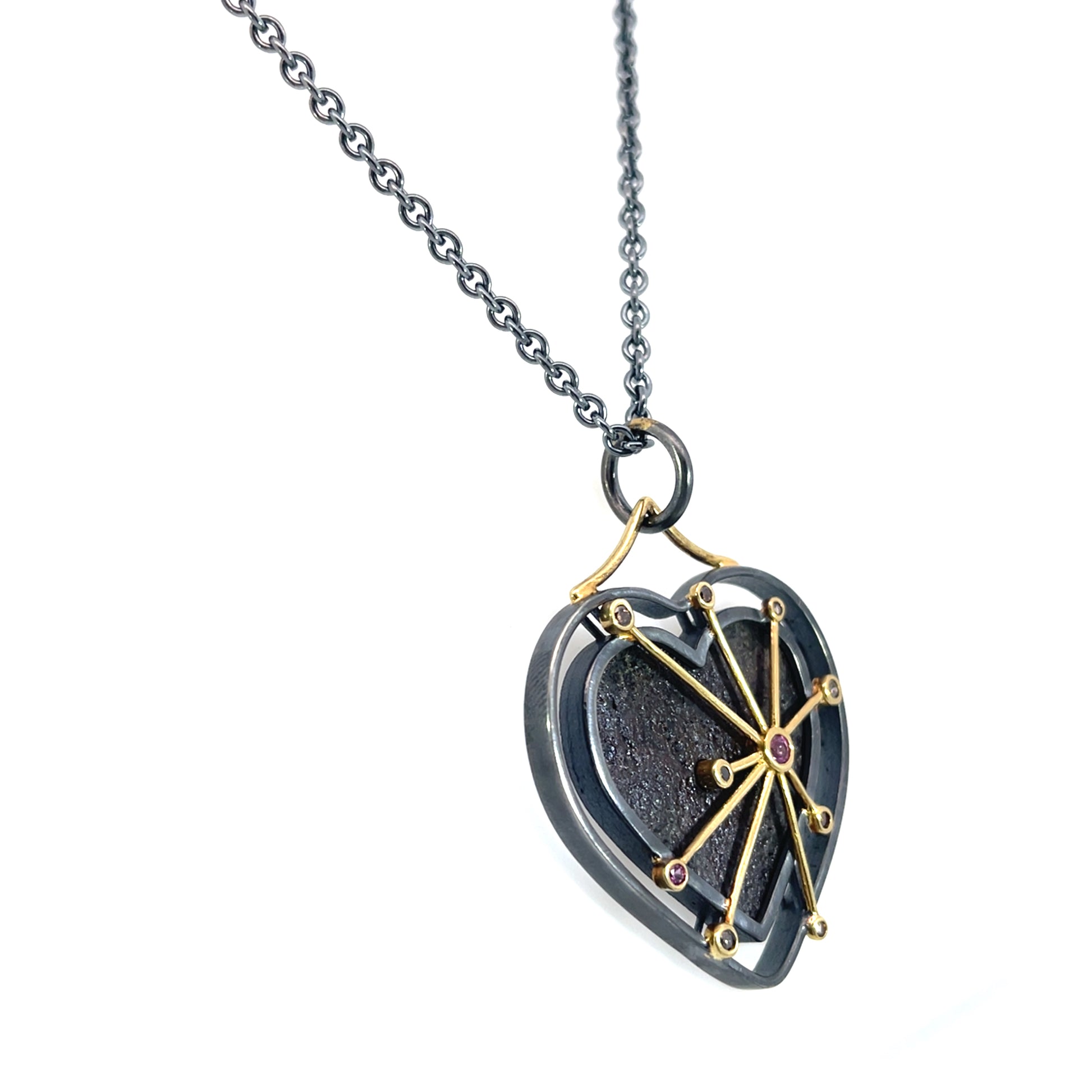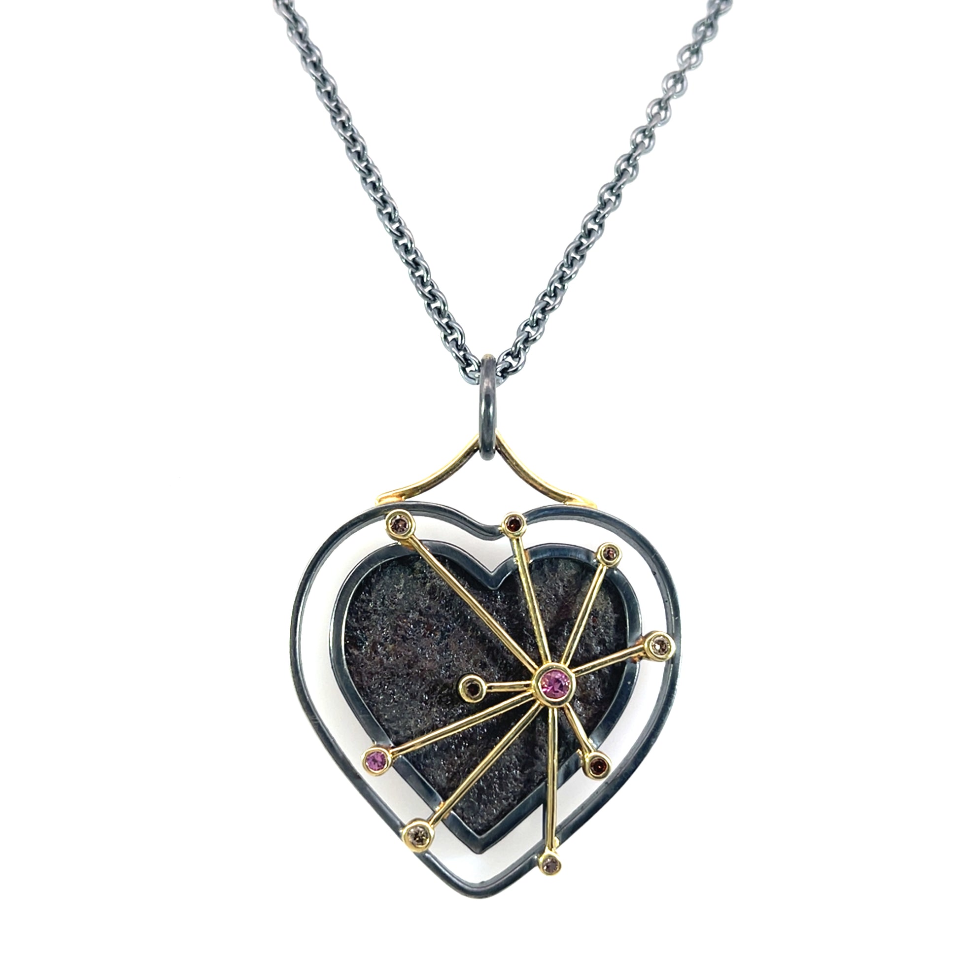 "Spark Heart" 2025 Unbreakable Heart with oxidized sterling silver and rusted iron as well as 0.22tcw pink sapphires, 0.06tcw red diamonds, 0.10tcw champagne diamonds, 0.04tcw lavender sapphires all set in 18k yellow gold.