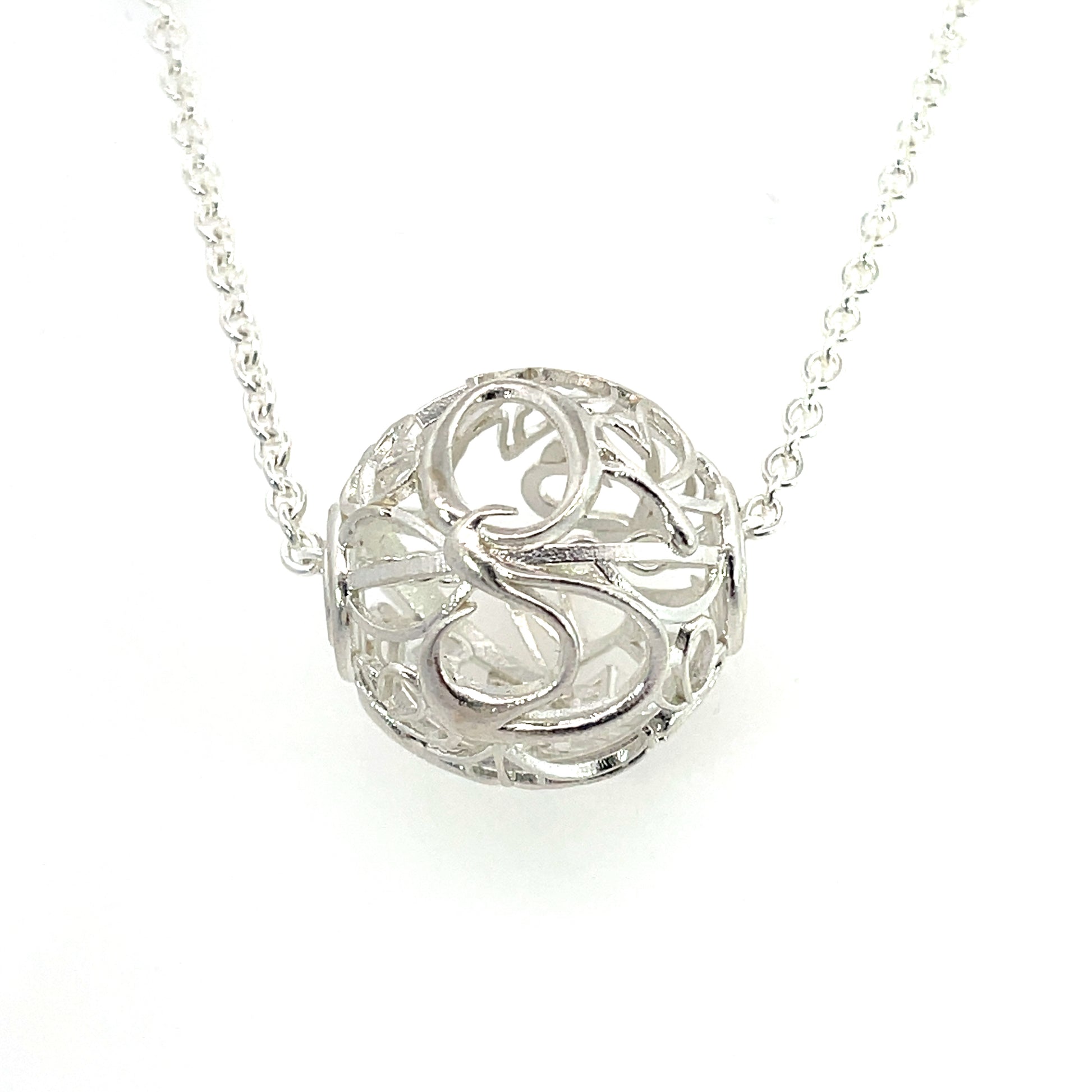 A skeletal sterling silver Greenville Ball Necklace on a sterling silver chain. This pendant was designed and made by llyn strong.