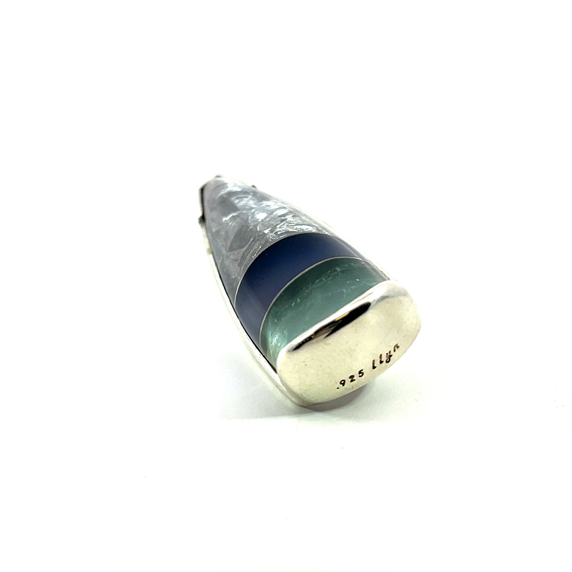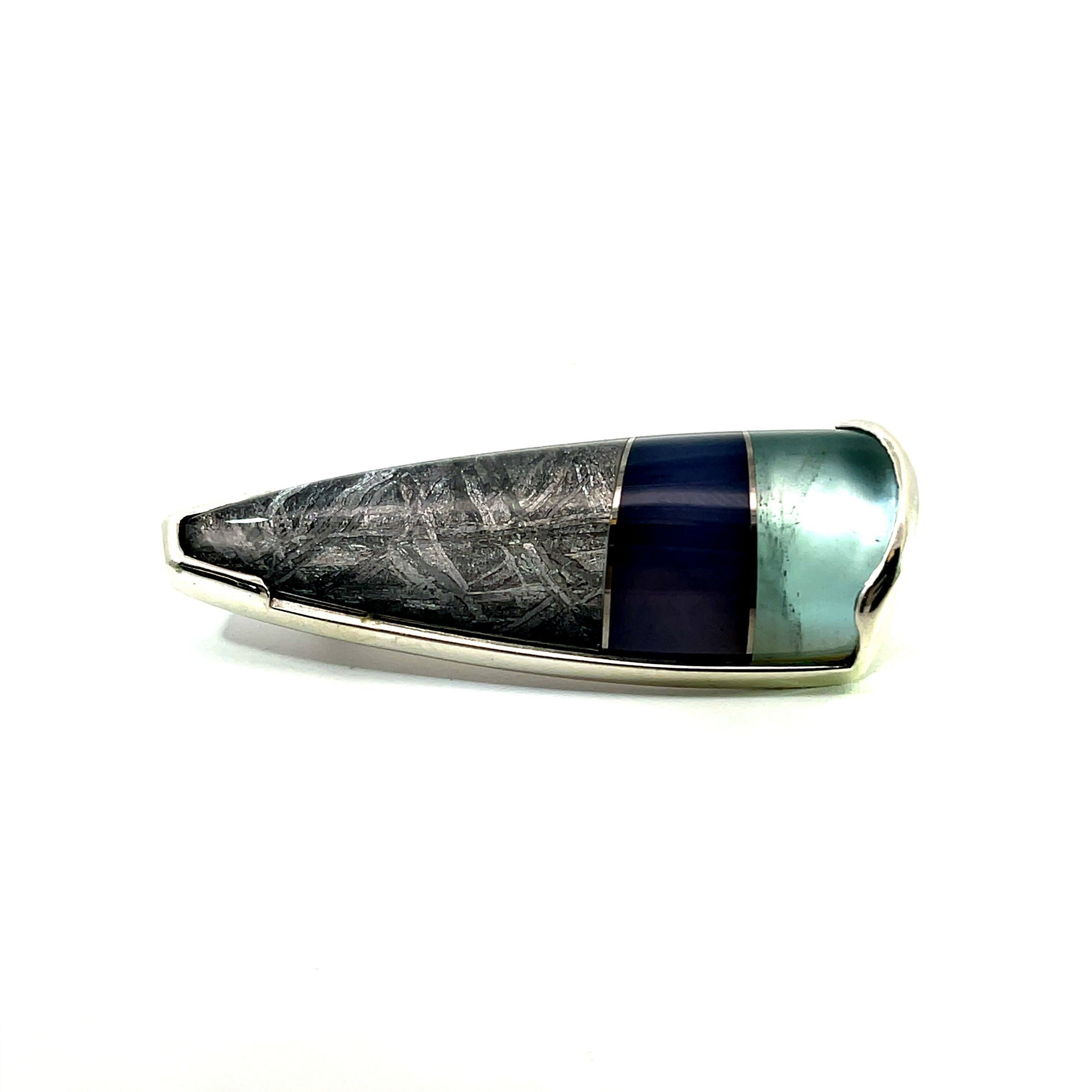 A sterling silver and 18k yellow gold brooch featuring a composite stone containing aquamarine, chalcedony, and meteorite by Steve Walters. 15.72mm x 44.48mm. Made and designed by llyn strong.