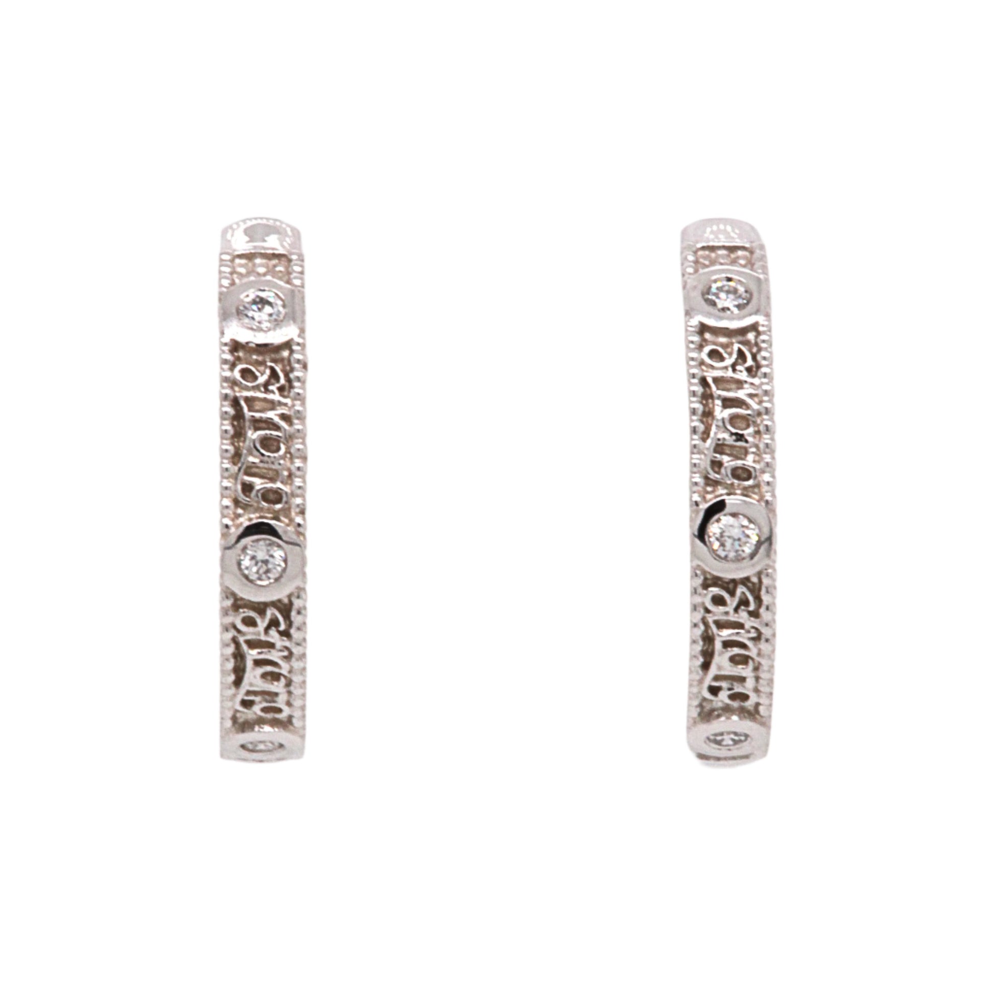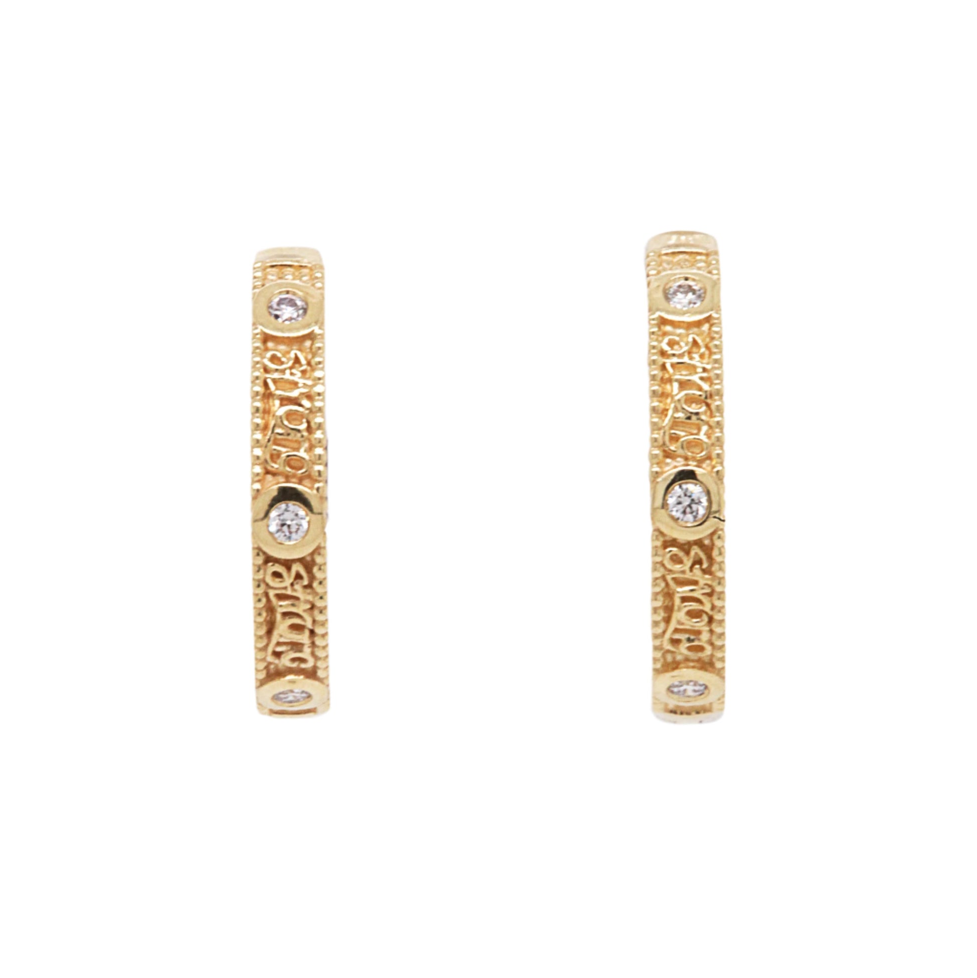 A pair of 18k yellow and white gold reversible "Strong Pair" Hoops set with .24 carats of 1.5mm white diamonds. These hoops were made and designed by llyn and Sydney Strong.