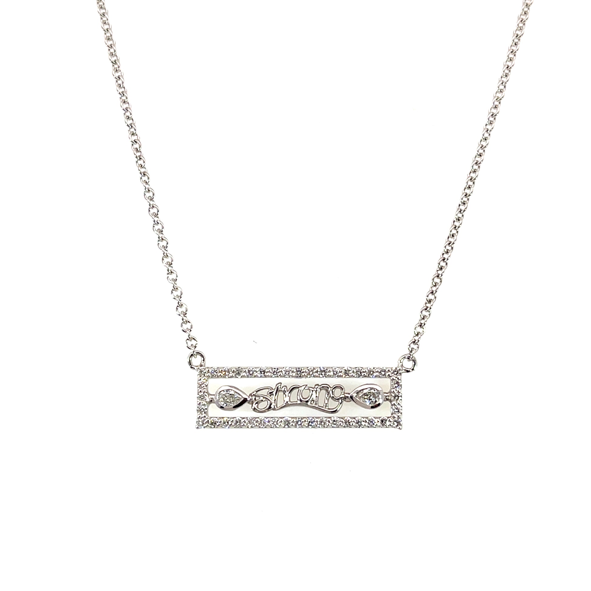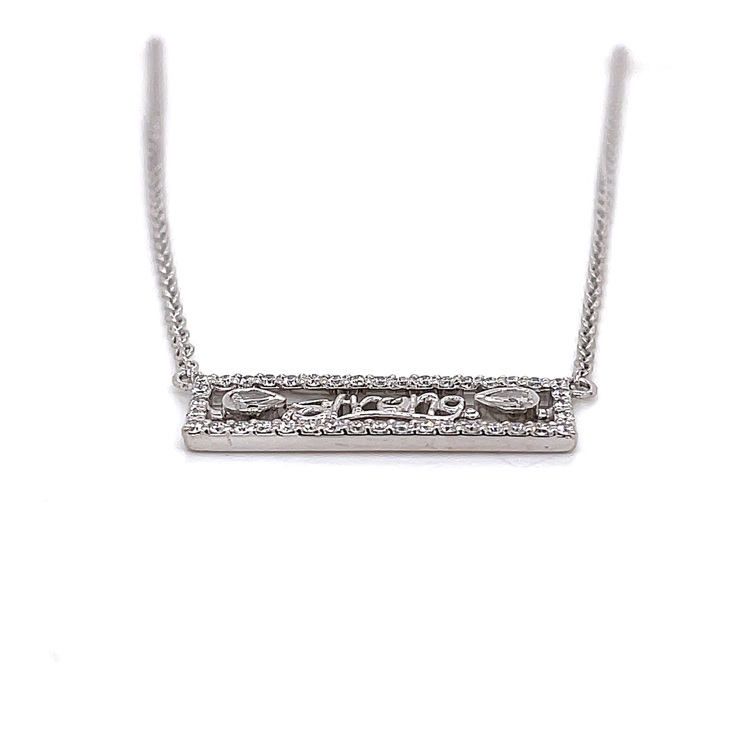 An 18k white gold "Strong Pair" Bar Necklace set with .42 carats of round and pearshape diamonds. On a 16" 14k white gold chain. This necklace was made and designed by llyn and Sydney Strong.
