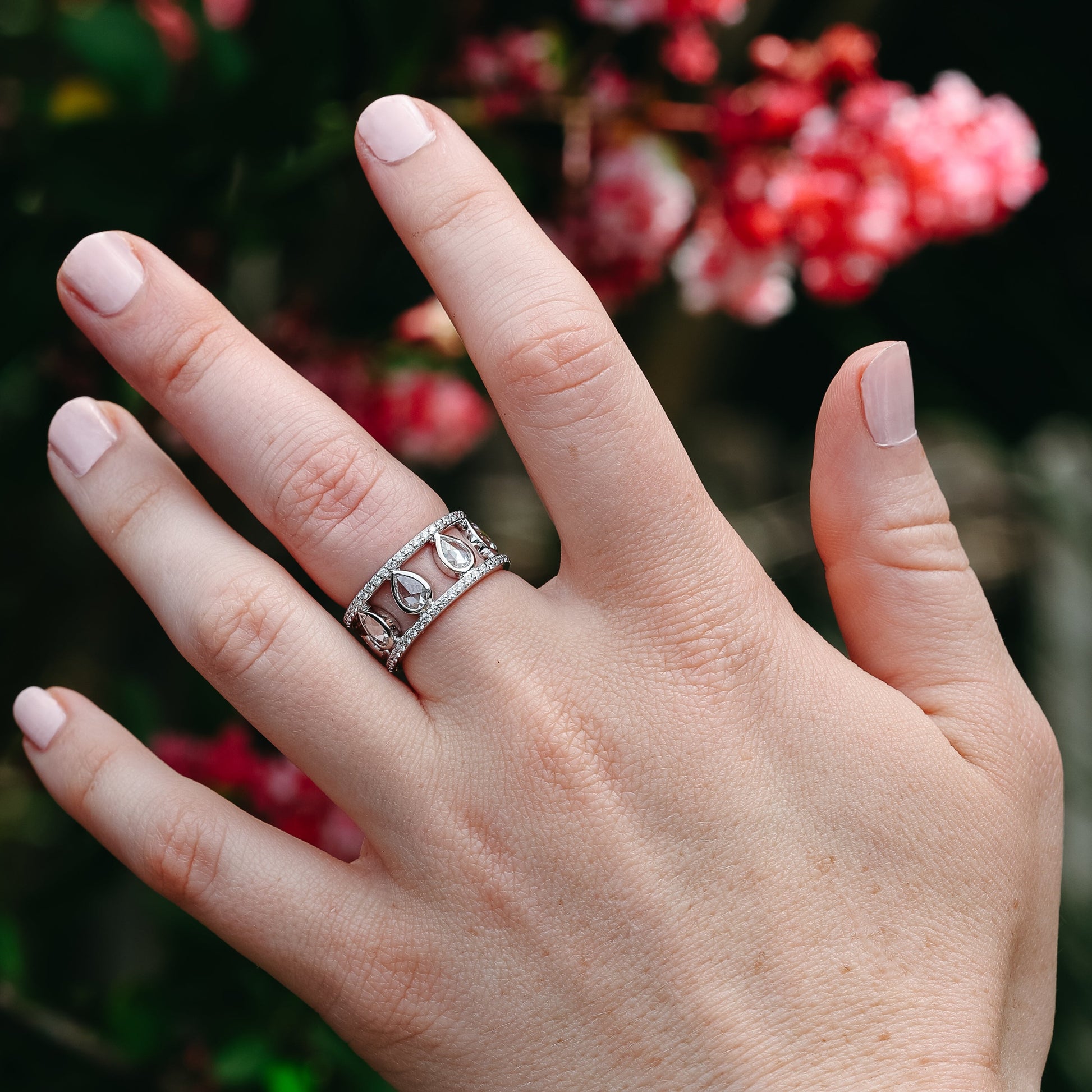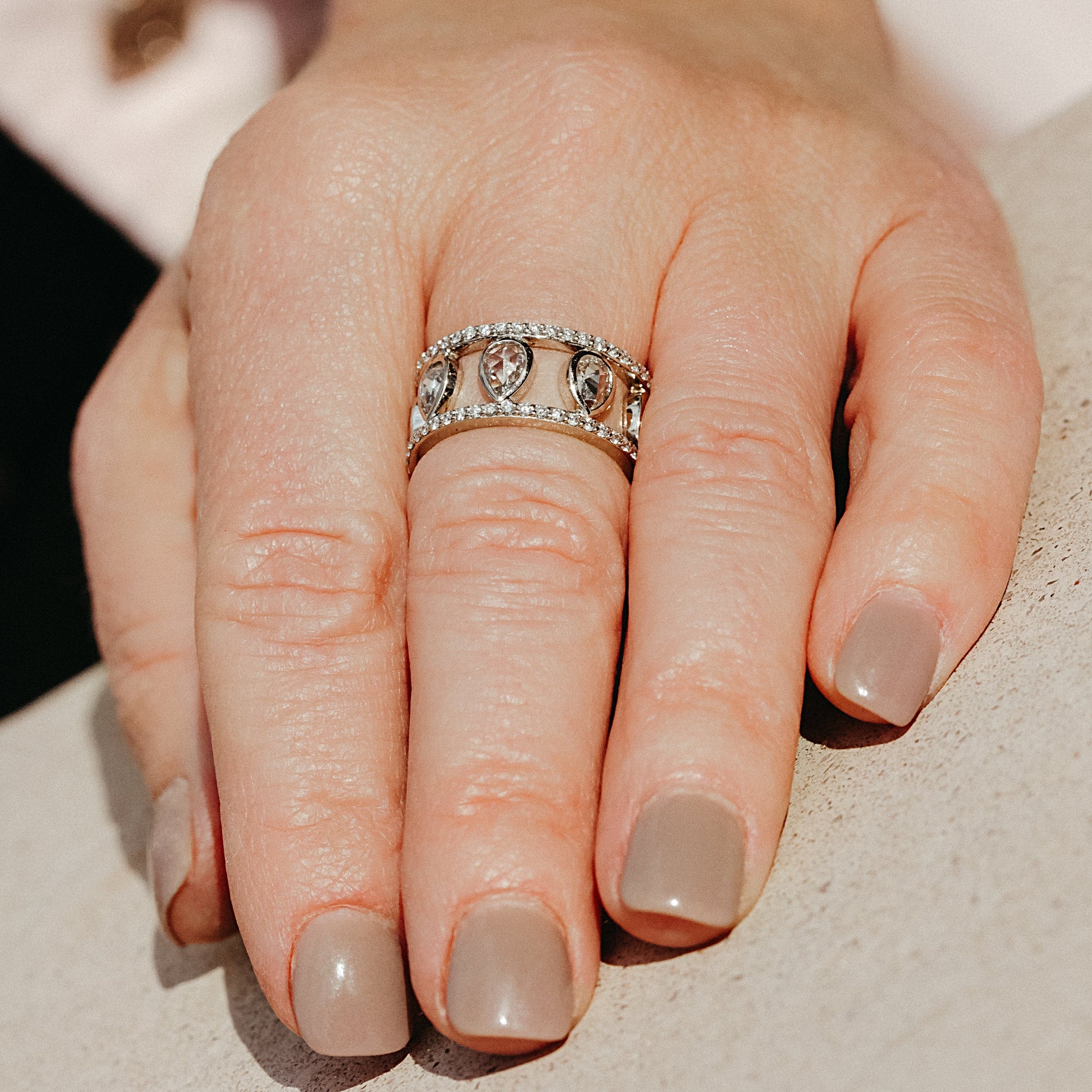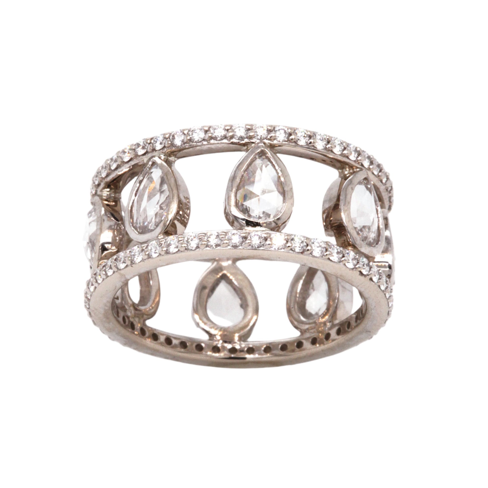 An 18k white gold "Strong Pair" rosecut diamond band set with 1.59 carats of pearshape rose cut diamonds, and .72 carats of round 1.2mm F color VS clarity diamonds. This ring was made and designed by llyn and Sydney Strong.