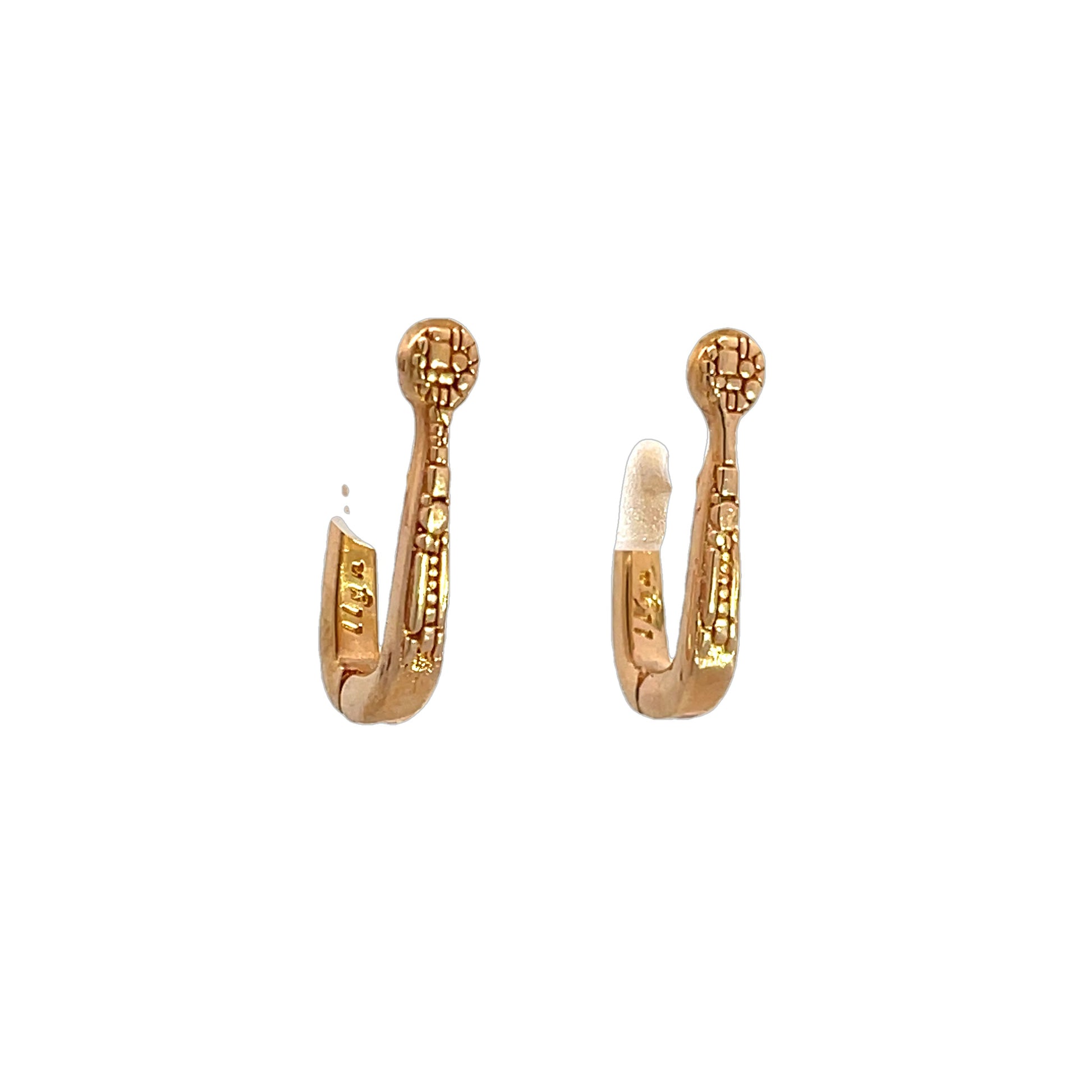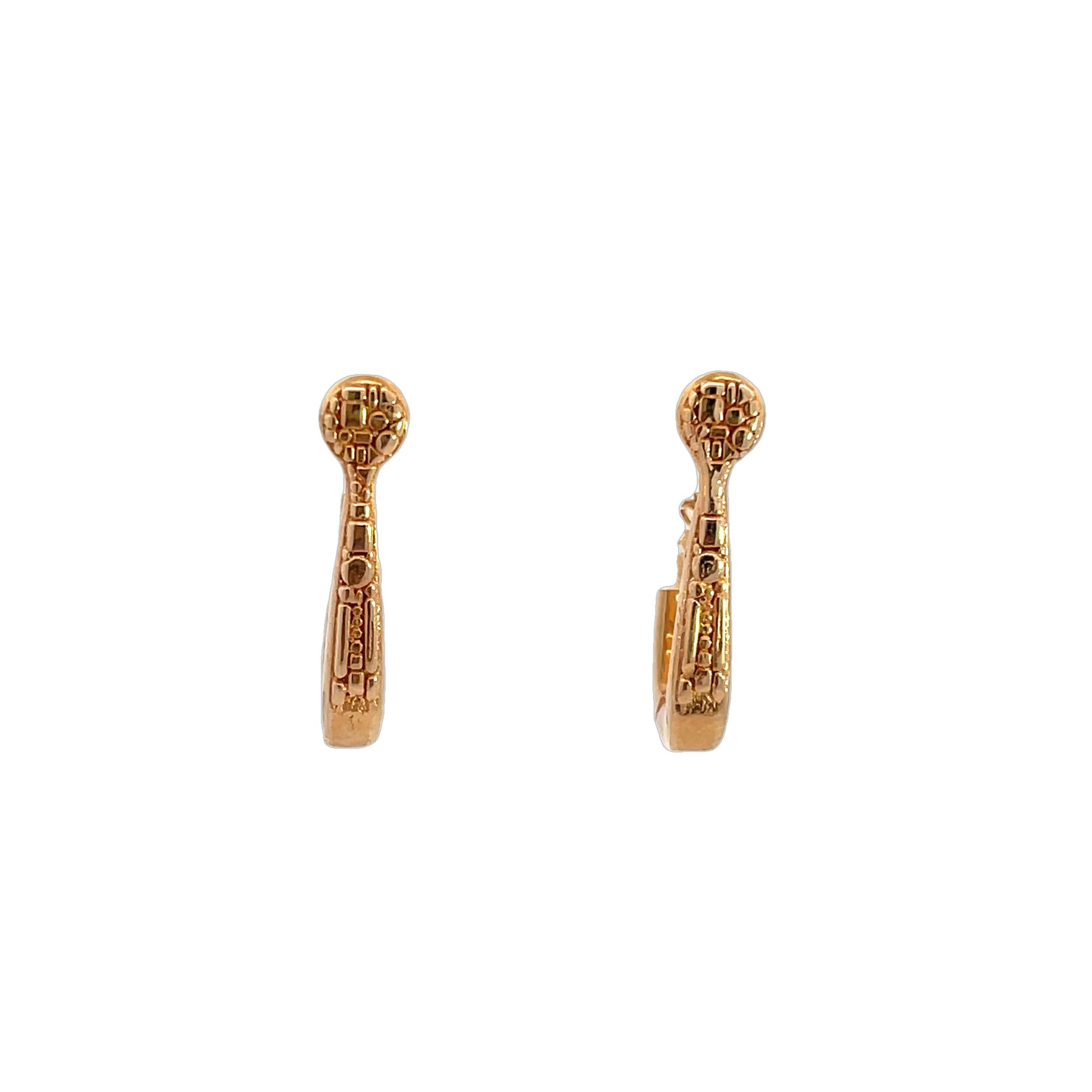 18k rose gold swoop hoops with bits and pieces pattern. These earrings were designed and made by llyn strong.