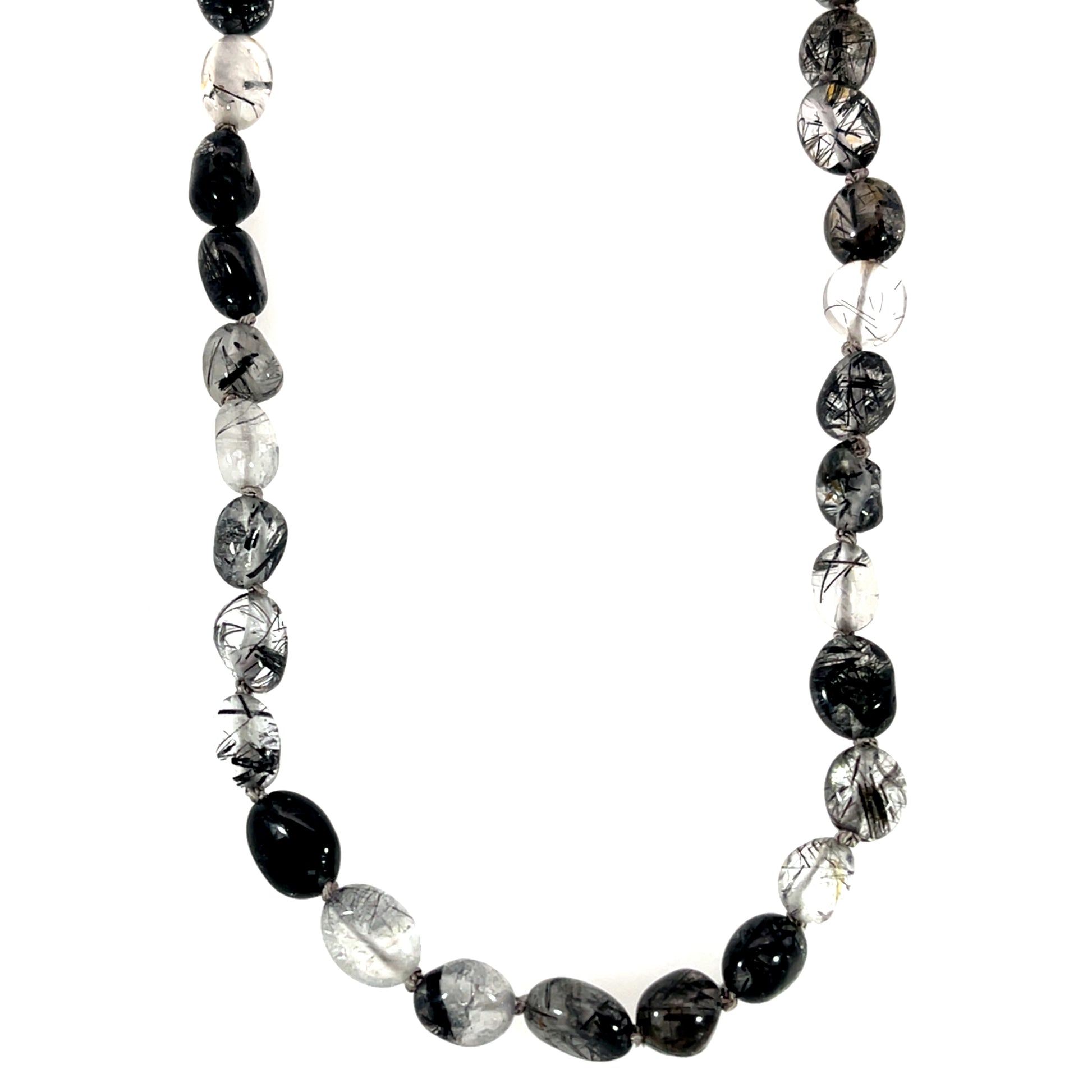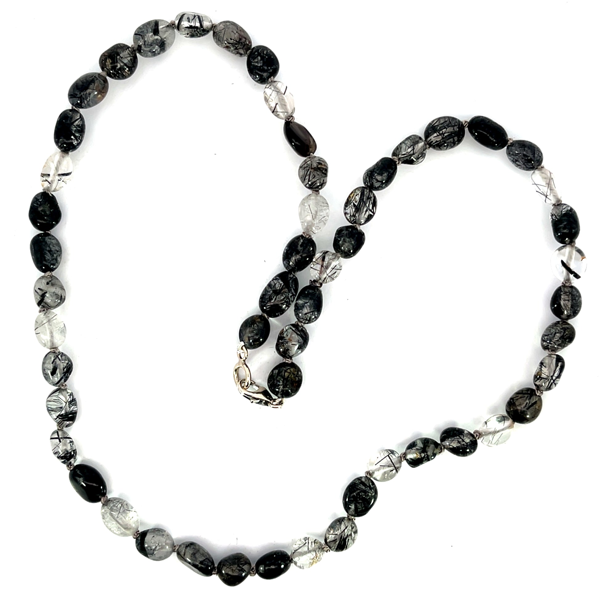 A tourmilated quartz necklace with a white gold clasp. 17" long. This necklace was made and designed by llyn strong.
