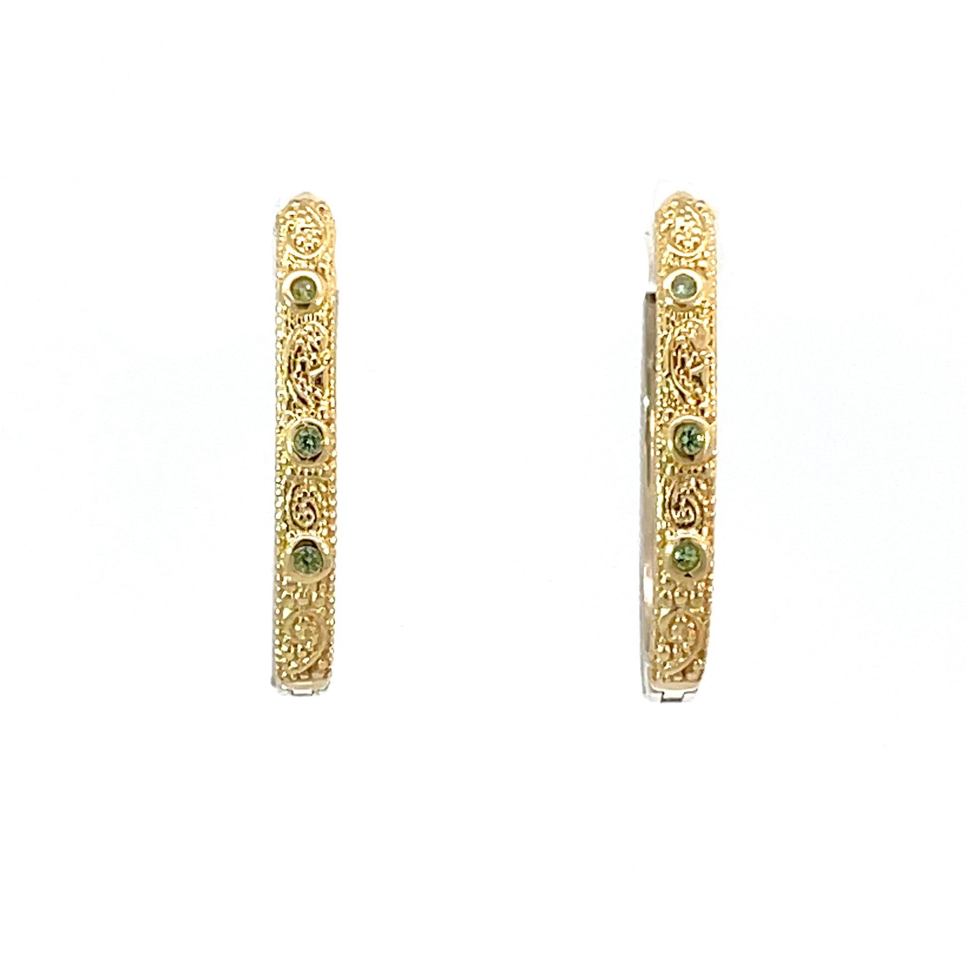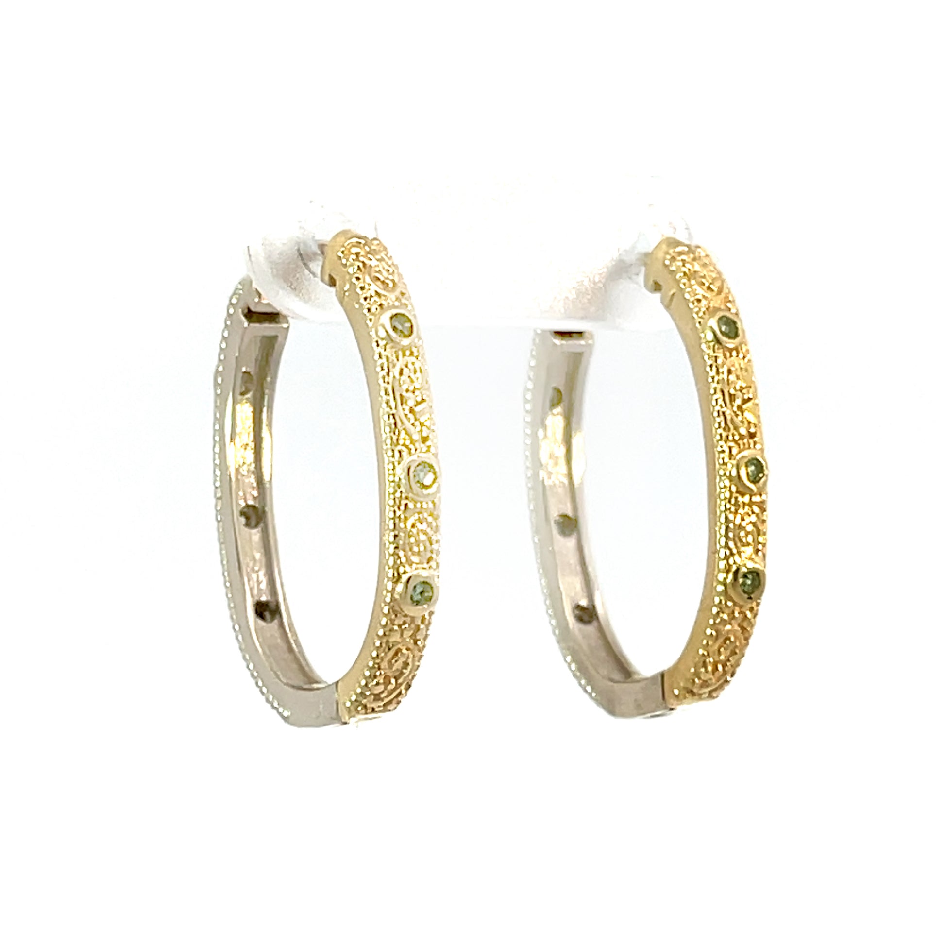 A pair of 18k yellow and white gold reversible llyn-pattern hoops set with .12 carats of 1.2mm tsavorite garnets. These hoops were made and designed by llyn strong.