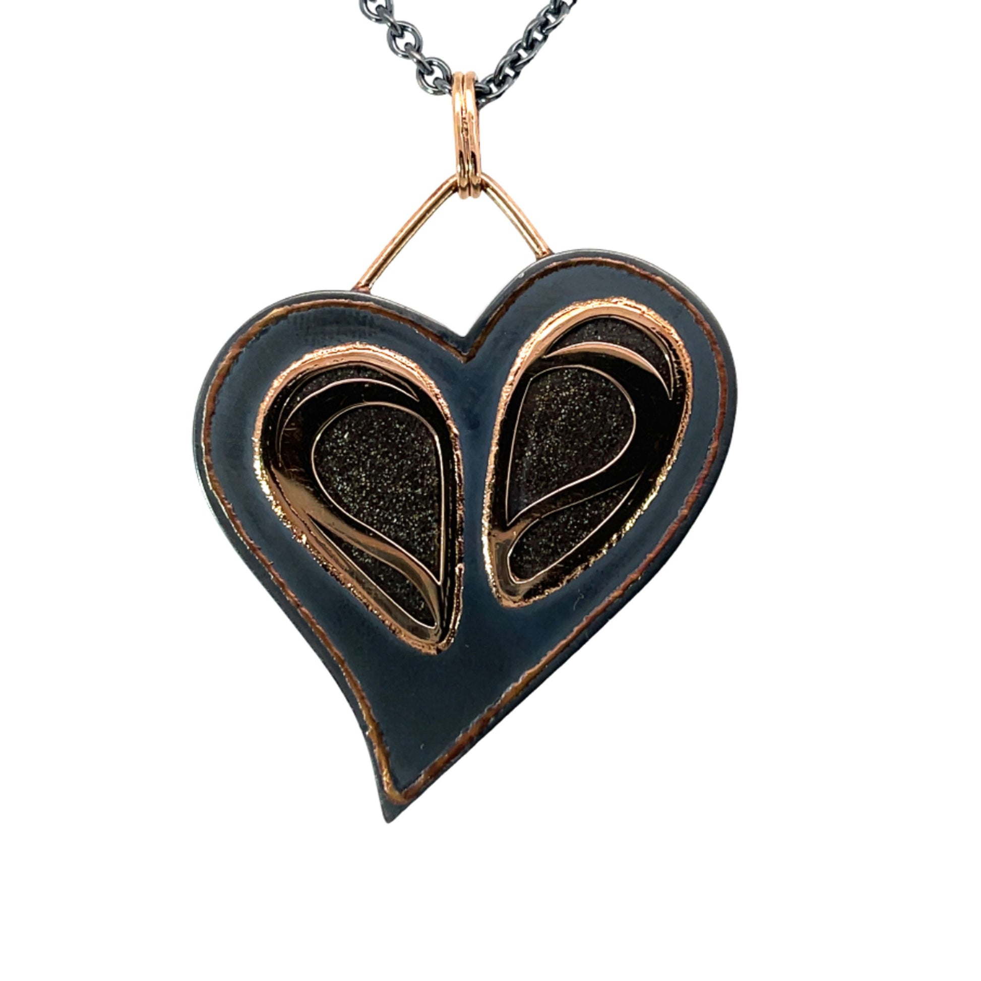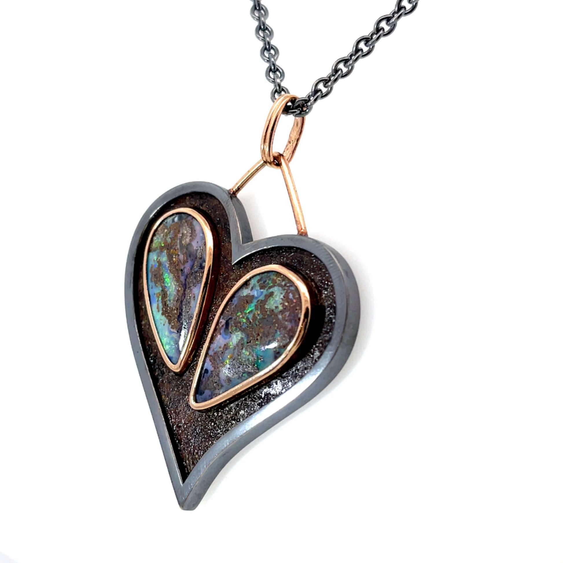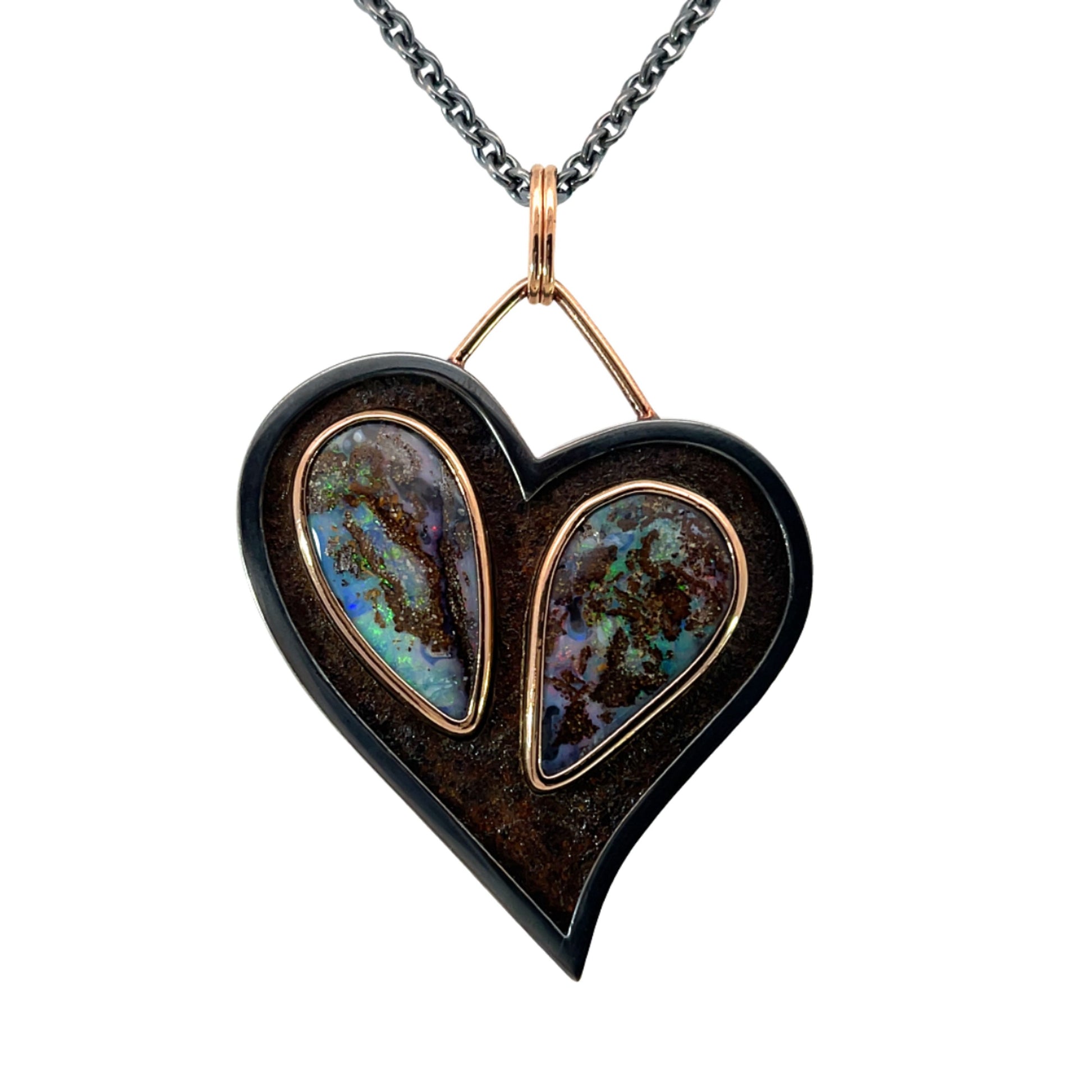 "Two Halves of a Whole" 2024 Unbreakable Heart made with rusted steel and oxidized sterling silver, and two boulder opals (20.19 total carat weight) set in 18k rose gold. This necklace was designed and made by llyn strong.