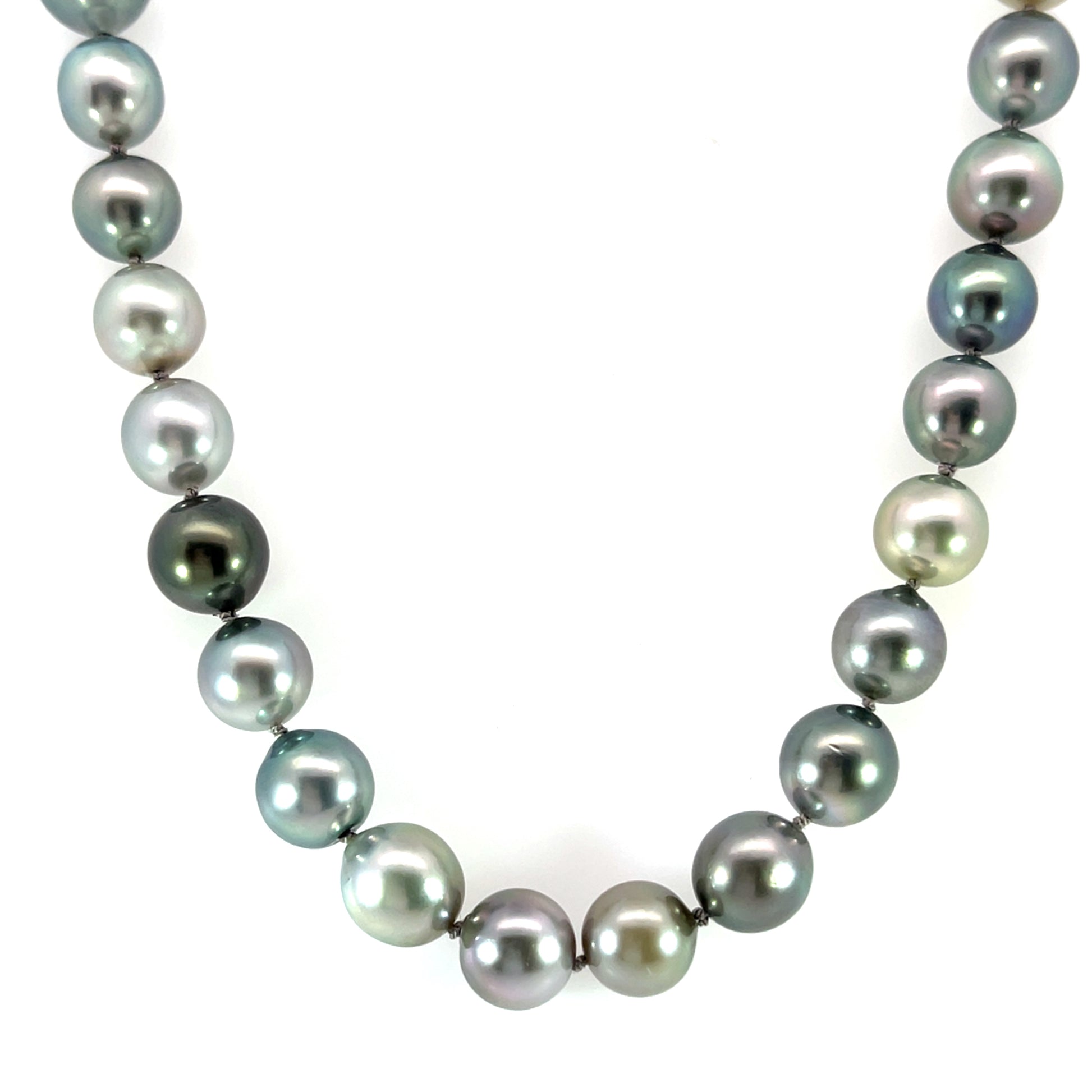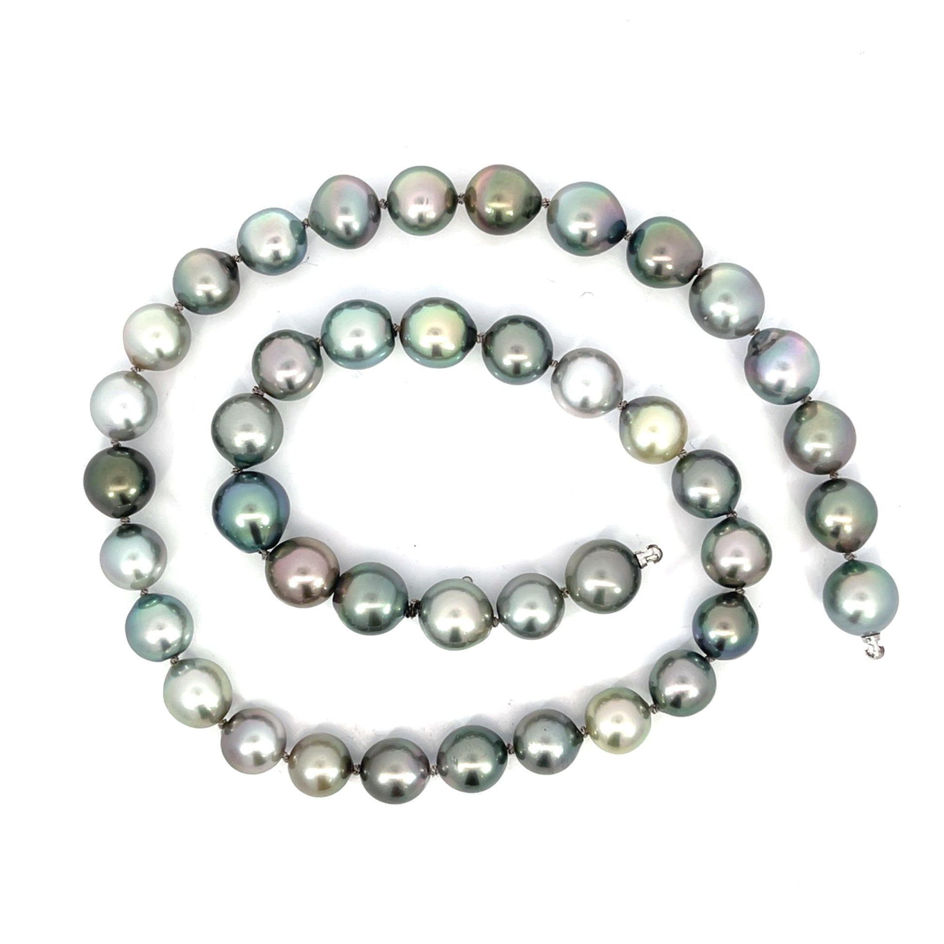 8.5mm-10.5mm 17.5" strand of natural gray multi colored Tahitian pearls with an 18K white gold Modullyn style clasp designed and made by llyn strong.