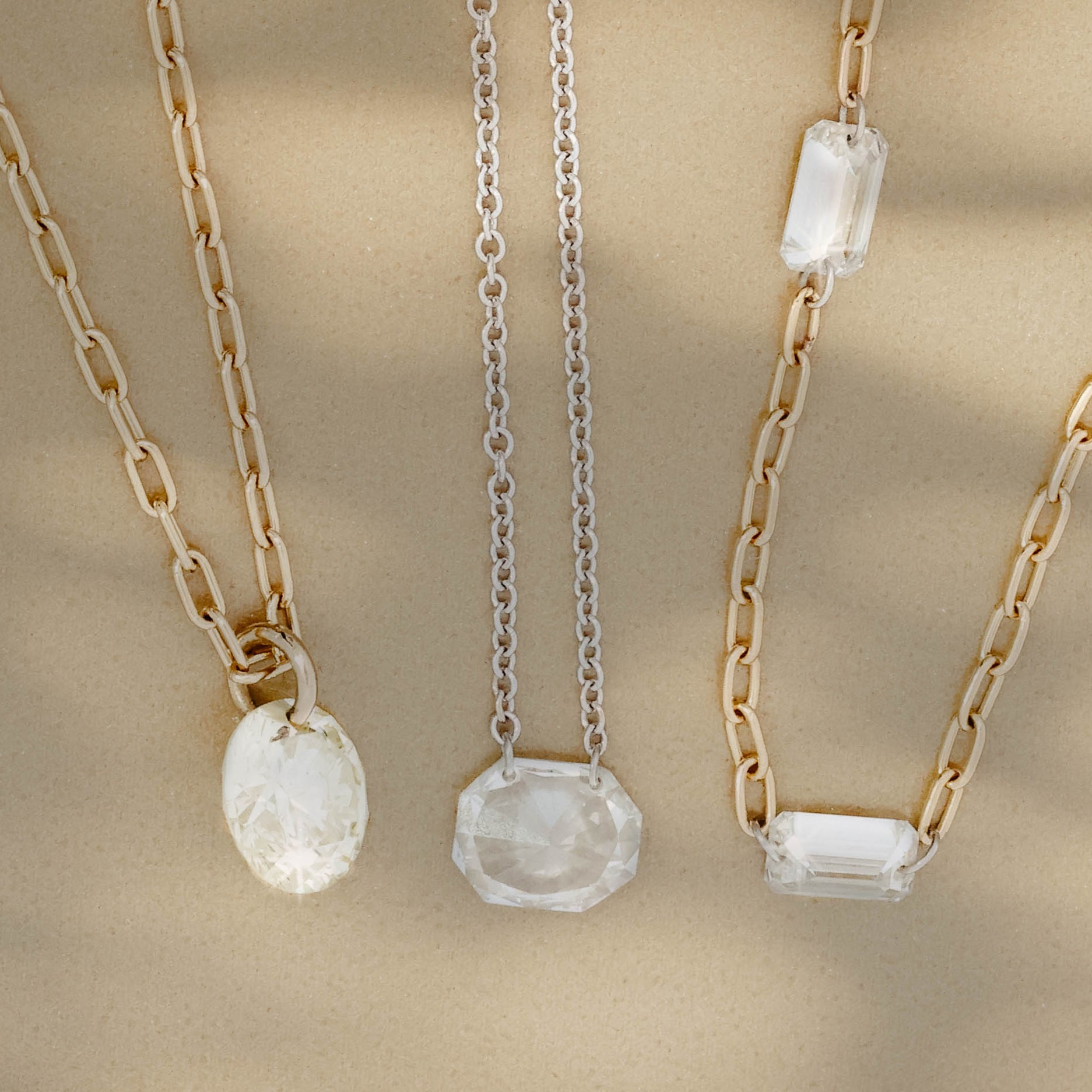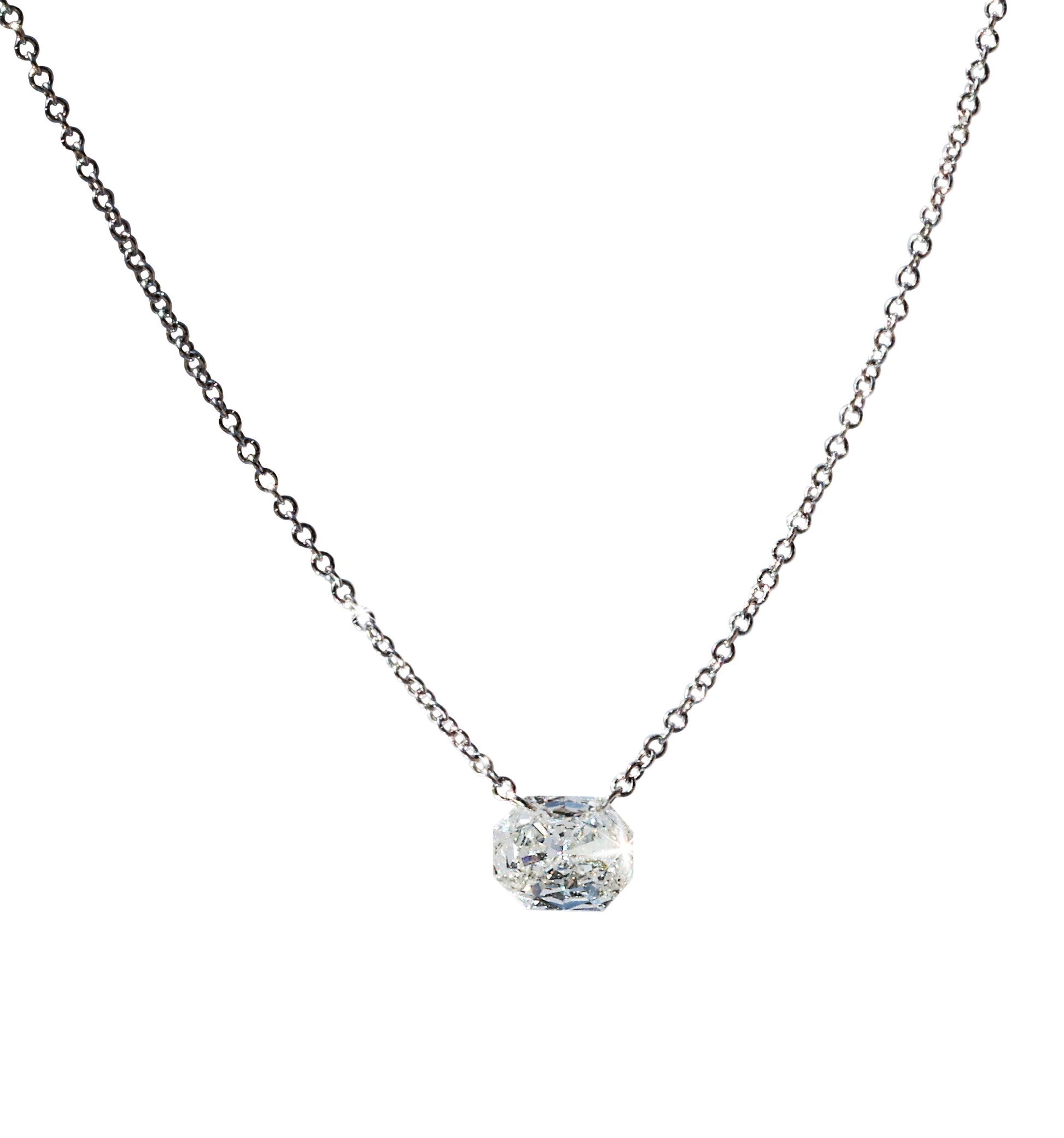 A 14k white gold cable chain necklace with a .62carat octagon cut diamond, E color VS2 clarity, on platinum rings.